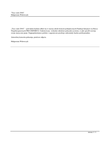 "Tacy sami 2016" Małgorzata Wdowczyk „Tacy sami 2016” – pod takim hasłem odbył się w naszej szkole koncert podopiecznych Fundacji Inicjatyw na Rzecz Niepełnosprawnych PRO OMNIBUS. Utalentowana wokalnie młodzież pokazała uczniom, w jaki sposób rozwija swoje muzyczne pasje. Najpopularniejsze polskie i zagraniczne przeboje zabrzmiały bardzo profesjonalnie. Atmosferę koncertu pokazują poniższe zdjęcia. Małgorzata Wdowczyk strona 1 / 1