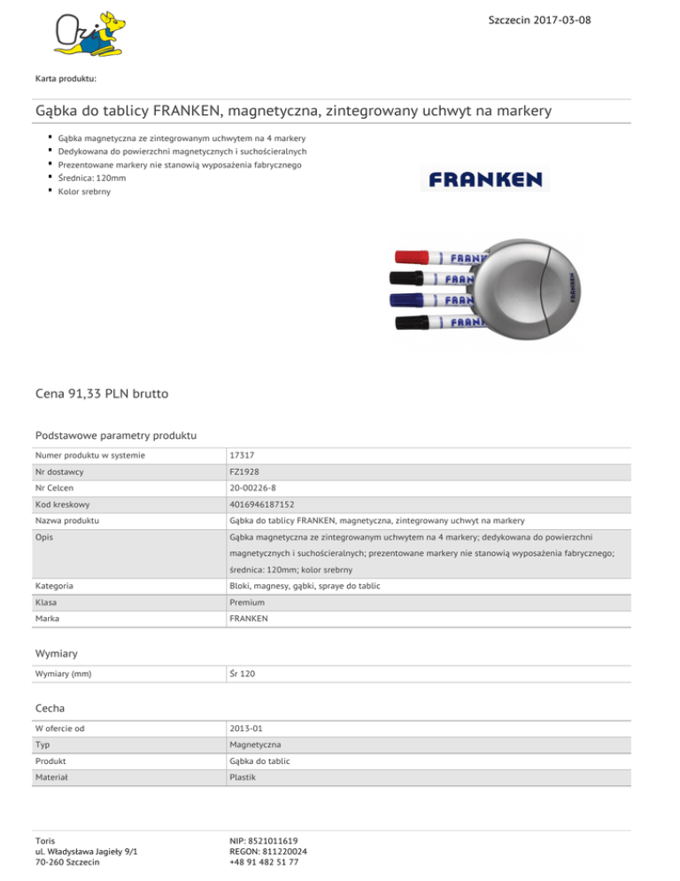 Szczecin 2017-03-08 Karta produktu: Gąbka do tablicy FRANKEN, magnetyczna, zintegrowany uchwyt na markery Gąbka magnetyczna ze zintegrowanym uchwytem na 4 markery Dedykowana do powierzchni magnetycznych i suchościeralnych Prezentowane markery nie stanowią wyposażenia fabrycznego Średnica: 120mm Kolor srebrny Cena 91,33 PLN brutto Podstawowe parametry produktu Numer produktu w systemie 17317 Nr dostawcy FZ1928 Nr Celcen 20-00226-8 Kod kreskowy 4016946187152 Nazwa produktu Gąbka do tablicy FRANKEN, magnetyczna, zintegrowany uchwyt na markery Opis Gąbka magnetyczna ze zintegrowanym uchwytem na 4 markery; dedykowana do powierzchni magnetycznych i suchościeralnych; prezentowane markery nie stanowią wyposażenia fabrycznego; średnica: 120mm; kolor srebrny Kategoria Bloki, magnesy, gąbki, spraye do tablic Klasa Premium Marka FRANKEN Wymiary Wymiary (mm) Śr 120 Cecha W ofercie od 2013-01 Typ Magnetyczna Produkt Gąbka do tablic Materiał Plastik Toris ul. Władysława Jagieły 9/1 70-260 Szczecin NIP: 8521011619 REGON: 811220024 +48 91 482 51 77 Szczecin 2017-03-08 Karta katalogowa produktu cd. Gąbka do tablicy FRANKEN, magnetyczna, zintegrowany uchwyt na markery Wspólny słownik zamówień CPV 30195921-4 Ścieracze do tablic magnetycznych Certyfikaty Ilość lat gwarancji 2 Nowy produkt w ofercie Standard Hit Standard Kolor Kolor Srebrny Serdecznie zapraszamy do współpracy Toris zespół. Toris ul. Władysława Jagieły 9/1 70-260 Szczecin NIP: 8521011619 REGON: 811220024 +48 91 482 51 77