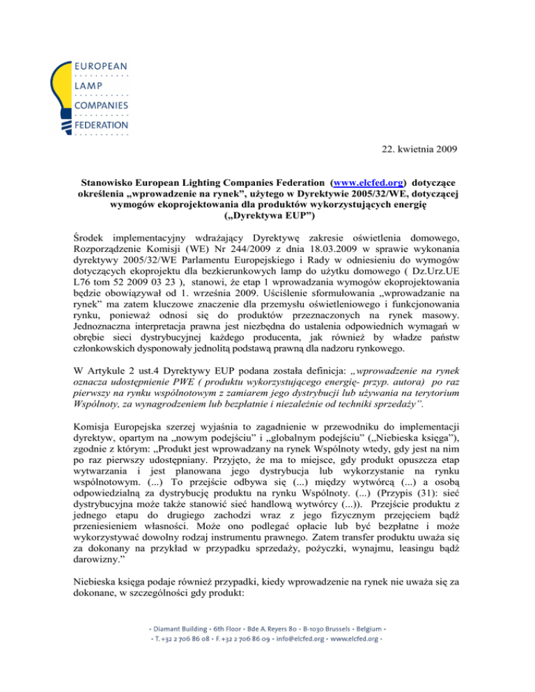 22. kwietnia 2009 Stanowisko European Lighting Companies Federation (www.elcfed.org) dotyczące określenia „wprowadzenie na rynek”, uŜytego w Dyrektywie 2005/32/WE, dotyczącej wymogów ekoprojektowania dla produktów wykorzystujących energię („Dyrektywa EUP”) Środek implementacyjny wdraŜający Dyrektywę zakresie oświetlenia domowego, Rozporządzenie Komisji (WE) Nr 244/2009 z dnia 18.03.2009 w sprawie wykonania dyrektywy 2005/32/WE Parlamentu Europejskiego i Rady w odniesieniu do wymogów dotyczących ekoprojektu dla bezkierunkowych lamp do uŜytku domowego ( Dz.Urz.UE L76 tom 52 2009 03 23 ), stanowi, Ŝe etap 1 wprowadzania wymogów ekoprojektowania będzie obowiązywał od 1. września 2009. Uściślenie sformułowania „wprowadzanie na rynek” ma zatem kluczowe znaczenie dla przemysłu oświetleniowego i funkcjonowania rynku, poniewaŜ odnosi się do produktów przeznaczonych na rynek masowy. Jednoznaczna interpretacja prawna jest niezbędna do ustalenia odpowiednich wymagań w obrębie sieci dystrybucyjnej kaŜdego producenta, jak równieŜ by władze państw członkowskich dysponowały jednolitą podstawą prawną dla nadzoru rynkowego. W Artykule 2 ust.4 Dyrektywy EUP podana została definicja: „wprowadzenie na rynek oznacza udostępnienie PWE ( produktu wykorzystującego energię- przyp. autora) po raz pierwszy na rynku wspólnotowym z zamiarem jego dystrybucji lub uŜywania na terytorium Wspólnoty, za wynagrodzeniem lub bezpłatnie i niezaleŜnie od techniki sprzedaŜy”. Komisja Europejska szerzej wyjaśnia to zagadnienie w przewodniku do implementacji dyrektyw, opartym na „nowym podejściu” i „globalnym podejściu” („Niebieska księga”), zgodnie z którym: „Produkt jest wprowadzany na rynek Wspólnoty wtedy, gdy jest na nim po raz pierwszy udostępniany. Przyjęto, Ŝe ma to miejsce, gdy produkt opuszcza etap wytwarzania i jest planowana jego dystrybucja lub wykorzystanie na rynku wspólnotowym. (...) To przejście odbywa się (...) między wytwórcą (...) a osobą odpowiedzialną za dystrybucję produktu na rynku Wspólnoty. (...) (Przypis (31): sieć dystrybucyjna moŜe takŜe stanowić sieć handlową wytwórcy (...)). Przejście produktu z jednego etapu do drugiego zachodzi wraz z jego fizycznym przejęciem bądź przeniesieniem własności. MoŜe ono podlegać opłacie lub być bezpłatne i moŜe wykorzystywać dowolny rodzaj instrumentu prawnego. Zatem transfer produktu uwaŜa się za dokonany na przykład w przypadku sprzedaŜy, poŜyczki, wynajmu, leasingu bądź darowizny.” Niebieska księga podaje równieŜ przypadki, kiedy wprowadzenie na rynek nie uwaŜa się za dokonane, w szczególności gdy produkt: - - - podlega transferowi od producenta z kraju trzeciego do upowaŜnionego przedstawiciela Wspólnoty, którego wytwórca zatrudnił w celu zapewnienia, Ŝe produkt spełnia wymagania Dyrektywy; podlega transferowi do producenta w celu wykonania dalszych czynności (takich jak montaŜ, pakowanie, obróbka lub etykietowanie); nie został (dotychczas) zwolniony do wolnego obiegu przez słuŜby celne, bądź został przeniesiony do innej procedury celnej (na przykład tranzyt, magazynowanie lub tymczasowy import), lub jest w wolnej strefie; jest wytwarzany w państwie członkowskim, z zamiarem wyeksportowania go do kraju trzeciego; jest prezentowany na targach, wystawach bądź pokazach; lub znajduje się w magazynach producenta lub upowaŜnionego przedstawiciela uznanego przez Wspólnotę i nie jest jeszcze udostępniony, o ile stosowne dyrektywy nie przewidują inaczej. Dalsze wskazówki w kwestii praktycznej interpretacji sformułowania „wprowadzanie na rynek” przedstawiono w poniŜszej interpretacji przemysłu oświetleniowego, uwzględniającej cztery róŜne warianty i wykorzystującej informacje dostępne w Dyrektywie EUP oraz Niebieskiej księdze. 1) Produkty z marką własną sprzedawcy Dyrektywa EUP określa, Ŝe właściciel marki jest uwaŜany za wytwórcę jeśli dany produkt EUP jest wprowadzany na rynek pod nazwą lub znakiem towarowym producenta. Uwzględniając takŜe wymóg art. 3 Dyrektywy EUP mówiący, Ŝe „ produkty EUP podlegające środkom wykonawczym mogą zostać wprowadzone na rynek (...) jedynie, jeŜeli spełniają one warunki określone przez te środki”, oznacza to, Ŝe w trakcie transferu z etapu wytwarzania, o ile produkt nie przechodzi przez inne etapy (np. montaŜ, pakowanie, obróbka bądź etykietowanie) wykonywane w siedzibie lub przez właściciela marki, produkt zostaje wprowadzony na rynek. Wobec tego, jeśli produkt z marką prywatną trafi1 do właściciela marki i wejdzie do jego sieci dystrybucyjnej przed końcowym terminem 1. września 2009, w swojej ostatecznej postaci i opakowaniu, bez etapów dodatkowych (w tym bez wymogu przeprowadzenia oceny zgodności) innych niŜ przygotowanie produktu do wysłania, wykonywanych w siedzibie bądź przez właściciela marki, to produkt jest uznawany za wprowadzony na rynek i moŜe podlegać dalszemu marketingowi właściciela marki. 1 Przejście produktu z jednego etapu do drugiego zachodzi wraz z jego fizycznym przejęciem bądź przeniesieniem własności. 2) Wytwarzanie i magazynowanie w UE Biorąc pod uwagę definicję wprowadzania na rynek zawartą w Dyrektywie EUP oraz zapisy wyjaśniające z Niebieskiej księgi, w naszym rozumieniu produkt końcowy wytwarzany w UE jest uwaŜany za wprowadzony na rynek, kiedy proces wytwórczy zostanie w pełni zakończony (tzn. nie ma potrzeby dodatkowego pakowania, etykietowania czy montaŜu), produkt zostaje przeniesiony z etapu wytwarzania (fizycznie jak i administracyjnie, z zapisem w dokumentach oraz bazie danych producenta) do sieci dystrybucyjnej (niezaleŜnie od tego, czy za dystrybucję produktu jest odpowiedzialny dystrybutor strony trzeciej, czy teŜ komercyjna sieć producenta, np. jego magazyn dystrybucyjny), i wobec tego jest udostępniany i gotowy do transportu. Przygotowanie towar