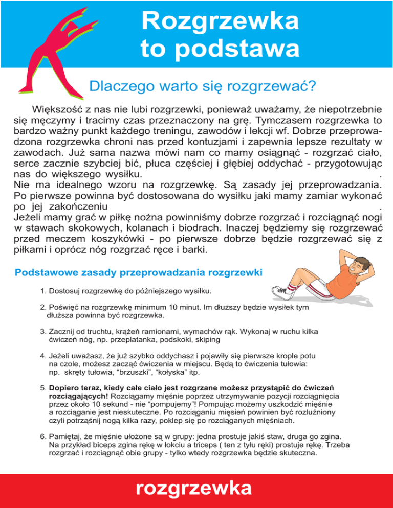Rozgrzewka to podstawa Dlaczego warto siê rozgrzewaæ? Wiêkszoœæ z nas nie lubi rozgrzewki, poniewa¿ uwa¿amy, ¿e niepotrzebnie siê mêczymy i tracimy czas przeznaczony na grê. Tymczasem rozgrzewka to bardzo wa¿ny punkt ka¿dego treningu, zawodów i lekcji wf. Dobrze przeprowadzona rozgrzewka chroni nas przed kontuzjami i zapewnia lepsze rezultaty w zawodach. Ju¿ sama nazwa mówi nam co mamy osi¹gn¹æ - rozgrzaæ cia³o, serce zacznie szybciej biæ, p³uca czêœciej i g³êbiej oddychaæ - przygotowuj¹c nas do wiêkszego wysi³ku. . Nie ma idealnego wzoru na rozgrzewkê. S¹ zasady jej przeprowadzania. Po pierwsze powinna byæ dostosowana do wysi³ku jaki mamy zamiar wykonaæ po jej zakoñczeniu . Je¿eli mamy graæ w pi³kê no¿na powinniœmy dobrze rozgrzaæ i rozci¹gn¹æ nogi w stawach skokowych, kolanach i biodrach. Inaczej bêdziemy siê rozgrzewaæ przed meczem koszykówki - po pierwsze dobrze bêdzie rozgrzewaæ siê z pi³kami i oprócz nóg rozgrzaæ rêce i barki. Podstawowe zasady przeprowadzania rozgrzewki 1. Dostosuj rozgrzewkê do póŸniejszego wysi³ku. 2. Poœwiêæ na rozgrzewkê minimum 10 minut. Im d³u¿szy bêdzie wysi³ek tym d³u¿sza powinna byæ rozgrzewka. 3. Zacznij od truchtu, kr¹¿eñ ramionami, wymachów r¹k. Wykonaj w ruchu kilka æwiczeñ nóg, np. przeplatanka, podskoki, skiping 4. Je¿eli uwa¿asz, ¿e ju¿ szybko oddychasz i pojawi³y siê pierwsze krople potu na czole, mo¿esz zacz¹æ æwiczenia w miejscu. Bêd¹ to æwiczenia tu³owia: np. skrêty tu³owia, “brzuszki”, “ko³yska” itp. 5. Dopiero teraz, kiedy ca³e cia³o jest rozgrzane mo¿esz przyst¹piæ do æwiczeñ rozci¹gaj¹cych! Rozci¹gamy miêœnie poprzez utrzymywanie pozycji rozci¹gniêcia przez oko³o 10 sekund - nie “pompujemy”! Pompuj¹c mo¿emy uszkodziæ miêœnie a rozci¹ganie jest nieskuteczne. Po rozci¹ganiu miêsieñ powinien byæ rozluŸniony czyli potrz¹œnij nog¹ kilka razy, poklep siê po rozci¹ganych miêœniach. 6. Pamiêtaj, ¿e miêœnie u³o¿one s¹ w grupy: jedna prostuje jakiœ staw, druga go zgina. Na przyk³ad biceps zgina rêkê w ³okciu a triceps ( ten z ty³u rêki) prostuje rêkê. Trzeba rozgrzaæ i rozci¹gn¹æ obie grupy - tylko wtedy rozgrzewka bêdzie skuteczna. rozgrzewka