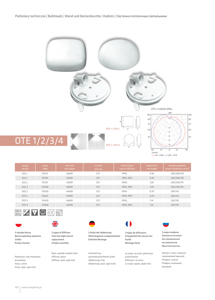 Plafoniery techniczne Bulkheads Wand und Deckenleuchte Hublots Настенно-потолочные светильники OTE 3 1x60W OPAL 180° 105° BC OTE 1 / OTE 2 OTE 1/2/3/4 A CB 105° 90° 90° 75° 75° 60° 60° 45° 45° OTE 3 / OTE 4 30° 15° cd/klm CO - C180 0° 15° 30° C9O - C270 waga netto net weight wymiary produktu product dimensions A/B/C OPAL 0,95 200/200/110 OPAL MAT 0,95 200/200/110 E27 OPAL 1,05 250/250/110 1x60W E27 OPAL MAT 1,05 250/250/110 1x60W E27 OPAL 0,79 200/110 151347 1x60W E27 OPAL MAT 0,79 200/110 OTE 4 151439 1x60W E27 OPAL 1,14 250/110 OTE 4 151446 1x60W E27 OPAL MAT 1,14 250/110 wersja version index index max moc max power trzonek end cap OTE 1 151132 1x60W E27 OTE 1 151149 1x60W E27 OTE 2 151231 1x60W OTE 2 151248 OTE 3 151330 OTE 3 rodzaj klosza type of diffuser 8 2 rodzaje klosza Beznarzędziowa wymiana źródła Prosty montaż Podstawa: stal malowana proszkowo Klosz: szkło Klosz: opal, opal mat 292 www.lenalighting.pl 2 types of Diffuser Tool-less light source replacement Simple assembly 2 Arten der Abdeckung Werkzeugloser Lampenwechsel Einfache Montage 2 types de diffuseurs Changement de source tres facille Montage facile 2 вида плафона Замена источника без применения инструментов Простой монтаж Base: powder coated steel Diffuser: glass Diffuser: opal, opal mat Unterteil aus pulverbeschichtetem Stahl Abdeckung: Glas Abdeckung: opal, opal matt Le corps: en acier, peinte par pulvérisation Diffuseur: en verre Le corps: opale, opale mat Корпус: сталь, покрыта порошковой краской Плафон: стекло Плафон: опаловый, матовый
