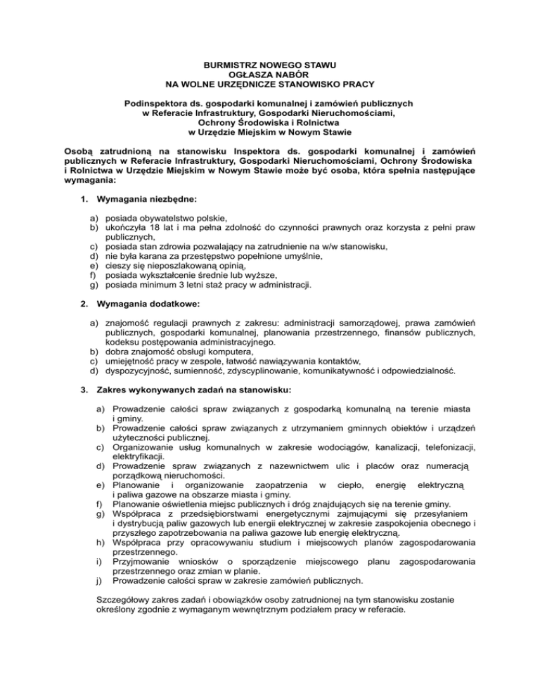 BURMISTRZ NOWEGO STAWU OGŁASZA NABÓR NA WOLNE URZĘDNICZE STANOWISKO PRACY Podinspektora ds. gospodarki komunalnej i zamówień publicznych w Referacie Infrastruktury, Gospodarki Nieruchomościami, Ochrony Środowiska i Rolnictwa w Urzędzie Miejskim w Nowym Stawie Osobą zatrudnioną na stanowisku Inspektora ds. gospodarki komunalnej i zamówień publicznych w Referacie Infrastruktury, Gospodarki Nieruchomościami, Ochrony Środowiska i Rolnictwa w Urzędzie Miejskim w Nowym Stawie może być osoba, która spełnia następujące wymagania: 1. Wymagania niezbędne: a) posiada obywatelstwo polskie, b) ukończyła 18 lat i ma pełna zdolność do czynności prawnych oraz korzysta z pełni praw publicznych, c) posiada stan zdrowia pozwalający na zatrudnienie na w/w stanowisku, d) nie była karana za przestępstwo popełnione umyślnie, e) cieszy się nieposzlakowaną opinią, f) posiada wykształcenie średnie lub wyższe, g) posiada minimum 3 letni staż pracy w administracji. 2. Wymagania dodatkowe: a) znajomość regulacji prawnych z zakresu: administracji samorządowej, prawa zamówień publicznych, gospodarki komunalnej, planowania przestrzennego, finansów publicznych, kodeksu postępowania administracyjnego. b) dobra znajomość obsługi komputera, c) umiejętność pracy w zespole, łatwość nawiązywania kontaktów, d) dyspozycyjność, sumienność, zdyscyplinowanie, komunikatywność i odpowiedzialność. 3. Zakres wykonywanych zadań na stanowisku: a) Prowadzenie całości spraw związanych z gospodarką komunalną na terenie miasta i gminy. b) Prowadzenie całości spraw związanych z utrzymaniem gminnych obiektów i urządzeń użyteczności publicznej. c) Organizowanie usług komunalnych w zakresie wodociągów, kanalizacji, telefonizacji, elektryfikacji. d) Prowadzenie spraw związanych z nazewnictwem ulic i placów oraz numeracją porządkową nieruchomości. e) Planowanie i organizowanie zaopatrzenia w ciepło, energię elektryczną i paliwa gazowe na obszarze miasta i gminy. f) Planowanie oświetlenia miejsc publicznych i dróg znajdujących się na terenie gminy. g) Współpraca z przedsiębiorstwami energetycznymi zajmującymi się przesyłaniem i dystrybucją paliw gazowych lub energii elektrycznej w zakresie zaspokojenia obecnego i przyszłego zapotrzebowania na paliwa gazowe lub energię elektryczną. h) Współpraca przy opracowywaniu studium i miejscowych planów zagospodarowania przestrzennego. i) Przyjmowanie wniosków o sporządzenie miejscowego planu zagospodarowania przestrzennego oraz zmian w planie. j) Prowadzenie całości spraw w zakresie zamówień publicznych. Szczegółowy zakres zadań i obowiązków osoby zatrudnionej na tym stanowisku zostanie określony zgodnie z wymaganym wewnętrznym podziałem pracy w referacie. 4. Wymagane dokumenty: a) życiorys (CV) wraz ze zdjęciem b) list motywacyjny c) dokument poświadczający wykształcenie /dyplom lub zaświadczenie o stanie odbytych studiów/ d) dokumenty potwierdzające wymagany staż pracy e) kwestionariusz osobowy f) inne dodatkowe dokumenty o posiadanych kwalifikacjach i umiejętnościach g) oświadczenie, że kandydat nie był karany za przestępstwo popełnione umyślnie oraz, że nie toczy się przeciwko niemu postępowanie karne, h) oświadczenie kandydata, że posiada pełną zdolność do czynności prawnych oraz korzystania z pełni praw publicznych, i) oświadczenie o wyrażeniu zgody na przetwarzanie danych osobowych do celów rekrutacji. 5. Sposób i termin składania ofert Oferty należy składać w zamkniętych kopertach z dopiskiem „Konkurs na stanowisko Podinspektora (gospodarka komunalna i zamówienia publiczne)” w sekretariacie Urzędu Miejskiego w Nowym Stawie w pokoju nr 9 lub przesłać pocztą na adres: Urząd Miejski ul. Bema 1, 82-230 Nowy Staw w terminie do dnia 27 grudnia 2007 roku do godz. 15.00. Aplikacje, które wpłyną do Urzędu Miejskiego po wskazanym terminie nie będą rozpatrywane. 6. Inne informacje Nabór przeprowadzi komisja rekrutacyjna powołana przez Burmistrza Miasta Nowy Staw. Lista kandydatów, którzy spełnili wymagania formalne i tym samym zakwalifikowali się do dalszego postępowania zostanie ogłoszona w Biuletynie Informacji Publicznej. O terminie i miejscu przeprowadzenia postępowania kwalifikacyjnego kandydaci zostaną powiadomieni indywidualnie. Dodatkowe informacje można uzyskać pod nr tel. 271-51-10 w. 25. Wymagane dokumenty aplikacyjne: list motywacyjny, szczegółowe CV (z uwzględnieniem dokłądnego przebiegu kariery zawodowej), powinny być opatrzone klauzulą: "Wyrażam zgodę na przetwarzanie moich danych osobowych zawartych w ofercie pracy dla potrzeb niezbędnych do realizacji procesu rekrutacji zgodnie z Ustawą z dnia 29.08.1997 o ochronie danych osobowych (Dz. U. z 2002 r. Nr 101, poz. 926) oraz Ustawą z dn. 22.03.1999 r. o pracownikach samorządowych ( Dz. U. z 2001 r. Nr 142, poz. 1593 z późniejszymi zmianami)". Nowy Staw, dnia 06.12.2007 r. Burmistrz Jerzy Szałach