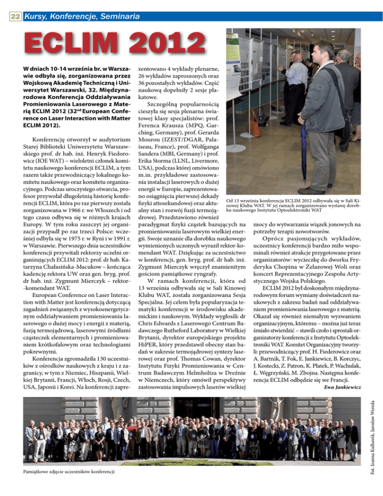 22 Kursy, Konferencje, Seminaria ECLIM 2012 Konferencję otworzył w audytorium Starej Biblioteki Uniwersytetu Warszawskiego prof. dr hab. inż. Henryk Fiedorowicz (IOE WAT) – wieloletni członek komitetu naukowego konferencji ECLIM, a tym razem także przewodniczący lokalnego komitetu naukowego oraz komitetu organizacyjnego. Podczas uroczystego otwarcia, profesor przywołał długoletnią historię konferencji ECLIM, która po raz pierwszy została zorganizowana w 1966 r. we Włoszech i od tego czasu odbywa się w różnych krajach Europy. W tym roku zaszczyt jej organizacji przypadł po raz trzeci Polsce: wcześniej odbyła się w 1975 r. w Ryni i w 1991 r. w Warszawie. Pierwszego dnia uczestników konferencji przywitali rektorzy uczelni organizujących ECLIM 2012: prof. dr hab. Katarzyna Chałasińska-Macukow – kończąca kadencję rektora UW oraz gen. bryg. prof. dr hab. inż. Zygmunt Mierczyk – rektor-komendant WAT. European Conference on Laser Interaction with Matter jest konferencją dotyczącą zagadnień związanych z wysokoenergetycznym oddziaływaniem promieniowania laserowego o dużej mocy i energii z materią, fuzją termojądrową, laserowymi źródłami cząsteczek elementarnych i promieniowaniem krótkofalowym oraz technologiami pokrewnymi. Konferencja zgromadziła 130 uczestników z ośrodków naukowych z kraju i z zagranicy, w tym z Niemiec, Hiszpanii, Wielkiej Brytanii, Francji, Włoch, Rosji, Czech, USA, Japonii i Korei. Na konferencji zapre- Pamiątkowe zdjęcie uczestników konferencji zentowano 4 wykłady plenarne, 26 wykładów zaproszonych oraz 36 pozostałych wykładów. Część naukową dopełniły 2 sesje plakatowe. Szczególną popularnością cieszyła się sesja plenarna światowej klasy specjalistów: prof. Ferenca Krausza (MPQ, Garching, Germany), prof. Gerarda Mourou (IZEST/DGAR, Palaiseau, France), prof. Wolfganga Sandera (MBI, Germany) i prof. Erika Storma (LLNL, Livermore, USA), podczas której omówiono m.in. przykładowe zastosowania instalacji laserowych o dużej energii w Europie, zaprezentowano osiągnięcia pierwszej dekady 13 września konferencja ECLIM 2012 odbywała się w Sali Kifizyki attosekundowej oraz aktu- Od nowej Klubu WAT. W jej ramach zorganizowano wystawę dorobalny stan i rozwój fuzji termoją- ku naukowego Instytutu Optoelektroniki WAT drowej. Przedstawiono również paradygmat fizyki cząstek bazujących na mocy do wytwarzania wiązek jonowych na promieniowaniu laserowym wielkiej ener- potrzeby terapii nowotworów. gii. Swoje uznanie dla dorobku naukowego Oprócz pasjonujących wykładów, wymienionych uczonych wyraził rektor-ko- uczestnicy konferencji bardzo miło wspomendant WAT. Dziękując za uczestnictwo minali również atrakcje przygotowane przez w konferencji, gen. bryg. prof. dr hab. inż. organizatorów: wycieczkę do dworku FryZygmunt Mierczyk wręczył znamienitym deryka Chopina w Żelazowej Woli oraz gościom pamiątkowe ryngrafy. koncert Reprezentacyjnego Zespołu ArtyW ramach konferencji, która od stycznego Wojska Polskiego. 13 września odbywała się w Sali Kinowej ECLIM 2012 był doskonałym międzynaKlubu WAT, została zorganizowana Sesja rodowym forum wymiany doświadczeń naSpecjalna. Jej celem była popularyzacja te- ukowych z zakresu badań nad oddziaływamatyki konferencji w środowisku akade- niem promieniowania laserowego z materią. mickim i naukowym. Wykłady wygłosili: dr Okazał się również niemałym wyzwaniem Chris Edwards z Laserowego Centrum Ba- organizacyjnym, któremu – można już teraz dawczego Rutheford Laboratory w Wielkiej śmiało stwierdzić – stawili czoło i sprostali orBrytanii, dyrektor europejskiego projektu ganizatorzy konferencji z Instytutu OptoelekHiPER, który przedstawił obecny stan ba- troniki WAT. Komitet Organizacyjny tworzydań w zakresie termojądrowej syntezy lase- li: przewodniczący prof. H. Fiederowicz oraz rowej oraz prof. Thomas Cowan, dyrektor A. Bartnik, T. Fok, E. Jankiewicz, B. Korczyc, Instytutu Fizyki Promieniowania w Cen- J. Kostecki, Z. Patron, K. Płatek, P. Wachulak, trum Badawczym Helmholtza w Dreźnie Ł. Węgrzyński, M. Zbojna. Następna konfew Niemczech, który omówił perspektywy rencja ECLIM odbędzie się we Francji. zastosowania impulsowych laserów wielkiej Ewa Jankiewicz Fot. Joanna Kulhawik, Jarosław Wereda W dniach 10-14 września br. w Warszawie odbyła się, zorganizowana przez Wojskową Akademię Techniczną i Uniwersytet Warszawski, 32. Międzynarodowa Konferencja Oddziaływania Promieniowania Laserowego z Materią ECLIM 2012 (32nd European Conference on Laser Interaction with Matter ECLIM 2012).