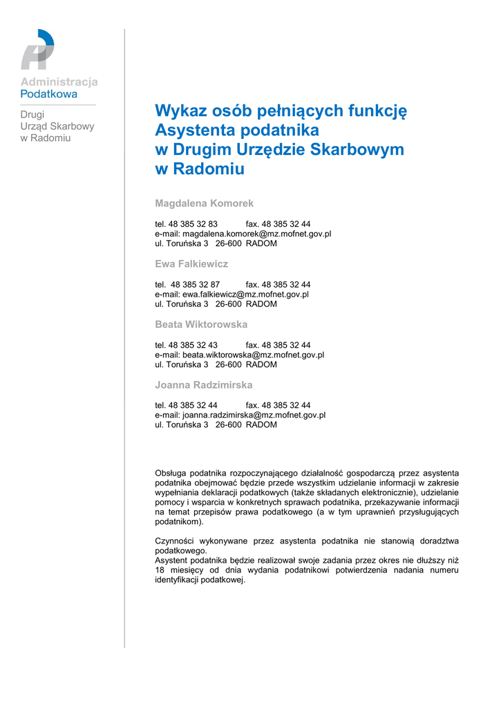 Drugi Urząd Skarbowy w Radomiu Wykaz osób pełniących funkcję Asystenta podatnika w Drugim Urzędzie Skarbowym w Radomiu Magdalena Komorek tel. 48 385 32 83 fax. 48 385 32 44 e-mail: [email protected] ul. Toruńska 3 26-600 RADOM Ewa Falkiewicz tel. 48 385 32 87 fax. 48 385 32 44 e-mail: [email protected] ul. Toruńska 3 26-600 RADOM Beata Wiktorowska tel. 48 385 32 43 fax. 48 385 32 44 e-mail: [email protected] ul. Toruńska 3 26-600 RADOM Joanna Radzimirska tel. 48 385 32 44 fax. 48 385 32 44 e-mail: [email protected] ul. Toruńska 3 26-600 RADOM Obsługa podatnika rozpoczynającego działalność gospodarczą przez asystenta podatnika obejmować będzie przede wszystkim udzielanie informacji w zakresie wypełniania deklaracji podatkowych (także składanych elektronicznie), udzielanie pomocy i wsparcia w konkretnych sprawach podatnika, przekazywanie informacji na temat przepisów prawa podatkowego (a w tym uprawnień przysługujących podatnikom). Czynności wykonywane przez asystenta podatnika nie stanowią doradztwa podatkowego. Asystent podatnika będzie realizował swoje zadania przez okres nie dłuższy niż 18 miesięcy od dnia wydania podatnikowi potwierdzenia nadania numeru identyfikacji podatkowej.