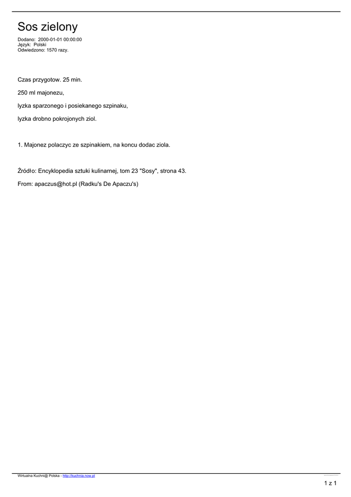 Sos zielony Dodano: 2000-01-01 00:00:00 Język: Polski Odwiedzono: 1570 razy. Czas przygotow. 25 min. 250 ml majonezu, lyzka sparzonego i posiekanego szpinaku, lyzka drobno pokrojonych ziol. 1. Majonez polaczyc ze szpinakiem, na koncu dodac ziola. Źródło: Encyklopedia sztuki kulinarnej, tom 23 "Sosy", strona 43. From: [email protected] (Radku's De Apaczu's) Wirtualna Kuchni@ Polska - http://kuchnia.now.pl przepis nr 6041, plik wygenerowano 2017.03.08 19:41 1z1