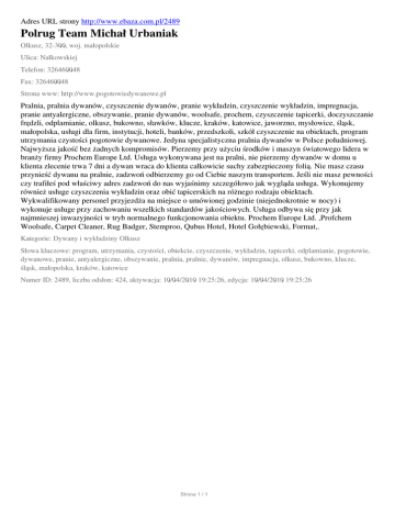 Adres URL strony http://www.ebaza.com.pl/2489 Polrug Team Michał Urbaniak Olkusz, 32-300, woj. małopolskie Ulica: Nałkowskiej Telefon: 326460048 Fax: 326460048 Strona www: http://www.pogotowiedywanowe.pl Pralnia, pralnia dywanów, czyszczenie dywanów, pranie wykładzin, czyszczenie wykładzin, impregnacja, pranie antyalergiczne, obszywanie, pranie dywanów, woolsafe, prochem, czyszczenie tapicerki, doczyszczanie frędzli, odplamianie, olkusz, bukowno, sławków, klucze, kraków, katowice, jaworzno, mysłowice, śląsk, małopolska, usługi dla firm, instytucji, hoteli, banków, przedszkoli, szkół czyszczenie na obiektach, program utrzymania czystości pogotowie dywanowe. Jedyna specjalistyczna pralnia dywanów w Polsce południowej. Najwyższa jakość bez żadnych kompromisów. Pierzemy przy użyciu środków i maszyn światowego lidera w branży firmy Prochem Europe Ltd. Usługa wykonywana jest na pralni, nie pierzemy dywanów w domu u klienta zlecenie trwa 7 dni a dywan wraca do klienta całkowicie suchy zabezpieczony folią. Nie masz czasu przynieść dywanu na pralnie, zadzwoń odbierzemy go od Ciebie naszym transportem. Jeśli nie masz pewności czy trafiłeś pod właściwy adres zadzwoń do nas wyjaśnimy szczegółowo jak wygląda usługa. Wykonujemy również usługe czyszczenia wykładzin oraz obić tapicerskich na różnego rodzaju obiektach. Wykwalifikowany personel przyjezdża na miejsce o umówionej godzinie (niejednokrotnie w nocy) i wykonuje usługe przy zachowaniu wszelkich standardów jakościowych. Usługa odbywa się przy jak najmnieszej inwazyjności w tryb normalnego funkcjonowania obiektu. Prochem Europe Ltd. ,Profchem Woolsafe, Carpet Cleaner, Rug Badger, Stemproo, Qubus Hotel, Hotel Gołębiewski, Format,. Kategorie: Dywany i wykładziny Olkusz Słowa kluczowe: program, utrzymania, czystości, obiekcie, czyszczenie, wykładzin, tapicerki, odplamianie, pogotowie, dywanowe, pranie, antyalergiczne, obszywanie, pralnia, pralnie, dywanów, impregnacja, olkusz, bukowno, klucze, śląsk, małopolska, kraków, katowice Numer ID: 2489, liczba odsłon: 424, aktywacja: 10/04/2010 19:25:26, edycja: 10/04/2010 19:25:26 Strona 1 / 1
