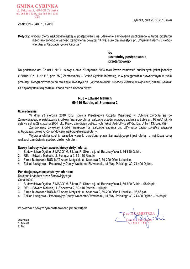 Cybinka, dnia 26.08.2010 roku Znak: ON – 340 / 10 / 2010 Dotyczy: wyboru oferty najkorzystniejszej w postępowaniu na udzielenie zamówienia publicznego w trybie przetargu nieograniczonego o wartości zamówienia powyżej 14 tyś. euro dla inwestycji pn. „Wymiana dachu świetlicy wiejskiej w Rąpicach, gmina Cybinka” do uczestnicy postępowania przetargowego Na podstawie art. 92 ust.1 pkt 1 ustawy z dnia 29 stycznia 2004 roku Prawo zamówień publicznych (tekst jednolity z 2010r., Dz. U. Nr 113, poz. 759) Zamawiający – Gmina Cybinka informuję, iż w postępowaniu prowadzonym w trybie przetargu nieograniczonego na realizację inwestycji pn. „Wymiana dachu świetlicy wiejskiej w Rąpicach, gmina Cybinka” za najkorzystniejszą została uznana oferta złożona przez: REJ – Edward Makuch 69-110 Rzepin, ul. Słoneczna 2 Uzasadnienie: W dniu 23 sierpnia 2010 roku Komisja Przetargowa Urzędu Miejskiego w Cybince zwróciła się do Zamawiającego o zwiększenie środków finansowych na realizację przedmiotowego zadania w trybie art. 93 ust.1 pkt 4) ustawy z dnia 29 stycznia 2004 roku Prawo zamówień publicznych (tekst. Jednolity z 2010r., Dz. U. Nr 113, poz. 759). Zamawiający zwiększył środki finansowe na realizacje zadania pn. „Wymiana dachu świetlicy wiejskiej w Rąpicach, gmina Cybinka” do ceny najkorzystniejszej oferty. Wybrana oferta spełnia wszelkie warunki określone przez Zamawiającego i jest ofertą z najniższą ceną realizacji zamówienia spośród złożonych ofert. Nazwy i adresy wykonawców, którzy złożyli oferty: 1. Budownictwo Ogólne „SIMACO” M. Sikora, R. Sikora s.j., ul. Budziszyńska 4, 66-620 Gubin. 2. REJ – Edward Makuch, ul. Słoneczna 2, 69-110 Rzepin. 3. Firma Budowlana BUD-MAT Adam Matysiak, ul. Sosnowa 2, 69-220 Ośno Lubuskie. 4. Zakład Usługowo – Produkcyjny Dachy Waldemar Skowroński, ul. Woj. Polskiego 30, 74-400 Dębno. Punktacja przyznana złożonym ofertom: Ustalone kryterium przez Zamawiającego: Cena 100% 1. Budownictwo Ogólne „SIMACO” M. Sikora, R. Sikora s.j., ul. Budziszyńska 4, 66-620 Gubin – 98,04 pkt. 2. REJ – Edward Makuch, ul. Słoneczna 2, 69-110 Rzepin – 100 pkt. 3. Firma Budowlana BUD-MAT Adam Matysiak, ul. Sosnowa 2, 69-220 Ośno Lubuskie – 96,86 pkt. 4. Zakład Usługowo – Produkcyjny Dachy Waldemar Skowroński, ul. Woj. Polskiego 30, 74-400 Dębno – 76,58 pkt. W związku z powyższym postanowiono jak na wstępie. Otrzymują: 1. Adresat. 2. A/a.