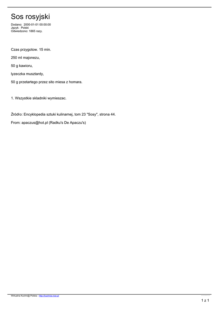 Sos rosyjski Dodano: 2000-01-01 00:00:00 Język: Polski Odwiedzono: 1865 razy. Czas przygotow. 15 min. 250 ml majonezu, 50 g kawioru, lyzeczka musztardy, 50 g przetartego przez sito miesa z homara. 1. Wszystkie skladniki wymieszac. Źródło: Encyklopedia sztuki kulinarnej, tom 23 "Sosy", strona 44. From: [email protected] (Radku's De Apaczu's) Wirtualna Kuchni@ Polska - http://kuchnia.now.pl przepis nr 6019, plik wygenerowano 2017.03.08 19:41 1z1