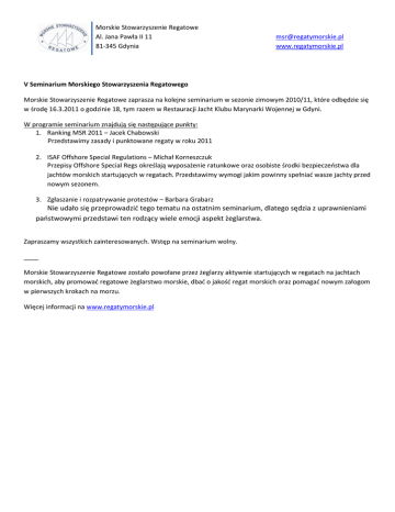 Morskie Stowarzyszenie Regatowe Al. Jana Pawła II 11 81-345 Gdynia [email protected] www.regatymorskie.pl V Seminarium Morskiego Stowarzyszenia Regatowego Morskie Stowarzyszenie Regatowe zaprasza na kolejne seminarium w sezonie zimowym 2010/11, które odbędzie się w środę 16.3.2011 o godzinie 18, tym razem w Restauracji Jacht Klubu Marynarki Wojennej w Gdyni. W programie seminarium znajdują się następujące punkty: 1. Ranking MSR 2011 – Jacek Chabowski Przedstawimy zasady i punktowane regaty w roku 2011 2. ISAF Offshore Special Regulations – Michał Korneszczuk Przepisy Offshore Special Regs określają wyposażenie ratunkowe oraz osobiste środki bezpieczeństwa dla jachtów morskich startujących w regatach. Przedstawimy wymogi jakim powinny spełniać wasze jachty przed nowym sezonem. 3. Zgłaszanie i rozpatrywanie protestów – Barbara Grabarz Nie udało się przeprowadzić tego tematu na ostatnim seminarium, dlatego sędzia z uprawnieniami państwowymi przedstawi ten rodzący wiele emocji aspekt żeglarstwa. Zapraszamy wszystkich zainteresowanych. Wstęp na seminarium wolny. ____ Morskie Stowarzyszenie Regatowe zostało powołane przez żeglarzy aktywnie startujących w regatach na jachtach morskich, aby promować regatowe żeglarstwo morskie, dbać o jakość regat morskich oraz pomagać nowym załogom w pierwszych krokach na morzu. Więcej informacji na www.regatymorskie.pl