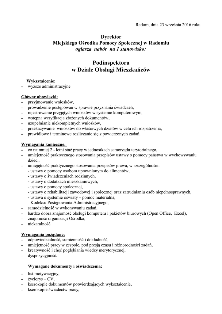 Radom, dnia 23 września 2016 roku Dyrektor Miejskiego Ośrodka Pomocy Społecznej w Radomiu ogłasza nabór na 1 stanowisko: Podinspektora w Dziale Obsługi Mieszkańców – Wykształcenie: wyższe administracyjne Główne obowiązki: – przyjmowanie wniosków, – prowadzenie postępowań w sprawie przyznania świadczeń, – rejestrowanie przyjętych wniosków w systemie komputerowym, – wstępna weryfikacja złożonych dokumentów, – uzupełnianie niekompletnych wniosków, – przekazywanie wniosków do właściwych działów w celu ich rozpatrzenia, – prawidłowe i terminowe rozliczanie się z powierzonych zadań. Wymagania konieczne: – co najmniej 2 - letni staż pracy w jednostkach samorządu terytorialnego, – umiejętność praktycznego stosowania przepisów ustawy o pomocy państwa w wychowywaniu dzieci, – umiejętność praktycznego stosowania przepisów prawa, w szczególności: - ustawy o pomocy osobom uprawnionym do alimentów, - ustawy o świadczeniach rodzinnych, - ustawy o dodatkach mieszkaniowych, - ustawy o pomocy społecznej, - ustawy o rehabilitacji zawodowej i społecznej oraz zatrudnianiu osób niepełnosprawnych, - ustawa o systemie oświaty – pomoc materialna, - Kodeksu Postępowania Administracyjnego, – samodzielność w wykonywaniu zadań, – bardzo dobra znajomość obsługi komputera i pakietów biurowych (Open Office, Excel), – znajomość organizacji Ośrodka, – niekaralność. Wymagania pożądane: – odpowiedzialność, sumienność i dokładność, – umiejętność pracy w zespole, pod presją czasu i różnorodności zadań, – kreatywność i chęć pogłębiania wiedzy merytorycznej, – dyspozycyjność. Wymagane dokumenty i oświadczenia: – – – – list motywacyjny, życiorys – CV, kserokopie dokumentów potwierdzających wykształcenie, kserokopie świadectw pracy, – – – – – – kserokopie zaświadczeń o ukończonych kursach, szkoleniach (w przypadku posiadania takich), kserokopie zaświadczeń i opinii o ukończonym stażu, przygotowaniu zawodowym (w przypadku posiadania takich), referencje od poprzednich pracodawców (w przypadku posiadania takich), oryginał kwestionariusza osobowego (do pobrania w Internecie na stronie www.bip.mops.radom.pl w zakładce: zarządzenie wprowadzające regulamin naboru), własnoręcznie podpisane oświadczenie kandydata o korzystaniu z pełni praw publicznych i o niekaralności za przestępstwo popełnione umyślnie, własnoręcznie podpisane oświadczenie kandydata o wyrażeniu zgody na przetwarzanie danych osobowych do celów rekrutacji. Dokumenty należy składać lub przesyłać w terminie do: – 10 dni od daty ukazania się ogłoszenia, pod adresem: Miejski Ośrodek Pomocy Społecznej w Radomiu, ul. Limanowskiego 134, sekretariat - pokój 03 z dopiskiem “Oferta pracy nr 12/16" Inne informacje: – oferty osób nie zakwalifikowanych zostaną zniszczone, – osoby, których oferty zostaną odrzucone, nie będą powiadamiane, – oferty, które wpłyną po wyżej określonym terminie nie będą rozpatrywane, – otrzymanych dokumentów nie odsyłamy, – informacja o wstępnej weryfikacji oraz wyniku naboru będzie umieszczona na stronie internetowej Biuletynu Informacji Publicznej oraz na tablicy informacyjnej w siedzibie Miejskiego Ośrodka Pomocy Społecznej w Radomiu, ul. Limanowskiego 134. Konkurs zostanie przeprowadzony zgodnie z Regulaminem przeprowadzania procesu naboru na wolne kierownicze stanowiska urzędnicze i wolne stanowiska urzędnicze w Miejskim Ośrodku Pomocy Społecznej w Radomiu wprowadzonym Zarządzeniem Dyrektora Miejskiego Ośrodka Pomocy Społecznej w Radomiu nr 18/05 z dnia 7 grudnia 2005 roku z późn. zm. Informuję, że wskaźnik zatrudnienia osób niepełnosprawnych w Ośrodku, w rozumieniu przepisów o rehabilitacji zawodowej i społecznej oraz zatrudnianiu osób niepełnosprawnych wynosi powyżej 6%. Dyrektor Miejskiego Ośrodka Pomocy Społecznej w Radomiu mgr Marcin Gierczak