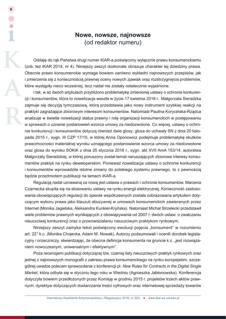 6 Nowe, nowsze, najnowsze (od redaktor numeru) Oddaję do rąk Państwa drugi numer iKAR-a poświęcony wyłącznie prawu konsumenckiemu (zob. też iKAR 2014, nr 4). Niniejszy zeszyt doskonale obrazuje charakter tej dziedziny prawa. Obecnie prawo konsumenckie wymaga bowiem zarówno wykładni najnowszych przepisów, jak i zmierzenia się z koniecznością prawnej oceny nowych zjawisk oraz rozstrzygnięcia problemów, które wystąpiły nieco wcześniej, lecz nadal nie zostały ostatecznie wyjaśnione. I tak, w aż dwóch artykułach przybliżono problematykę zmienionej ustawy o ochronie konkurencji i konsumentów, która to nowelizacja weszła w życie 17 kwietnia 2016 r.. Małgorzata Sieradzka zajmuje się decyzją tymczasową, którą przedstawia jako nowy instrument szybkiej reakcji na praktyki zagrażające zbiorowym interesom konsumentów. Natomiast Paulina Korycińska-Rządca analizuje w świetle nowelizacji status prawny i rolę organizacji konsumenckich w postępowaniu w sprawach o uznanie postanowień wzorca umowy za niedozwolone. Co więcej, ustawy o ochronie konkurencji i konsumentów dotyczą również dwie glosy: glosa do uchwały SN z dnia 20 listopada 2015 r., sygn. III CZP 17/15, w której Anna Oponowicz podejmuje problematykę skutków prawomocności materialnej wyroku uznającego postanowienie wzorca umowy za niedozwolone oraz glosa do wyroku SOKiK z dnia 25 stycznia 2016 r., sygn. akt XVII AmA 153/14, autorstwa Małgorzaty Sieradzkiej, w której poruszony został temat naruszających zbiorowe interesy konsumentów praktyk na rynku deweloperskim. Ponieważ nowelizacja ustawy o ochronie konkurencji i konsumentów wprowadziła istotne zmiany do polskiego systemu prawnego, to z pewnością będzie przedmiotem publikacji na łamach iKAR-a. Regulacją nadal uznawaną za nową jest ustawa o prawach i ochronie konsumentów. Marzena Czarnecka skupiła się na stosowaniu ustawy na rynku energii elektrycznej. Konieczność zastosowania obowiązujących regulacji do zjawisk współczesnych została zobrazowana artykułem dotyczącym wyboru prawa jako klauzuli abuzywnej w umowach konsumenckich zawieranych przez Internet (Monika Jagielska, Aleksandra Kunkiel-Kryńska). Natomiast Michał Strzelecki przedstawił wiele problemów prawnych wynikających z obowiązywania od 2007 r. dwóch ustaw: o zwalczaniu nieuczciwej konkurencji oraz o przeciwdziałaniu nieuczciwym praktykom rynkowym. Niniejszy zeszyt zamyka tekst poświęcony ewolucji pojęcia „konsument” w rozumieniu art. 221 k.c. (Monika Chojecka, Adam M. Nowak). Autorzy podsumowali i ocenili dorobek legislacyjny i orzeczniczy, stwierdzając, że obecna definicja konsumenta na gruncie k.c. „jest rozwiązaniem nowoczesnym, uniwersalnym i efektywnym”. Poza recenzjami publikacji dotyczącej tzw. czarnej listy nieuczciwych praktyk rynkowych oraz jednej z najnowszych monografii z zakresu prawa konsumenckiego na rynku europejskim, szczególnej uwadze polecam sprawozdanie z konferencji pt. New Rules for Contracts in the Digital Single Market, która odbyła się w styczniu tego roku w Wiedniu (Agnieszka Jabłonowska). Konferencja dotyczyła bowiem przedłożonych przez Komisję w grudniu 2015 r. projektów trzech aktów prawnych: dyrektyw dotyczących dostarczania treści cyfrowych oraz internetowej sprzedaży towarów internetowy Kwartalnik Antymonopolowy i Regulacyjny 2016, nr 3(5) www.ikar.wz.uw.edu.pl 7 Monika Namysłowska Nowe, nowsze, najnowsze (od redaktor numeru) oraz rozporządzenia w sprawie zapewnienia możliwości transgranicznego przenoszenia na rynku wewnętrznym usług online w zakresie treści, która to tematyka jeszcze długo będzie zajmować przedstawicieli doktryny prawa. Natomiast drugie sprawozdanie dotyczy III Międzynarodowej Konsumenckiej Konferencji Naukowej pt. „Ochrona Konsumenta na Rynku Usług” (Klaudia Łyszczek), która odbyła się w tym roku w marcu w Katowicach. Dużą satysfakcję sprawia, że problematyka prawnych aspektów ochrony konsumentów cieszy się nie tylko niesłabnącym, lecz także coraz większym zainteresowaniem zarówno naukowców, praktyków, jak i studentów. Życzę Państwu inspirującej lektury! dr hab. Monika Namysłowska, prof. UŁ Łódź, 19 kwietnia 2016 r. internetowy Kwartalnik Antymonopolowy i Regulacyjny 2016, nr 3(5) www.ikar.wz.uw.edu.pl