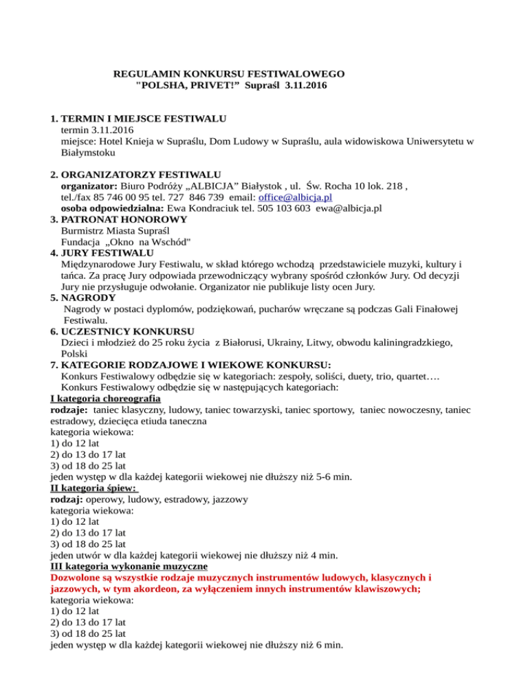 REGULAMIN KONKURSU FESTIWALOWEGO "POLSHA, PRIVET!” Supraśl 3.11.2016 1. TERMIN I MIEJSCE FESTIWALU termin 3.11.2016 miejsce: Hotel Knieja w Supraślu, Dom Ludowy w Supraślu, aula widowiskowa Uniwersytetu w Białymstoku 2. ORGANIZATORZY FESTIWALU organizator: Biuro Podróży „ALBICJA” Białystok , ul. Św. Rocha 10 lok. 218 , tel./fax 85 746 00 95 tel. 727 846 739 email: [email protected] osoba odpowiedzialna: Ewa Kondraciuk tel. 505 103 603 [email protected] 3. PATRONAT HONOROWY Burmistrz Miasta Supraśl Fundacja „Okno na Wschód" 4. JURY FESTIWALU Międzynarodowe Jury Festiwalu, w skład którego wchodzą przedstawiciele muzyki, kultury i tańca. Za pracę Jury odpowiada przewodniczący wybrany spośród członków Jury. Od decyzji Jury nie przysługuje odwołanie. Organizator nie publikuje listy ocen Jury. 5. NAGRODY Nagrody w postaci dyplomów, podziękowań, pucharów wręczane są podczas Gali Finałowej Festiwalu. 6. UCZESTNICY KONKURSU Dzieci i młodzież do 25 roku życia z Białorusi, Ukrainy, Litwy, obwodu kaliningradzkiego, Polski 7. KATEGORIE RODZAJOWE I WIEKOWE KONKURSU: Konkurs Festiwalowy odbędzie się w kategoriach: zespoły, soliści, duety, trio, quartet…. Konkurs Festiwalowy odbędzie się w następujących kategoriach: I kategoria choreografia rodzaje: taniec klasyczny, ludowy, taniec towarzyski, taniec sportowy, taniec nowoczesny, taniec estradowy, dziecięca etiuda taneczna kategoria wiekowa: 1) do 12 lat 2) do 13 do 17 lat 3) od 18 do 25 lat jeden występ w dla każdej kategorii wiekowej nie dłuższy niż 5-6 min. II kategoria śpiew: rodzaj: operowy, ludowy, estradowy, jazzowy kategoria wiekowa: 1) do 12 lat 2) do 13 do 17 lat 3) od 18 do 25 lat jeden utwór w dla każdej kategorii wiekowej nie dłuższy niż 4 min. III kategoria wykonanie muzyczne Dozwolone są wszystkie rodzaje muzycznych instrumentów ludowych, klasycznych i jazzowych, w tym akordeon, za wyłączeniem innych instrumentów klawiszowych; kategoria wiekowa: 1) do 12 lat 2) do 13 do 17 lat 3) od 18 do 25 lat jeden występ w dla każdej kategorii wiekowej nie dłuższy niż 6 min. 8. PODKŁADY MUZYCZNE I INSTRUMENTY Organizator zapewnia odtworzenie muzyki na nośniki CD-AUDIO/USB Organizator nie zapewnia instrumentów muzycznych. 9. SCENY FESTIWALOWE W zależności od ilości uczestników organizator przewiduje przeprowadzenie Festiwalu na następujących scenach: szerokość 16 m, głębokość 9 m, wysokość 5 m szerokość 10,5 m, głębokość 7 m, wysokość 7 m szerokość 7,6 m, głębokość 5,7 m, wysokość 3,7 m 10. KONCERT GALOWY Na Koncert Galowy zaproszeni są wszyscy uczestnicy Festiwalu i publiczność, wstęp wolny. Podczas Gali Finałowej ogłoszone będą wyniki oraz wystąpią uczestnicy Festiwalu rekomendowani przez Jury. 11. WARUNKI UCZESTNICTWA: 1. Przesłanie zgłoszenia do dnia 15.10.2016 i wniesienie opłaty wpisowej : 150 zł. za zespół w danej kategorii rodzajowej i wiekowej 40 zł. za duet lub solistę w danej kategorii rodzajowej i wiekowej 75 zł. za zespół za uczestnictwo w każdej kolejnej kategorii rodzajowej i wiekowej 20 zł. za za duet lub solistę w każdej kolejnej kategorii rodzajowej i wiekowej Nr konta organizatora: Biuro Podróży „ALBICJA”, 15-879 Białystok , ul. Św. Rocha 10 lok. 218: nr konta 09 1750 0012 0000 0000 3248 4077 Organizator Festiwalu może zwolnić z opłaty wpisowej uczestników. 2. Przesłanie zgłoszenia (wzór u organizatora) i wniesienie opłaty wpisowej jest jednoznaczne z akceptacją Regulaminu Konkursu. 3. Uczestnicy Festiwalu, opiekunowie, instruktorzy, nauczyciele wyrażają zgodę na rejestrację przebiegu Festiwalu, odtwarzanie i rozpowszechnianie zarejestrowanego materiału na wszelkich dostępnych nośnikach dźwięku oraz publikację wizerunku. Niniejsza zgoda jest nieodpłatna, nie jest ograniczona ilościowo, czasowo ani terytorialnie. 4. Uczestnicy Festiwalu, opiekunowie, instruktorzy, nauczyciele wyrażają zgodę na przetwarzanie swoich danych osobowych oraz na bezpłatne wykorzystanie ich na potrzeby Festiwalu i Konkursu Festiwalowego oraz w celach informacyjnych, promocji i reklamy Festiwalu. Niniejsza zgoda jest nieodpłatna, nie jest ograniczona ilościowo, czasowo ani terytorialnie. 12. INNE POSTANOWIENIA ORGANIZACYJNE: 1. Uczestnicy Festiwalu ubezpieczają się i przyjeżdżają na własny koszt. 2. Uczestnicy ponoszą odpowiedzialność za swoje bezpieczeństwo oraz porządek w miejscach gdzie odbywa się Festiwal. 3. Niepełnoletni uczestnicy przyjeżdżają z instruktorem i opiekunami w liczbie określonej obowiązującymi przepisami. Instruktor ponosi całkowitą odpowiedzialność za prezentację i bezpieczeństwo uczestników oraz porządek w miejscach gdzie odbywa się Festiwal. 4. Organizator nie ponosi odpowiedzialności za pozostawione rzeczy podczas trwania Festiwalu. 5. Sprawy nie ujęte w Regulaminie rozstrzyga organizator. 6. Organizator zastrzega sobie prawo do zmian w Regulaminie. 7. Organizator zastrzega sobie prawo do ustalenia ilości osób zakwalifikowanych do Festiwalu. 8. Organizator zastrzega sobie prawo do odwołania Festiwalu bez podania przyczyny. Z tego tytułu nie przysługuje zgłoszonym uczestnikom rekompensata lub jakiekolwiek odszkodowanie. 13. DANE KONTAKTOWE Biuro Podróży „ALBICJA” 15-879 Białystok , ul. Św. Rocha 10 lok. 218 , tel./fax 85 746 00 95 tel. 727 846 739 email: [email protected] osoba odpowiedzialna: Ewa Kondraciuk tel. 505 103 603 [email protected] pytania kierujemy na skrzynkę : [email protected] ; [email protected] zgłoszenia wysyłamy na skrzynkę: [email protected]