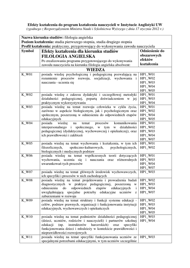 Efekty kształcenia do program kształcenia nauczycieli w Instytucie Anglistyki UW (zgodnego z Rozporządzeniem Ministra Nauki i Szkolnictwa Wyższego z dnia 17 stycznia 2012 r.) Nazwa kierunku studiów: filologia angielska Poziom kształcenia: studia pierwszego stopnia, studia drugiego stopnia Profil kształcenia: praktyczny, przygotowujący do wykonywania zawodu nauczyciela Symbol Odniesienie do Efekty kształcenia dla kierunku studiów obszarowych FILOLOGIA ANGIELSKA efektów Po zrealizowaniu programu przygotowującego do wykonywania kształcenia zawodu nauczyciela na kierunku filologia angielska absolwent: WIEDZA K_W01 K_W02 K_W03 K_W04 K_W05 K_W06 K_W07 K_W08 K_W09 K_W10 K_W11 posiada wiedzę psychologiczną i pedagogiczną pozwalającą na HP1_W01 rozumienie procesów rozwoju, socjalizacji, wychowania i HP1_W02 nauczania - uczenia się HP1_W03 HP1_W04 HP1_W05 posiada wiedzę z zakresu dydaktyki i szczegółowej metodyki HP1_W01 działalności pedagogicznej, popartą doświadczeniem w jej HP1_W03 praktycznym wykorzystywaniu HP1_W04 posiada wiedzę na temat rozwoju człowieka w cyklu życia, HP1_W01 zarówno w aspekcie biologicznym, jak i psychologicznym oraz HP1_W02 społecznym, poszerzoną w odniesieniu do odpowiednich etapów HP1_W04 edukacyjnych HP1_W05 posiada wiedzę na temat procesów komunikowania HP1_W01 interpersonalnego i społecznego, w tym w działalności HP1_W02 pedagogicznej (dydaktycznej, wychowawczej i opiekuńczej), oraz HP1_W03 ich prawidłowości i zakłóceń HP1_W04 HP1_W07 posiada wiedzę na temat wychowania i kształcenia, w tym ich HP1_W01 filozoficznych, społeczno-kulturowych, psychologicznych, HP1_W02 biologicznych i medycznych podstaw posiada wiedzę na temat współczesnych teorii dotyczących HP1_W01 wychowania, uczenia się i nauczania oraz różnorodnych HP1_W03 uwarunkowań tych procesów HP1_W04 HP1_W07 posiada wiedzę na temat głównych środowisk wychowawczych, HP1_W03 ich specyfiki i procesów w nich zachodzących posiada wiedzę na temat projektowania i prowadzenia badań HP1_W02 diagnostycznych w praktyce pedagogicznej, poszerzoną w HP1_W03 odniesieniu do odpowiednich etapów edukacyjnych i HP1_W04 uwzględniającą specjalne potrzeby edukacyjne uczniów z HP1_W07 zaburzeniami w rozwoju posiada wiedzę na temat struktury i funkcji systemu edukacji - HP1_W02 celów, podstaw prawnych, organizacji i funkcjonowania instytucji HP1_W03 edukacyjnych, wychowawczych i opiekuńczych HP1_W04 HP1_W05 posiada wiedzę na temat podmiotów działalności pedagogicznej HP1_W03 (dzieci, uczniów, rodziców i nauczycieli) i partnerów szkolnej HP1_W04 edukacji (np. instruktorów harcerskich) oraz specyfiki funkcjonowania dzieci i młodzieży w kontekście prawidłowości i nieprawidłowości rozwojowych posiada wiedzę na temat specyfiki funkcjonowania uczniów ze HP1_W03 specjalnymi potrzebami edukacyjnymi, w tym uczniów szczególnie K_W12 K_W13 K_W14 K_W15 K_W16 K_W17 uzdolnionych posiada wiedzę na temat metodyki wykonywania zadań − norm, procedur i dobrych praktyk stosowanych w wybranym obszarze działalności pedagogicznej (wychowanie przedszkolne, nauczanie w szkołach ogólnodostępnych, w szkołach i oddziałach specjalnych oraz integracyjnych) posiada wiedzę na temat bezpieczeństwa i higieny pracy w instytucjach edukacyjnych, wychowawczych i opiekuńczych, do pracy w których uzyskuje przygotowanie posiada wiedzę na temat projektowania ścieżki własnego rozwoju i awansu zawodowego posiada wiedzę na temat etyki zawodu nauczyciela HP1_W03 HP1_W04 HP1_W03 HP1_W03 HP1_W01 HP1_W03 HP1_W05 w zakresie technologii informacyjnej posiada podstawową HP1_W03 wiedzę w zakresie technik informatycznych, przetwarzania HP1_W05 tekstów, wykorzystywania arkuszy kalkulacyjnych, korzystania z baz danych, posługiwania się grafiką prezentacyjną, korzystania z usług w sieciach informatycznych, pozyskiwania i przetwarzania informacji w zakresie emisji głosu – posiada podstawową wiedzę o HP1_W03 HP1_W05 funkcjonowaniu i patologii narządu mowy UMIEJĘTNOŚCI K_U01 K_U02 K_U03 K_U04 K_U05 K_U06 K_U07 posiada umiejętności i kompetencje niezbędne do kompleksowej realizacji dydaktycznych, wychowawczych i opiekuńczych zadań szkoły, w tym do samodzielnego przygotowania i dostosowania programu nauczania do potrzeb i możliwości uczniów wykazuje umiejętność uczenia się i doskonalenia własnego warsztatu pedagogicznego z wykorzystaniem nowoczesnych środków i metod pozyskiwania, organizowania i przetwarzania informacji i materiałów potrafi dokonywać obserwacji sytuacji i zdarzeń pedagogicznych potrafi wykorzystywać wiedzę teoretyczną z zakresu pedagogiki oraz psychologii do analizowania i interpretowania określonego rodzaju sytuacji i zdarzeń pedagogicznych, a także motywów i wzorów zachowań uczestników tych sytuacji potrafi posługiwać się wiedzą teoretyczną z zakresu pedagogiki, psychologii oraz dydaktyki i metodyki szczegółowej w celu diagnozowania, analizowania i prognozowania sytuacji pedagogicznych oraz dobierania strategii realizowania działań praktycznych na poszczególnych etapach edukacyjnych potrafi samodzielnie zdobywać wiedzę i rozwijać swoje profesjonalne umiejętności związane z działalnością pedagogiczną (dydaktyczną, wychowawczą i opiekuńczą), korzystając z różnych źródeł (w języku polskim i obcym) i nowoczesnych technologii posiada umiejętności diagnostyczne pozwalające na rozpoznawanie sytuacji uczniów ze specjalnymi potrzebami edukacyjnymi, opracowywanie wyników obserwacji i formułowanie wniosków HP1_U06 HP1_U09 HP1_U10 HP1_U02 HP1_U03 HP1_U09 HP1_U10 HP1_U02 HP1_U03 HP1_U02 HP1_U03 HP1_U06 HP1_U10 HP1_U02 HP1_U06 HP1_U09 HP1_U10 HP1_U02 HP1_U02 HP1_U06 K_U08 K_U09 K_U10 K_U11 K_U12 K_U13 K_U14 K_U15 K_U16 K_U17 K_U18 K_U19 K_U20 K_K01 posiada rozwinięte kompetencje komunikacyjne: potrafi porozumiewać się z osobami pochodzącymi z różnych środowisk, będącymi w różnej kondy