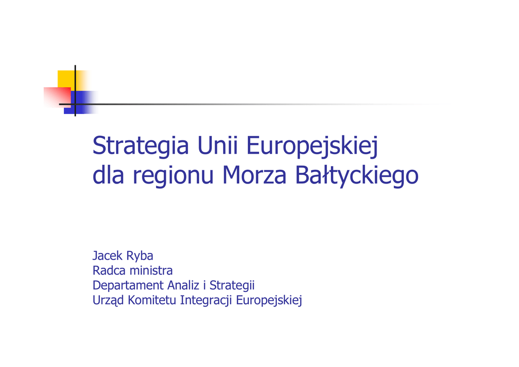 Strategia Unii Europejskiej dla regionu Morza Bałtyckiego Jacek Ryba Radca ministra Departament Analiz i Strategii Urząd Komitetu Integracji Europejskiej Mandat do prac nad Strategią dla RMB „Nie naruszając zintegrowanej polityki morskiej, Rada Europejska wzywa Komisję do przedstawienia nie później niŜ w czerwcu 2009 roku strategii dotyczącej regionu Morza Bałtyckiego. Strategia ta powinna pomóc między innymi w sprostaniu pilnym wyzwaniom środowiskowym związanym z Morzem Bałtyckim. Ramy wymiaru północnego stanowią fundament zewnętrznych aspektów współpracy w regionie Morza Bałtyckiego.” Źródło: Konkluzje Prezydencji, Posiedzenie Rady Europejskiej w Brukseli, 14 grudnia 2007 r. Proces wypracowywania dokumentu W KE prace nad Strategią koordynuje Dyrekcja Generalna ds. polityki regionalnej (DG REGIO), a w jej ramach wydział odpowiedzialny za współpracę terytorialną. Zgodnie z zapewnieniami DG REGIO, w prace nad Strategią jest zaangaŜowanych łącznie kilkanaście dyrekcji generalnych, które współpracują w ramach specjalnie utworzonej Interservice Group. NajwaŜniejsze DG weszły w skład tzw. Steering Group. Są to: DG RELEX, DG ENV, DG TREN, DG MARE. Harmonogram prac nad Strategią dla RMB Stock-taking Okrągły stół nt. priorytetu „Dostępność i atrakcyjność” Kowno, 18-19 września 2008 Konferencja horyzontalna nt. Strategii Sztokholm, 30 września 2008 Okrągły stół nt. priorytetu „Środowisko” Gdańsk, 13 listopada 2008 Okrągły stół nt. priorytetu „Dobrobyt” Kopenhaga, 1-2 grudnia 2008 Okrągły stół nt. priorytetu „Bezpieczeństwo” Helsinki, 9 grudnia 2008 Konferencja horyzontalna nt. Strategii UE dla regionu Morza Bałtyckiego Rostok, 5-6 lutego 2009 Priorytety Strategii dla RMB STRATEGIA UNII EUROPEJSKIEJ DLA REGIONU MORZA BAŁTYCKIEGO OCHRONA ŚRODOWISKA DOBROBYT DOSTĘPNOŚĆ I ATRAKCYJNOŚĆ BEZPIECZEŃSWO Instrumenty realizacji Strategii dla RMB Instrumenty finansowe Działania o charakterze regulacyjnym Instrumenty finansowe Strategii Unii Europejskiej dla regionu Morza Bałtyckiego fundusze strukturalne TENs 7. program ramowy CIP Programy edukacyjne Wstępne stanowisko Polski ws. Strategii dla RMB Wstępne stanowisko Polski ws. Strategii zostało przyjęte przez KERM w dniu 3 czerwca 2008 roku, kolejne pogłębione 4 listopada 2008 r. „Spójność i konkurencyjność regionu Morza Bałtyckiego − od wizji do działań” WdraŜanie Strategii dla RMB Strategia dla regionu Morza Bałtyckiego ma być wdraŜana w oparciu o Plan Działania. Plan Działania będzie miał charakter elastyczny (rolling Action Plan), tzn. będzie ewoluować wraz z upływem czasu i będzie uzupełniany o nowe działania. Dla kaŜdego działania zostanie określony harmonogram jego realizacji oraz stosowny mechanizm monitoringu jego implementacji. Bardzo istotny znaczenie będzie miał wybór leaderów dla poszczególnych działań. Do rozstrzygnięcia postaje rola KE w procesie implementacji. Strategia UE dla RMB postrzegana jest jako pilotaŜowy projekt strategii makroregionalnej Kolejne: Region Dunaju, Region Alpejski Tym samym wpisuje się w debatę nt. spójności terytorialnej i zintegrowanego podejścia do rozwoju Krótko- i średniookresowo brak implikacji dla perspektywy finansowej www.strategia-baltyk.ukie.gov.pl