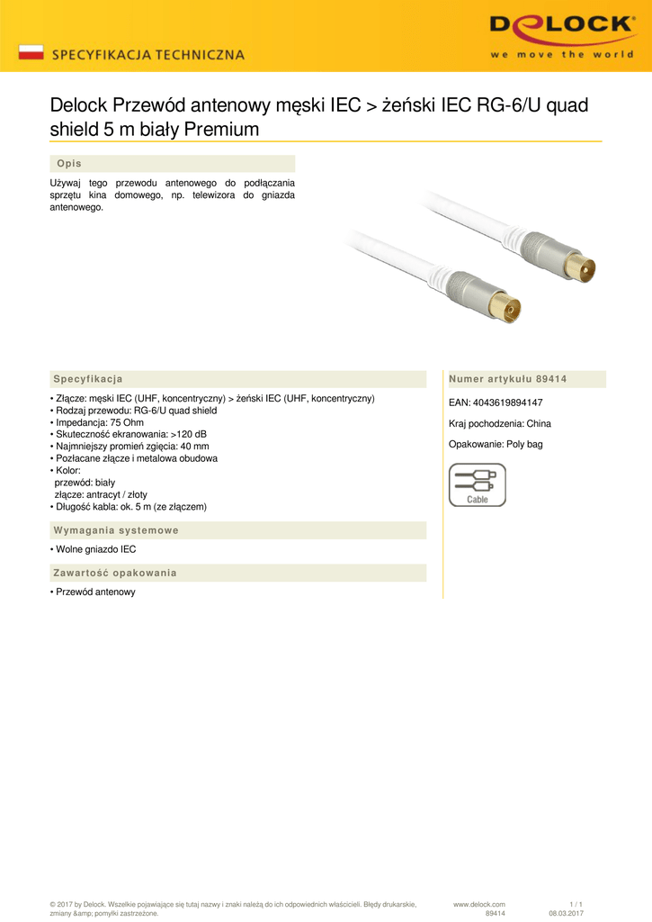 Delock Przewód antenowy męski IEC > żeński IEC RG-6/U quad shield 5 m biały Premium Opis Używaj tego przewodu antenowego do podłączania sprzętu kina domowego, np. telewizora do gniazda antenowego. Specyfikacja • Złącze: męski IEC (UHF, koncentryczny) > żeński IEC (UHF, koncentryczny) • Rodzaj przewodu: RG-6/U quad shield • Impedancja: 75 Ohm • Skuteczność ekranowania: >120 dB • Najmniejszy promień zgięcia: 40 mm • Pozłacane złącze i metalowa obudowa • Kolor: przewód: biały złącze: antracyt / złoty • Długość kabla: ok. 5 m (ze złączem) Numer artykułu 89414 EAN: 4043619894147 Kraj pochodzenia: China Opakowanie: Poly bag Wymagania systemowe • Wolne gniazdo IEC Zawartość opakowania • Przewód antenowy © 2017 by Delock. Wszelkie pojawiające się tutaj nazwy i znaki należą do ich odpowiednich właścicieli. Błędy drukarskie, zmiany & pomyłki zastrzeżone. Powered by TCPDF (www.tcpdf.org) www.delock.com 89414 1/1 08.03.2017