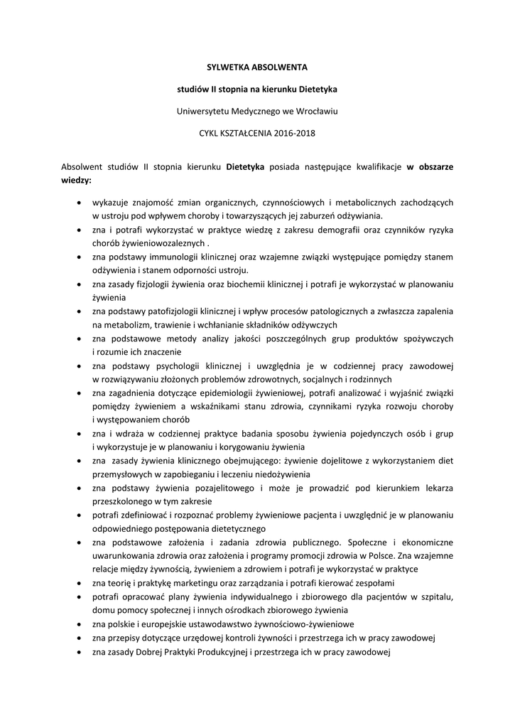 SYLWETKA ABSOLWENTA studiów II stopnia na kierunku Dietetyka Uniwersytetu Medycznego we Wrocławiu CYKL KSZTAŁCENIA 2016-2018 Absolwent studiów II stopnia kierunku Dietetyka posiada następujące kwalifikacje w obszarze wiedzy: wykazuje znajomość zmian organicznych, czynnościowych i metabolicznych zachodzących w ustroju pod wpływem choroby i towarzyszących jej zaburzeń odżywiania. zna i potrafi wykorzystać w praktyce wiedzę z zakresu demografii oraz czynników ryzyka chorób żywieniowozaleznych . zna podstawy immunologii klinicznej oraz wzajemne związki występujące pomiędzy stanem odżywienia i stanem odporności ustroju. zna zasady fizjologii żywienia oraz biochemii klinicznej i potrafi je wykorzystać w planowaniu żywienia zna podstawy patofizjologii klinicznej i wpływ procesów patologicznych a zwłaszcza zapalenia na metabolizm, trawienie i wchłanianie składników odżywczych zna podstawowe metody analizy jakości poszczególnych grup produktów spożywczych i rozumie ich znaczenie zna podstawy psychologii klinicznej i uwzględnia je w codziennej pracy zawodowej w rozwiązywaniu złożonych problemów zdrowotnych, socjalnych i rodzinnych zna zagadnienia dotyczące epidemiologii żywieniowej, potrafi analizować i wyjaśnić związki pomiędzy żywieniem a wskaźnikami stanu zdrowia, czynnikami ryzyka rozwoju choroby i występowaniem chorób zna i wdraża w codziennej praktyce badania sposobu żywienia pojedynczych osób i grup i wykorzystuje je w planowaniu i korygowaniu żywienia zna zasady żywienia klinicznego obejmującego: żywienie dojelitowe z wykorzystaniem diet przemysłowych w zapobieganiu i leczeniu niedożywienia zna podstawy żywienia pozajelitowego i może je prowadzić pod kierunkiem lekarza przeszkolonego w tym zakresie potrafi zdefiniować i rozpoznać problemy żywieniowe pacjenta i uwzględnić je w planowaniu odpowiedniego postępowania dietetycznego zna podstawowe założenia i zadania zdrowia publicznego. Społeczne i ekonomiczne uwarunkowania zdrowia oraz założenia i programy promocji zdrowia w Polsce. Zna wzajemne relacje między żywnością, żywieniem a zdrowiem i potrafi je wykorzystać w praktyce zna teorię i praktykę marketingu oraz zarządzania i potrafi kierować zespołami potrafi opracować plany żywienia indywidualnego i zbiorowego dla pacjentów w szpitalu, domu pomocy społecznej i innych ośrodkach zbiorowego żywienia zna polskie i europejskie ustawodawstwo żywnościowo-żywieniowe zna przepisy dotyczące urzędowej kontroli żywności i przestrzega ich w pracy zawodowej zna zasady Dobrej Praktyki Produkcyjnej i przestrzega ich w pracy zawodowej zna System Zagrożeń i Krytycznych Punktów Kontroli oraz ich znaczenie w podnoszeniu jakości produkcji żywności Absolwent studiów II stopnia kierunku Dietetyka posiada następujące kwalifikacje w obszarze umiejętności: potrafi zaplanować i poprowadzić edukację żywieniową indywidualna i grupową potrafi opracować jasne i zrozumiałe materiały edukacyjne dla pacjenta potrafi opracować jasne i zrozumiałe instrukcje dla personelu realizującego opiekę żywieniową potrafi prowadzić dokumentację podejmowanych czynności zawodowych, chroni poufność i bezpieczeństwo prowadzonej dokumentacji podczas przechowywania, upowszechniania i niszczenia potrafi przeprowadzić wywiad żywieniowy i ocenić sposób żywienia osoby badanej w oparciu o odpowiednie kwestionariusze potrafi prowadzić poradnictwo żywieniowe oraz zaplanować i prowadzić opiekę żywieniową nad pacjentami w szpitalu i zapobiegać niedożywieniu szpitalnemu potrafi ocenić efektywność opieki żywieniowej w osiąganiu zamierzonych celów i modyfikować plan opieki żywieniowej w zależności od potrzeb potrafi zinterpretować wyniki podstawowych badań laboratoryjnych i wykorzystać je w planowaniu i monitorowaniu postępowania żywieniowego potrafi, w oparciu o badania przesiewowe rozpoznać niedożywienie, przeprowadzić pełną ocenę stanu odżywienia i określić rodzaj oraz stopień niedożywienia potrafi określić ryzyko niedożywienia szpitalnego i podjąć odpowiednie działania zapobiegawcze działając wspólnie z lekarzami i pielęgniarkami w ramach zespołu terapeutycznego zapewniającego opiekę żywieniową nad pacjentami potrafi ustalić wskazania do wspomagania i/lub/ leczenia żywieniowego z wykorzystaniem dostępnych w Polsce diet przemysłowych , suplementów diety i żywności specjalnego przeznaczenia żywieniowego w korygowaniu zaburzeń odżywiania planuje żywienie w domu pacjentów wypisanych ze szpitala potrafi zaplanować i realizować kompleksowe postępowanie obejmujące żywienie, aktywność fizyczną i styl życia dla osób z nadwagą lub otyłością potrafi przygotować i nadzorować wytwarzanie potraw wchodzących w skład różnego rodzaju diet w pracy zawodowej wykorzystuje wiedzę z dziedziny towaroznawstwa, jakości i bezpieczeństwa żywności potrafi określić zmiany w wartości odżywczej surowców i potraw w zależności od warunków i czasu przechowywania oraz sposobu przetworzenia potrafi określić wartość odżywczą pożywienia na podstawie tabel wartości odżywczej produktów spożywczych i typowych potraw, programów komputerowych i zalecanych wielkości spożycia (Recommende Dietary Allowances – RDA) wie co to jest żywność funkcjonalna i żywność genetycznie modyfikowana i potrafi wykorzystać tą wiedzę w edukacji i poradnictwie żywieniowym potrafi zaplanować żywienie kobiet w ciąży i w okresie karmienia piersią oraz żywienie niemowląt zgodnie z współczesną wiedzą w tym zakresie potrafi uzasadnić wpływ prawidłowego żywienia kobiet w ciąży oraz karmienia piersią na rozwój fizyczny i intelektualny dziecka zna zasady dietoprofilaktyki i potrafi zaplanować, dostosowane do wieku postępowanie dietetyczne w celu zapobiegania chorobom związanym z nieprawidłowym odżywianiem i brakiem aktywności fizycznej zna przy