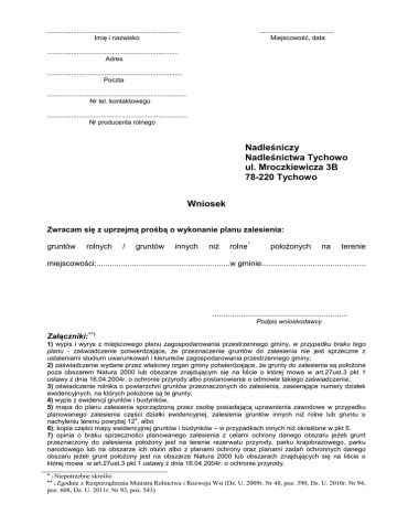 ........................................................................ Imię i nazwisko ........................................ Miejscowość, data ....................................................................... Adres ......................................................................... Poczta .................................................................................... Nr tel. kontaktowego ............................................................................ Nr producenta rolnego Nadleśniczy Nadleśnictwa Tychowo ul. Mroczkiewicza 3B 78-220 Tychowo Wniosek Zwracam się z uprzejmą prośbą o wykonanie planu zalesienia: gruntów rolnych / gruntów innych niż rolne* położonych na terenie miejscowości:............................................................w gminie............................................... ............................................................. Podpis wnioskodawcy Załączniki:**). 1) wypis i wyrys z miejscowego planu zagospodarowania przestrzennego gminy, w przypadku braku tego planu - zaświadczenie potwierdzające, że przeznaczenie gruntów do zalesienia nie jest sprzeczne z ustaleniami studium uwarunkowań i kierunków zagospodarowania przestrzennego gminy; 2) zaświadczenie wydane przez właściwy organ gminy potwierdzające, że grunty do zalesienia są położone poza obszarem Natura 2000 lub obszarze znajdującym się na liście o której mowa w art.27ust.3 pkt 1 ustawy z dnia 16.04.2004r. o ochronie przyrody albo postanowienie o odmowie takiego zaświadczenia; 3) oświadczenie rolnika o powierzchni gruntów przeznaczonych do zalesienia, zawierające numery działek ewidencyjnych, na których położone są te grunty; 4) wypis z ewidencji gruntów i budynków, 5) mapa do planu zalesienia sporządzoną przez osobę posiadającą uprawnienia zawodowe w przypadku planowanego zalesienia części działki ewidencyjnej, zalesienia gruntów innych niż rolne lub gruntu o o nachyleniu terenu powyżej 12 , albo 6); kopia części mapy ewidencyjnej gruntów i budynków – w przypadkach innych niż określone w pkt 5. 7) opinia o braku sprzeczności planowanego zalesienia z celami ochrony danego obszaru jeżeli grunt przeznaczony do zalesienia położony jest na terenie rezerwatu przyrody, parku krajobrazowego, parku narodowego lub na obszarze ich otulin albo z planami ochrony oraz planami zadań ochronnych danego obszaru jeżeli grunt położony jest na obszarze Natura 2000 lub obszarach znajdujących się na liście o której mowa w art.27ust.3 pkt 1 ustawy z dnia 16.04.2004r. o ochronie przyrody. * ) Niepotrzebne skreślić ** ) Zgodnie z Rozporządzenia Ministra Rolnictwa i Rozwoju Wsi (Dz. U. 2009r. Nr 48, poz. 390, Dz. U. 2010r. Nr 94, poz. 608, Dz. U. 2011r. Nr 93, poz. 543)
