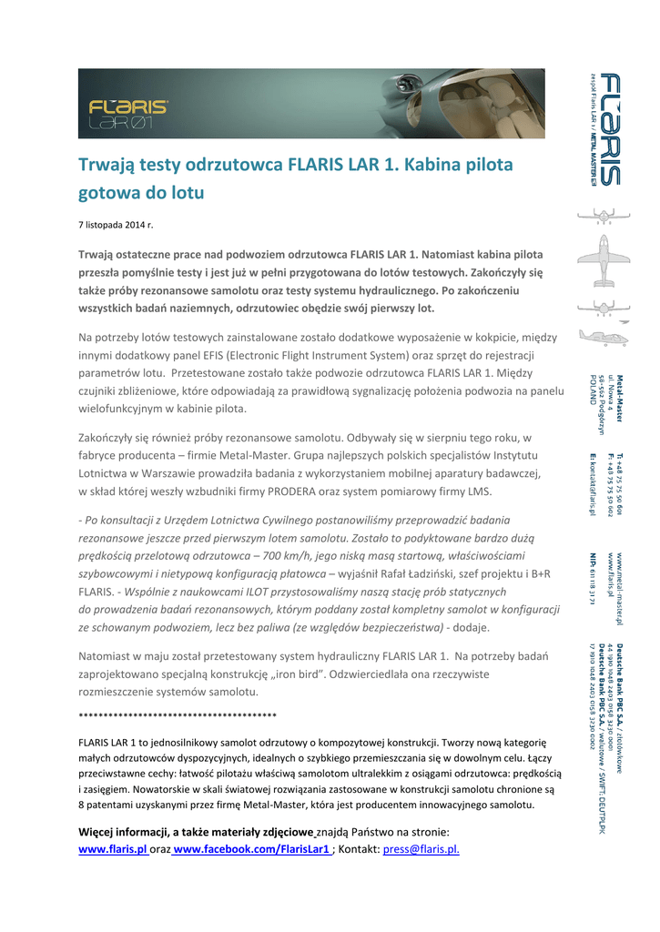 Trwają testy odrzutowca FLARIS LAR 1. Kabina pilota gotowa do lotu 7 listopada 2014 r. Trwają ostateczne prace nad podwoziem odrzutowca FLARIS LAR 1. Natomiast kabina pilota przeszła pomyślnie testy i jest już w pełni przygotowana do lotów testowych. Zakooczyły się także próby rezonansowe samolotu oraz testy systemu hydraulicznego. Po zakooczeniu wszystkich badao naziemnych, odrzutowiec obędzie swój pierwszy lot. Na potrzeby lotów testowych zainstalowane zostało dodatkowe wyposażenie w kokpicie, między innymi dodatkowy panel EFIS (Electronic Flight Instrument System) oraz sprzęt do rejestracji parametrów lotu. Przetestowane zostało także podwozie odrzutowca FLARIS LAR 1. Między czujniki zbliżeniowe, które odpowiadają za prawidłową sygnalizację położenia podwozia na panelu wielofunkcyjnym w kabinie pilota. Zakooczyły się również próby rezonansowe samolotu. Odbywały się w sierpniu tego roku, w fabryce producenta – firmie Metal-Master. Grupa najlepszych polskich specjalistów Instytutu Lotnictwa w Warszawie prowadziła badania z wykorzystaniem mobilnej aparatury badawczej, w skład której weszły wzbudniki firmy PRODERA oraz system pomiarowy firmy LMS. - Po konsultacji z Urzędem Lotnictwa Cywilnego postanowiliśmy przeprowadzid badania rezonansowe jeszcze przed pierwszym lotem samolotu. Zostało to podyktowane bardzo dużą prędkością przelotową odrzutowca – 700 km/h, jego niską masą startową, właściwościami szybowcowymi i nietypową konfiguracją płatowca – wyjaśnił Rafał Ładzioski, szef projektu i B+R FLARIS. - Wspólnie z naukowcami ILOT przystosowaliśmy naszą stację prób statycznych do prowadzenia badao rezonansowych, którym poddany został kompletny samolot w konfiguracji ze schowanym podwoziem, lecz bez paliwa (ze względów bezpieczeostwa) - dodaje. Natomiast w maju został przetestowany system hydrauliczny FLARIS LAR 1. Na potrzeby badao zaprojektowano specjalną konstrukcję „iron bird”. Odzwierciedlała ona rzeczywiste rozmieszczenie systemów samolotu. **************************************** FLARIS LAR 1 to jednosilnikowy samolot odrzutowy o kompozytowej konstrukcji. Tworzy nową kategorię małych odrzutowców dyspozycyjnych, idealnych o szybkiego przemieszczania się w dowolnym celu. Łączy przeciwstawne cechy: łatwośd pilotażu właściwą samolotom ultralekkim z osiągami odrzutowca: prędkością i zasięgiem. Nowatorskie w skali światowej rozwiązania zastosowane w konstrukcji samolotu chronione są 8 patentami uzyskanymi przez firmę Metal-Master, która jest producentem innowacyjnego samolotu. Więcej informacji, a także materiały zdjęciowe znajdą Paostwo na stronie: www.flaris.pl oraz www.facebook.com/FlarisLar1 ; Kontakt: [email protected].