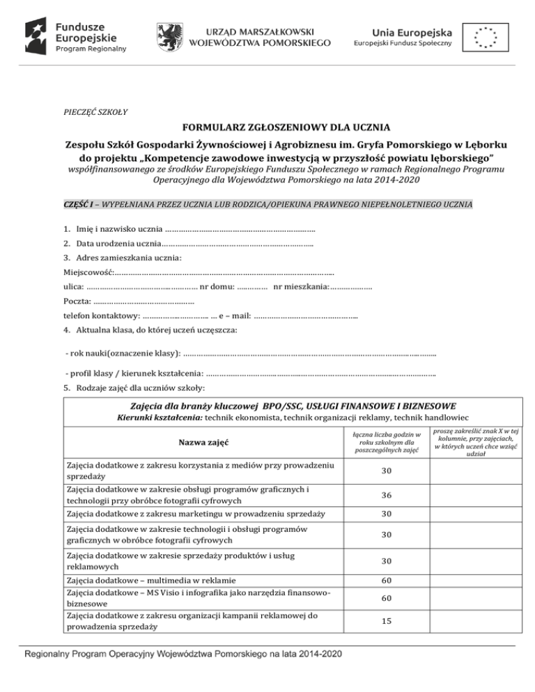 PIECZĘĆ SZKOŁY FORMULARZ ZGŁOSZENIOWY DLA UCZNIA Zespołu Szkół Gospodarki Żywnościowej i Agrobiznesu im. Gryfa Pomorskiego w Lęborku do projektu „Kompetencje zawodowe inwestycją w przyszłość powiatu lęborskiego” współfinansowanego ze środków Europejskiego Funduszu Społecznego w ramach Regionalnego Programu Operacyjnego dla Województwa Pomorskiego na lata 2014-2020 CZĘŚĆ I – WYPEŁNIANA PRZEZ UCZNIA LUB RODZICA/OPIEKUNA PRAWNEGO NIEPEŁNOLETNIEGO UCZNIA 1. Imię i nazwisko ucznia …………………………………………………………. 2. Data urodzenia ucznia………………………………………………………….. 3. Adres zamieszkania ucznia: Miejscowość:…………………………………………………………………………………….. ulica: ………………………………..………… nr domu: …..……… nr mieszkania:………………. Poczta: ……………………………………… telefon kontaktowy: ……………..…………. … e – mail: ……………………………………….. 4. Aktualna klasa, do której uczeń uczęszcza: - rok nauki(oznaczenie klasy): ………………………………………………………………………………………..…..…….. - profil klasy / kierunek kształcenia: …………………………..………..…………………………………..………….……. 5. Rodzaje zajęć dla uczniów szkoły: Zajęcia dla branży kluczowej BPO/SSC, USŁUGI FINANSOWE I BIZNESOWE Kierunki kształcenia: technik ekonomista, technik organizacji reklamy, technik handlowiec Nazwa zajęć łączna liczba godzin w roku szkolnym dla poszczególnych zajęć Zajęcia dodatkowe z zakresu korzystania z mediów przy prowadzeniu sprzedaży 30 Zajęcia dodatkowe w zakresie obsługi programów graficznych i technologii przy obróbce fotografii cyfrowych 36 Zajęcia dodatkowe z zakresu marketingu w prowadzeniu sprzedaży 30 Zajęcia dodatkowe w zakresie technologii i obsługi programów graficznych w obróbce fotografii cyfrowych 30 Zajęcia dodatkowe w zakresie sprzedaży produktów i usług reklamowych 30 Zajęcia dodatkowe – multimedia w reklamie Zajęcia dodatkowe – MS Visio i infografika jako narzędzia finansowobiznesowe Zajęcia dodatkowe z zakresu organizacji kampanii reklamowej do prowadzenia sprzedaży 60 60 15 proszę zakreślić znak X w tej kolumnie, przy zajęciach, w których uczeń chce wziąć udział Zajęcia dodatkowe z zakresu obsługi programów graficznych 30 Zajęcia dodatkowe z zakresu planowania i prowadzenia działalności w organizacji 30 Zajęcia dodatkowe z matematyki finansowej 30 Zajęcia dodatkowe z zakresu prowadzenia nowoczesnego sekretariatu 30 Zajęcia dodatkowe z zakresu matematyki finansowej – wykorzystanie działań matematycznych do kalkulacji cen, obsługi kasy fiskalnej, programu magazynowo-sprzedażowego Subiekt GT Zajęcia dodatkowe – środki techniczne i programy komputerowe wykorzystywane w handlu Zajęcia dodatkowe przygotowujące do prowadzenia działalności handlowej 30 30 30 Zajęcia dodatkowe z zakresu obsługi kasy fiskalnej 30 Zajęcia dodatkowe z języka angielskiego zawodowego 30 Zajęcia dodatkowe z języka niemieckiego zawodowego 30 Zajęcia dla branży kluczowej BPO/SSC, USŁUGI FINANSOWE I BIZNESOWE Kierunki kształcenia: technik ekonomista, technik organizacji reklamy, technik handlowiec Nazwa zajęć łączna liczba godzin w roku szkolnym dla poszczególnych zajęć MS Excel jako narzędzie finansowo-statystyczne Absolwent na rynku pracy w środowisku wielokulturowym poruszanie się po międzynarodowym rynku pracy w branży BPO/SSC 30 Szkolenie z programu ERP-SAP (zajęcia poza szkołą) 40 proszę zakreślić znak X w tej kolumnie, przy zajęciach, w których uczeń chce wziąć udział 12 Zajęcia dla branży kluczowej CHEMIA LEKKA Kierunki kształcenia: technik analityk, technik technologii żywności technik Nazwa zajęć Zajęcia dodatkowe z zakresu chemii analitycznej - Chemix Zajęcia dodatkowe z zakresu przygotowania sprzętu, odczynników chemicznych i próbek do badań analitycznych Zajęcia dodatkowe – moje laboratorium – doświadczenia laboratoryjne łączna liczba godzin w roku szkolnym dla poszczególnych zajęć 30 30 30 Zajęcia dodatkowe – analiza fizykochemiczna 30 Zajęcia dodatkowe - przedsiębiorczość w analityce laboratoryjnej 30 Zajęcia dodatkowe – analiza instrumentalna 30 Zajęcia dodatkowe – badanie produktów spożywczych 30 Zajęcia dodatkowe z języka angielskiego zawodowego 30 proszę zakreślić znak X w tej kolumnie, przy zajęciach, w których uczeń chce wziąć udział 6. Uzasadnienie chęci/niezbędności kształtowania i rozwijania kompetencji kluczowych niezbędnych na rynku pracy i udziału w konkretnych zajęciach Swoją chęć udziału w ww. zajęciach motywuję następująco: ………………………………………………………………………………………………………………………………………………………………………… ………………………………………………………………………………………………………………………………………………………………………… ……………………………………………………………………………………………………………………………….…………………………………..…… ………………………………………………………………………………………………………………………………………………………………………… Wypełnia uczeń lub rodzic/opiekun prawny w przypadku niepełnoletniego ucznia. Pole nieobowiązkowe – uczeń może, ale nie musi wypełniać pola dot. uzasadnienia chęci/niezbędności kształtowania i rozwijania kompetencji kluczowych niezbędnych na rynku pracy i udziału w konkretnych zajęciach. 