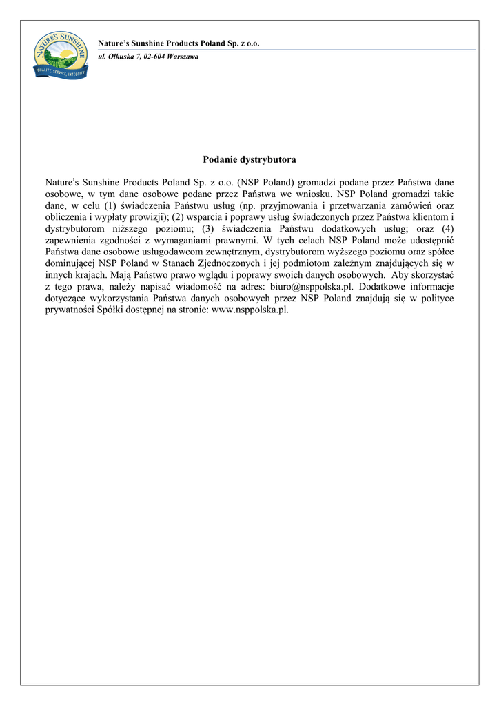 Nature’s Sunshine Products Poland Sp. z o.o. ul. Olkuska 7, 02-604 Warszawa Podanie dystrybutora Nature’s Sunshine Products Poland Sp. z o.o. (NSP Poland) gromadzi podane przez Państwa dane osobowe, w tym dane osobowe podane przez Państwa we wniosku. NSP Poland gromadzi takie dane, w celu (1) świadczenia Państwu usług (np. przyjmowania i przetwarzania zamówień oraz obliczenia i wypłaty prowizji); (2) wsparcia i poprawy usług świadczonych przez Państwa klientom i dystrybutorom niższego poziomu; (3) świadczenia Państwu dodatkowych usług; oraz (4) zapewnienia zgodności z wymaganiami prawnymi. W tych celach NSP Poland może udostępnić Państwa dane osobowe usługodawcom zewnętrznym, dystrybutorom wyższego poziomu oraz spółce dominującej NSP Poland w Stanach Zjednoczonych i jej podmiotom zależnym znajdujących się w innych krajach. Mają Państwo prawo wglądu i poprawy swoich danych osobowych. Aby skorzystać z tego prawa, należy napisać wiadomość na adres: [email protected]. Dodatkowe informacje dotyczące wykorzystania Państwa danych osobowych przez NSP Poland znajdują się w polityce prywatności Spółki dostępnej na stronie: www.nsppolska.pl.