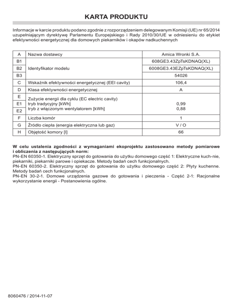 KARTA PRODUKTU Informacje w karcie produktu podano zgodnie z rozporządzeniem delegowanym Komisji (UE) nr 65/2014 uzupełniającym dyrektywę Parlamentu Europejskiego i Rady 2010/30/UE w odniesieniu do etykiet efektywności energetycznej dla domowych piekarników i okapów nadkuchennych A Nazwa dostawcy B1 B2 Identyfikator modelu B3 Wskaźnik efektywności energetycznej (EEI cavity) D Klasa efektywności energetycznej E1 E2 6008GE3.43EZpTsKDNAQ(XL) 54026 C E Amica Wronki S.A. 608GE3.43ZpTsKDNAQ(XL) Zużycie energii dla cyklu (EC electric cavity) tryb tradycyjny [kWh] tryb z włączonym wentylatorem [kWh] F Liczba komór G Źródło ciepła (energia elektryczna lub gaz) H Objętość komory [l] 106,4 A 0,99 0,88 1 V/O 66 W celu ustalenia zgodności z wymaganiami ekoprojektu zastosowano metody pomiarowe i obliczenia z następujących norm: PN‑ EN 60350‑1. Elektryczny sprzęt do gotowania do użytku domowego część 1: Elektryczne kuch‑ nie, piekarniki, piekarniki parowe i opiekacze. Metody badań cech funkcjonalnych. PN‑ EN 60350‑2. Elektryczny sprzęt do gotowania do użytku domowego część 2: Płyty kuchenne. Metody badań cech funkcjonalnych. PN‑ EN 30‑2‑1. Domowe urządzenia gazowe do gotowania i pieczenia ‑ Część 2‑1: Racjonalne wykorzystanie energii ‑ Postanowienia ogólne. 8060476 / 2014‑11‑ 07 INFORMACJE O PRODUKCIE Informacje o produkcie podano zgodnie z rozporządzeniem Komisji (UE) nr 66/2014 uzupełniającym dyrektywy Parlamentu Europejskiego i Rady 2009/125/WE w odniesieniu do wymogów dotyczących ekoprojektu dla domowych piekarników, płyt grzejnych i okapów nadkuchennych Domowe piekarniki I1 I2 608GE3.43ZpTsKDNAQ(XL) Identyfikator modelu I3 J 6008GE3.43EZpTsKDNAQ(XL) 54026 Typ piekarnika (energia elektryczna lub gaz) V/O K Masa urządzenia [kg] 45 L Liczba komór 1 M Źródło energii dla każdej komory (energia elektryczna lub gaz) N Objętość dla każdej komory V [l] O Zużycie energii koniecznej do podgrzania znormalizowanego wsadu w komorze piekarnika elektrycznego w trakcie pracy w cyklu w trybie tradycyjnym dla każdej komory (końcowa energia elektryczna) EC electric cavity [kWh/cykl] 0,99 P Zużycie energii koniecznej do podgrzania znormalizowanego wsadu w komorze piekarnika elektrycznego w trakcie pracy w cyklu w trybie z włączonym wentylatorem dla każdej komory (końcowa energia elektryczna) EC electric cavity [kWh/ cykl] 0,88 Q Wskaźnik efektywności energetycznej dla każdej komory EEI cavity 106,4 V/O 66 INFORMACJE O PRODUKCIE Informacje o produkcie podano zgodnie z rozporządzeniem Komisji (UE) nr 66/2014 uzupełniającym dyrektywy Parlamentu Europejskiego i Rady 2009/125/WE w odniesieniu do wymogów dotyczących ekoprojektu dla domowych piekarników, płyt grzejnych i okapów nadkuchennych Domowe płyty grzejne gazowe R1 R2 608GE3.43ZpTsKDNAQ(XL) Identyfikator modelu 6008GE3.43EZpTsKDNAQ(XL) R3 54026 S Typ płyty grzejnej (elektryczna / gazowa / gazowo ‑elektryczna) TT Liczba palników gazowych Y1 Y2 Y3 Y4 Z Efektywność energetyczna dla każdego palnika gazowego (EE gas burner) O/V/O 4 FL 54,5 RL 54,5 RR 54,5 FR ‑ Efektywność energetyczna płyty grzejnej gazowej (EE gas hob) 54,5