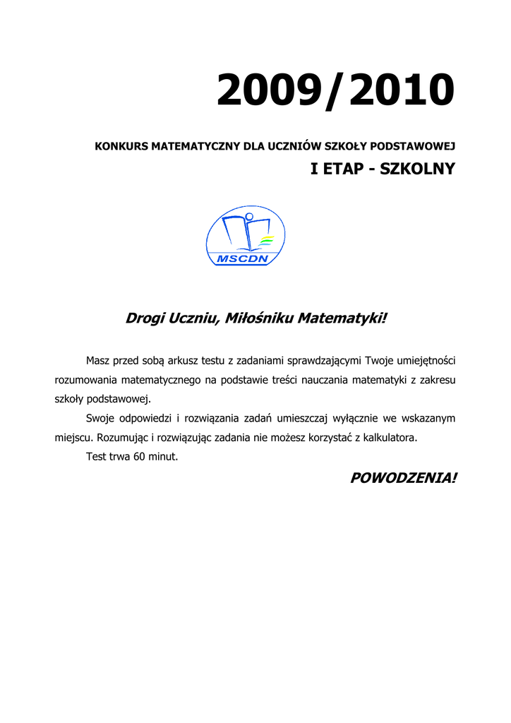 2009/2010 KONKURS MATEMATYCZNY DLA UCZNIÓW SZKOŁY PODSTAWOWEJ I ETAP - SZKOLNY Drogi Uczniu, Miłośniku Matematyki! Masz przed sobą arkusz testu z zadaniami sprawdzającymi Twoje umiejętności rozumowania matematycznego na podstawie treści nauczania matematyki z zakresu szkoły podstawowej. Swoje odpowiedzi i rozwiązania zadań umieszczaj wyłącznie we wskazanym miejscu. Rozumując i rozwiązując zadania nie możesz korzystać z kalkulatora. Test trwa 60 minut. POWODZENIA! 2 Zadanie 1. Znajdź najmniejszą liczbę naturalną, która przy dzieleniu przez każdą z liczb 4, 5, 6, 9 daje resztę 3. Rozwiązanie: Zadanie 2. Ile cyfr zużyto do ponumerowania stron w książce o 94 stronach? Rozwiązanie: 3 Zadanie 3. Malarz w ciągu dwóch godzin pracy pomalował 20% powierzchni określonej w zamówieniu. O ile procent malarz powinien przyspieszyć swą szybkość malowania, aby zakończyć całą pracę w ciągu następnych czterech godzin? Rozwiązanie: Zadanie 4. Prosta poprowadzona przez wierzchołek kwadratu dzieli go na trójkąt o polu 2 14 cm i trapez o polu 35 cm2. Oblicz długość krótszej podstawy trapezu. Rozwiązanie: 4 Zadanie 5. Kostka pachnąca lawendą ma kształt prostopadłościanu. Stosowana ochronnie w szafie ubraniowej zużywa się równomiernie. Zauważono, że po 57. dniach wymiary kostki zmniejszyły się o 1/3 w stosunku do swoich początkowych wielkości. Na ile dni wystarczy jeszcze tej kostki, jeżeli jej objętość będzie się zmniejszała w takim samym, jak dotychczas, tempie? Rozwiązanie: DZIĘKUJEMY! Brudnopis 5 Brudnopis 6 Brudnopis 7 Brudnopis