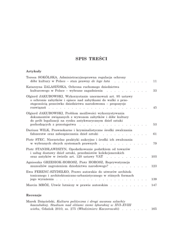 SPIS TREŒCI Artyku³y Teresa SOKÓLSKA, Administracyjnoprawna regulacja ochrony dóbr kultury w Polsce – stan prawny de lege lata . . . . . . . . . 11 Katarzyna ZALASIÑSKA, Ochrona ruchomego dziedzictwa kulturowego w Polsce – wybrane zagadnienia . . . . . . . . . . . 33 Olgierd JAKUBOWSKI, Wykorzystanie unormowañ art. 95 ustawy o ochronie zabytków i opiece nad zabytkami do walki z przestêpczoœci¹ przeciwko dziedzictwu narodowemu – propozycje rozwi¹zañ . . . . . . . . . . . . . . . . . . . . . . . . . . 45 Olgierd JAKUBOWSKI, Problem mo¿liwoœci wykorzystywania dokumentów zwi¹zanych z wywozem zabytków i dóbr kultury do prób legalizacji na rynku antykwarycznym dzie³ sztuki pochodz¹cych z przestêpstwa . . . . . . . . . . . . . . . . . . 53 Dariusz WILK, Prawnokarne i kryminalistyczne œrodki zwalczania fa³szerstw oraz zabezpieczania dzie³ sztuki . . . . . . . . . . . . 61 Piotr STEC, Nierzetelne praktyki aukcyjne i œrodki ich zwalczania w wybranych obcych systemach prawnych . . . . . . . . . . . . . 79 Piotr STANIS£AWISZYN, Opodatkowanie podatkiem od towarów i us³ug dostawy dzie³ sztuki, przedmiotów kolekcjonerskich oraz antyków w œwietle art. 120 ustawy VAT . . . . . . . . . . . 103 Agnieszka GRZESIOK-HOROSZ, Piotr HOROSZ, Reprywatyzacja muzealiów zagro¿eniem dziedzictwa narodowego? . . . . . . . . . . 123 Ewa FERENC-SZYDE£KO, Prawo autorskie do utworów architektonicznego i architektoniczno-urbanistycznego w ró¿nych formach jego wyra¿enia . . . . . . . . . . . . . . . . . . . . . . . . 139 Marcin MRÓZ, Utwór lutniczy w prawie autorskim . . . . . . . . . . 147 Recenzje Marek Dziêcielski, Kultura polityczna i drogi awansu szlachty kaszubskiej. Studium nad elitami ziemi lêborskiej w XVI–XVIII wieku, Gdañsk 2010, ss. 275 (W³odzimierz Kaczorowski) . . . . . . . 165 Sprawozdania Sprawozdanie z konferencji „Rozwój prawa w³asnoœci intelektualnej w sektorze farmaceutycznym”, Rzeszów, 25–26 marca 2010 roku (Wojciech Wróbel) . . . . . . . . . . . . . . . . . . . . . . . 171 „Instytucja mediacji w prawie polskim i jej uwarunkowania spo³eczno-psychologiczno-prawne”. Seminarium naukowe, Wydzia³ Prawa i Administracji Uniwersytetu Opolskiego, Opole, 19 paŸdziernika 2009 roku, 21 paŸdziernika 2010 roku (Hanna Duszka-Jakimko, Ewa Pierzcha³a) . . . . . . . . . . . . . . . . . . . . . . . 175 Ogólnopolska Konferencja Naukowa „Lingua Iuris”, Warszawa, 26 listopada 2010 roku (Bogna Kaczorowska) . . . . . . . . . . . 179 TABLE OF CONTENTS Articles Teresa SOKÓLSKA, The Administrative-Legal Regulations of Protection of Cultural Property in Poland – the Legal State de lege lata . . . . . . . . . . . . . . . . . . . . . . 11 Katarzyna ZALASIÑSKA, Protection of Movable Heritage in Poland – Selected Problems . . . . . . . . . . . . . . . . . . . . . . 33 Olgierd JAKUBOWSKI, Application of Art. 95 of the Monuments Protection Act as a Tool of Combatting Crimes Against National Heritage – a Case for Reform . . . . . . . . . . . . . . . . . . 45 Olgierd JAKUBOWSKI, Use of Export Documents Relating to Antiquities and Cultural Goods as a Tool to Legalize Criminal Activity in Antiquities Market . . . . . . . . . . . . . 53 Dariusz WILK, Criminal and Forensic Remedies Against Forgeries and Security Methods of Art-Works . . . . . . . . . . . . . . . 61 Piotr STEC, Unfair Auction Practices and Means of Combating Thereof in Selected Foreign Legal Systems . . . . . . . . . . . . 79 Piotr STANIS£AWISZYN, Levying VAT on Supply of Works of Art, Collector’s Items and Antiques in the Light of Art. 120 of the Act on VAT . . . . . . . . . . . . . . . . . . . . . . 103 Agnieszka GRZESIOK-HOROSZ, Piotr HOROSZ, Re-privatization of Museum Items – a Threat to the National Heritage? . . . . . . . 123 Ewa FERENC-SZYDE£KO, The Copyright Covering Works of the Architectural and Architectural-Town-Planning Character in Different Forms of Its Expression . . . . . . . . . . . . . . . 139 Marcin MRÓZ, Violin and Copyright . . . . . . . . . . . . . . . . 147 Reviews Marek Dziêcielski, Kultura polityczna i drogi awansu szlachty kaszubskiej. Studium nad elitami ziemi lêborskiej w XVI–XVIII wieku [The Political Culture and Roads of Advancement of Kashubian Nobility. A Study in the Elites of the Land of Lebork from the 16th to the 18th Century], Gdañsk 2010, pp. 275 (W³odzimierz Kaczorowski) . . . . . . . . . . . . . . . . . . . 165 Reports Report on the conference “The Development of the Intellectual Property Law in the Pharmaceutical Sector”, Rzeszów, 25–26 March 2010 (Wojciech Wróbel) . . . . . . . . . . . . . . . . . . . . . . . 171 “The Institution of Mediation in the Polish Law and Its Social, Psychological and Legal Conditionings”. A scientific seminar. Faculty of Law and Administration of Opole University, Opole, 19 October 2009, 21 October 2010 (Hanna Duszka-Jakimko, Ewa Pierzcha³a) . . . . . . . . . . . . . . . . . . . . . . . 175 All-Poland Scientific Conference “Lingua Iuris”, Warsaw, 26 November 2010 (Bogna Kaczorowska) . . . . . . . . . . . . . 179 Artyku³y