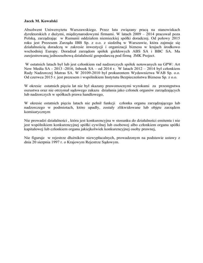 Jacek M. Kowalski Absolwent Uniwersytetu Warszawskiego. Przez lata związany pracą na stanowiskach dyrektorskich z dużymi, międzynarodowymi firmami. W latach 2009 – 2014 pracował poza Polską, zarządzając w Rumunii oddziałem niemieckiej spółki doradczej. Od połowy 2015 roku jest Prezesem Zarządu IBB Sp. z o.o. z siedzibą w Warszawie, która zajmuje się działalnością doradczą w zakresie inwestycji i organizacji biznesu w krajach środkowo wschodniej Europy. Doradzał zarządom spółek giełdowych ABS SA i BBC SA. Ma zarejestrowaną jednoosobową działalność gospodarczą pod firmą JMK Project. W ostatnich latach był lub jest członkiem rad nadzorczych spółek notowanych na GPW: Art New Media SA - 2013 -2016, Inbook SA – od 2014 r. W latach 2012 – 2014 był członkiem Rady Nadzorczej Matras SA. W 20109-2010 był prokurentem Wydawnictwa WAB Sp. o.o. Od czerwca 2015 r. jest prezesem i wspólnikiem Instytutu Bezpieczeństwa Biznesu Sp. z o.o. W okresie ostatnich pięciu lat nie był skazany prawomocnymi wyrokami za przestępstwa oszustwa oraz nie otrzymał sądowego zakazu działania jako członek organów zarządzających lub nadzorczych w spółkach prawa handlowego, W okresie ostatnich pięciu latach nie pełnił funkcji członka organu zarządzającego lub nadzorczego w podmiotach, które upadły, zostały zlikwidowane lub objęte zarządem komisarycznym Nie prowadzi działalności , która jest konkurencyjna w stosunku do działalności emitenta i nie jest wspólnikiem konkurencyjnej spółki cywilnej lub osobowej albo członkiem organu spółki kapitałowej lub członkiem organu jakiejkolwiek konkurencyjnej osoby prawnej, Nie figuruje w rejestrze dłużników niewypłacalnych, prowadzonym na podstawie ustawy z dnia 20 sierpnia 1997 r. o Krajowym Rejestrze Sądowym.