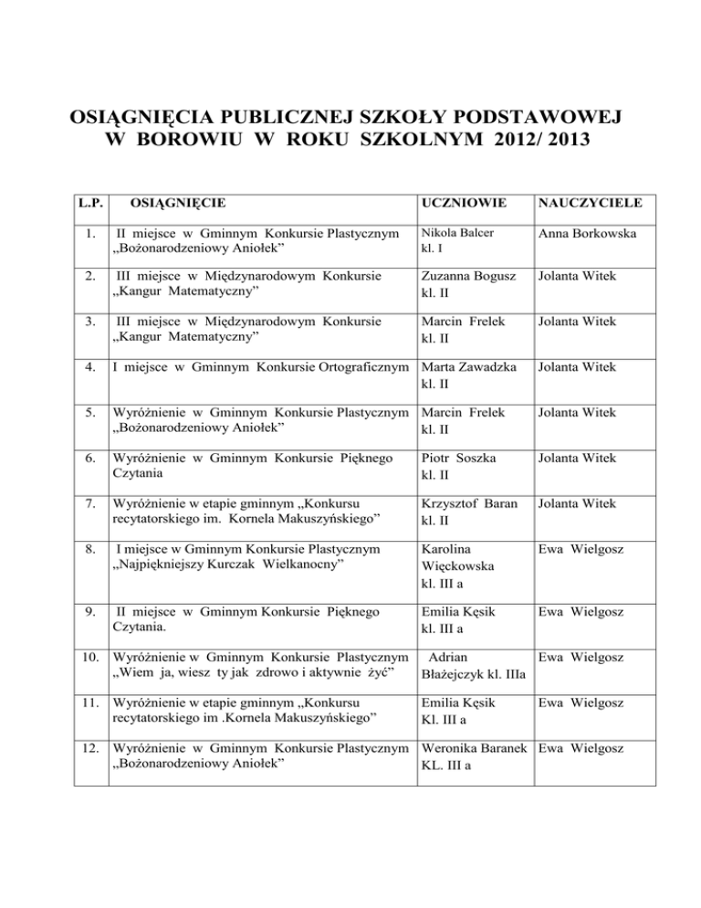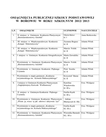 OSIĄGNIĘCIA PUBLICZNEJ SZKOŁY PODSTAWOWEJ W BOROWIU W ROKU SZKOLNYM 2012/ 2013 L.P. OSIĄGNIĘCIE UCZNIOWIE NAUCZYCIELE 1. II miejsce w Gminnym Konkursie Plastycznym „BoŜonarodzeniowy Aniołek” Nikola Balcer kl. I Anna Borkowska 2. III miejsce w Międzynarodowym Konkursie „Kangur Matematyczny” Zuzanna Bogusz kl. II Jolanta Witek 3. III miejsce w Międzynarodowym Konkursie „Kangur Matematyczny” Marcin Frelek kl. II Jolanta Witek 4. I miejsce w Gminnym Konkursie Ortograficznym Marta Zawadzka kl. II Jolanta Witek 5. WyróŜnienie w Gminnym Konkursie Plastycznym Marcin Frelek „BoŜonarodzeniowy Aniołek” kl. II Jolanta Witek 6. WyróŜnienie w Gminnym Konkursie Pięknego Czytania Piotr Soszka kl. II Jolanta Witek 7. WyróŜnienie w etapie gminnym „Konkursu recytatorskiego im. Kornela Makuszyńskiego” Krzysztof Baran kl. II Jolanta Witek 8. I miejsce w Gminnym Konkursie Plastycznym „Najpiękniejszy Kurczak Wielkanocny” Karolina Więckowska kl. III a Ewa Wielgosz 9. II miejsce w Gminnym Konkursie Pięknego Czytania. Emilia Kęsik kl. III a Ewa Wielgosz 10. WyróŜnienie w Gminnym Konkursie Plastycznym Adrian Ewa Wielgosz „Wiem ja, wiesz ty jak zdrowo i aktywnie Ŝyć” BłaŜejczyk kl. IIIa 11. WyróŜnienie w etapie gminnym „Konkursu recytatorskiego im .Kornela Makuszyńskiego” Emilia Kęsik Kl. III a Ewa Wielgosz 12. WyróŜnienie w Gminnym Konkursie Plastycznym Weronika Baranek Ewa Wielgosz „BoŜonarodzeniowy Aniołek” KL. III a Ewa Wielgosz 13. WyróŜnienie w Gminnym Konkursie Ortograficznym Emilia Kęsik Kl. III a 14. WyróŜnienie w Gminnym Konkursie Ortograficznym Weronika Baranek Ewa Wielgosz kl. III a 15. WyróŜnienie w Ogólnopolskim Konkursie Plastycznym „Gdzie były, co robiły Twoje ręce” Adrian BłaŜejczyk Ewa Wielgosz kl. III a 16. I miejsce w Gminnym Konkursie Ortograficznym Sebastian Paduch kl. III b Dorota Grzegrzółka 17. WyróŜnienie w Gminnym Konkursie Ortograficznym Mateusz Gawryś kl. III b Dorota Grzegrzółka 18. WyróŜnienie w Powiatowym Konkursie Plastycznym „Integracja pokoleń” Martyna Stułka KL. III b Dorota Grzegrzółka 19. I miejsce w Gminnym Konkursie Pięknego Czytania Zuzanna Moreń kl. III b Dorota Grzegrzółka 20. III miejsce w Gminnym Konkursie Pięknego Czytania. Amelia Rogala kl. III b Dorota Grzegrzółka 21. WyróŜnienie w Gminnym Konkursie Plastycznym Martyna Stułka „Wiem ja, wiesz ty jak zdrowo i aktywnie Ŝyć” kl. III b Dorota Grzegrzółka 22. WyróŜnienie w Gminnym Konkursie Plastycznym Oliwia Łudź „Wiem ja, wiesz ty jak zdrowo i aktywnie Ŝyć” kl. III b Dorota Grzegrzółka 23. I miejsce w Gminnym Konkursie Plastycznym „BoŜonarodzeniowy Aniołek” Amelia Rogala kl. III b Dorota Grzegrzółka 24. III miejsce w Gminnym Konkursie Plastycznym „BoŜonarodzeniowy Aniołek” Klaudia WasąŜnik Dorota Grzegrzółka kl. III b 25. WyróŜnienie w Gminnym Konkursie Plastycznym Amelia Rogala „BoŜonarodzeniowy Aniołek” kl. III b Dorota Grzegrzółka 26. WyróŜnienie w Ogólnopolskim Konkursie Plastycznym „Gdzie były, co robiły Twoje ręce” Dorota Grzegrzółka 27 Igor Kępka kl. III b III miejsce Międzynarodowym Konkursie „Kangur Dominika Gaładyk Hanna Baran Matematyczny” kl. V 28. I miejsce w Gminnym Konkursie Pięknego Czytania Alicja Borkowska kl. V Anna Gałązka 29. II miejsce w Gminnym Konkursie Pięknego Czytania Dawid Dzadz kl. VI a Anna Gałązka 30. III miejsce w Gminnym Konkursie Pięknego Czytania Dominik Kęsik kl. VI a Anna Gałązka 31. I miejsce w etapie gminnym Powiatowego Konkursu Ortograficznego i udział w etapie powiatowym Alicja Borkowska kl. V Anna Gałązka 32. I miejsce w etapie gminnym Powiatowego Konkursu Ortograficznego i udział w etapie powiatowym Weronika Płatek kl. VI b Anna Gałązka 33. I miejsce w etapie gminnym „Konkursu recytatorskiego im .Kornela Makuszyńskiego” Angelika Mikos kl. V Anna Gałązka 34. III miejsce w Gminnym Turnieju Tenisa Stołowego Małgorzata Nurzyńska kl.V Joanna Radziej 35. I miejsce w eliminacjach gminnych III Turnieju Orlika o Puchar Premiera Donalda Tuska w kategorii dziewczęta rocznik 1999/2000 Paprotki Dziewczęta 1999/2000 Joanna Radziej 36. II miejsce w eliminacjach gminnych III Turnieju Orlika o Puchar Premiera Donalda Tuska w kategorii dziewczęta rocznik 1999/2000 Orliczki Dziewczęta 1999/2000 Joanna Radziej 37. IIII miejsce w eliminacjach gminnych III Turnieju Orlika o Puchar Premiera Donalda Tuska w kategorii dziewczęta rocznik 1999/2000 Dzikie Koty Dziewczęta 2001/2002 Joanna Radziej 38. II miejsce w eliminacjach gminnych III Turnieju Orlika o Puchar Premiera Donalda Tuska w kategorii dziewczęta rocznik 1999/2000 Białe Wilki Dziewczęta 2001/2002 Joanna Radziej 39. II miejsce w eliminacjach gminnych III Turnieju Orlika o Puchar Premiera Donalda Tuska w kategorii chłopcy rocznik 1999/2000 Orliki Borowie Chłopcy 2001/2002 Nina Kurach 40. II miejsce w eliminacjach gminnych III Turnieju Orlika o Puchar Premiera Donalda Tuska w kategorii chłopcy rocznik 1999/2000 Jastrzębie Borowie Nina Kurach Chłopcy 2001/2002 41. II miejsce w eliminacjach gminnych III Turnieju Orlika o Puchar Premiera Donalda Tuska w kategorii chłopcy rocznik 1999/2000 Orły Borowie Chłopcy 1999/2000 Nina Kurach 42. II miejsce w eliminacjach gminnych III Turnieju Orlika o Puchar Premiera Donalda Tuska w kategorii chłopcy rocznik 1999/2000 Jastrzębie Borowie Nina Kurach Chłopcy 1999/2000 43. I miejsce w gminnym konkursie plastycznym „ Na najładniejszego kurczaka wielkanocnego” Angelika Mikos kl. V 44. WyróŜnienie w powiatowym konkursie plastycznym Kamila Dadz StraŜy PoŜarnej „Twoja wiedza i czujka czasu w kl.V domu – nic złego nie stanie się nikomu” Agnieszka Dzadz Agnieszka Dzadz