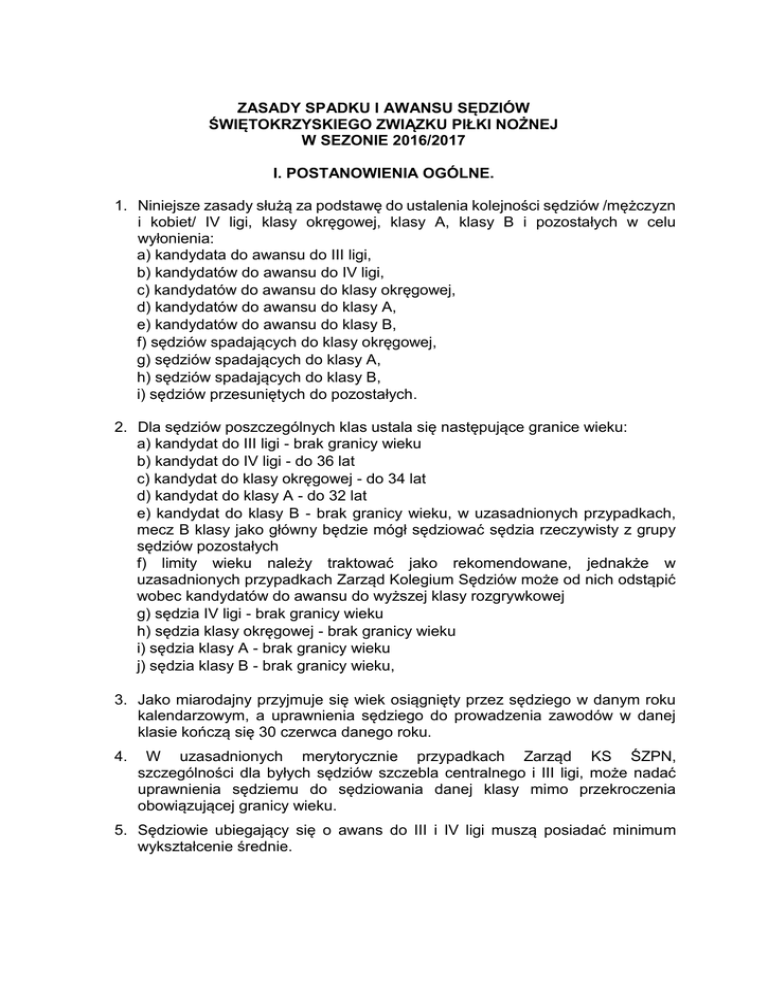 ZASADY SPADKU I AWANSU SĘDZIÓW ŚWIĘTOKRZYSKIEGO ZWIĄZKU PIŁKI NOŻNEJ W SEZONIE 2016/2017 I. POSTANOWIENIA OGÓLNE. 1. Niniejsze zasady służą za podstawę do ustalenia kolejności sędziów /mężczyzn i kobiet/ IV ligi, klasy okręgowej, klasy A, klasy B i pozostałych w celu wyłonienia: a) kandydata do awansu do III ligi, b) kandydatów do awansu do IV ligi, c) kandydatów do awansu do klasy okręgowej, d) kandydatów do awansu do klasy A, e) kandydatów do awansu do klasy B, f) sędziów spadających do klasy okręgowej, g) sędziów spadających do klasy A, h) sędziów spadających do klasy B, i) sędziów przesuniętych do pozostałych. 2. Dla sędziów poszczególnych klas ustala się następujące granice wieku: a) kandydat do III ligi - brak granicy wieku b) kandydat do IV ligi - do 36 lat c) kandydat do klasy okręgowej - do 34 lat d) kandydat do klasy A - do 32 lat e) kandydat do klasy B - brak granicy wieku, w uzasadnionych przypadkach, mecz B klasy jako główny będzie mógł sędziować sędzia rzeczywisty z grupy sędziów pozostałych f) limity wieku należy traktować jako rekomendowane, jednakże w uzasadnionych przypadkach Zarząd Kolegium Sędziów może od nich odstąpić wobec kandydatów do awansu do wyższej klasy rozgrywkowej g) sędzia IV ligi - brak granicy wieku h) sędzia klasy okręgowej - brak granicy wieku i) sędzia klasy A - brak granicy wieku j) sędzia klasy B - brak granicy wieku, 3. Jako miarodajny przyjmuje się wiek osiągnięty przez sędziego w danym roku kalendarzowym, a uprawnienia sędziego do prowadzenia zawodów w danej klasie kończą się 30 czerwca danego roku. 4. W uzasadnionych merytorycznie przypadkach Zarząd KS ŚZPN, szczególności dla byłych sędziów szczebla centralnego i III ligi, może nadać uprawnienia sędziemu do sędziowania danej klasy mimo przekroczenia obowiązującej granicy wieku. 5. Sędziowie ubiegający się o awans do III i IV ligi muszą posiadać minimum wykształcenie średnie. a) Ponadto sędziowie powinni wykazywać się następującymi cechami: odpowiednią sprawnością fizyczną i kondycyjną, zgodnie z ustalonymi kryteriami w tym zakresie, b) odznaczać się nienaganną postawą etyczno - moralną (przestrzegać zapisów zawartych w Sędziowskim Kodeksie Etycznym), c) działać aktywnie w macierzystej organizacji sędziowskiej, szczególnie w zakresie szkolenia, d) bardzo dobrą znajomością Przepisów Gry w Piłkę Nożną i umiejętnością ich interpretacji, e) osiągać pozytywne oceny na prowadzonych zawodach, f) nie może być pracownikiem ani działaczem społecznym żadnego klubu sportowego posiadającego sekcję piłki nożnej uczestniczącego w rozgrywkach organizowanych przez ŚZPN chyba, że Zarząd ŚZPN wyrazi zgodę w indywidualnych przypadkach, g) przestrzegać regulaminów KS ŚZPN, ŚZPN i PZPN. 6. Zarząd KS ŚZPN może nakładać na sędziów dodatkowe zadania szkoleniowe, jak m.in. przesyłanie samooceny po przeprowadzonych przez siebie zawodach czy udział w szkoleniu korespondencyjnym. Niewykonanie obowiązków w wyznaczonych terminach może powodować wstrzymanie sędziego w obsadzie zawodów. 7. Ustala się następującą liczbę sędziów IV ligi, klasy okręgowej, A i B na sezon 2016/2017: a) IV liga - maksymalnie do 20 b) klasa okręgowa - maksymalnie do 18, c) klasa A - maksymalnie do 22 d) klasa B - maksymalnie do 22 8. Przy zakwalifikowaniu sędziów do poszczególnych klas rozgrywkowych będą brane pod uwagę: a) lista klasyfikacyjna powstała na podstawie wyników egzaminów teoretycznych, sprawnościowych, praktycznych, b) obecność na szkoleniach, c) możliwość dalszego rozwoju sędziego na danym szczeblu rozgrywek, d) dotychczasowe dokonania sędziego, e) zapisy Konwencji Sędziowskiej UEFA, która stanowi integralną część działalności każdego Kolegium Sędziów, które działa w ramach Federacji przyjętej do Konwencji. 9. Awanse i spadki sędziów następują po zakończeniu całego sezonu rozgrywkowego (z zastrzeżeniem, że sędziowie, którzy otrzymają od obserwatorów ocenę „7,4” i niższą zostaną w następnym meczu zostaną poddani obserwacji komisyjnej). 10. Dopuszcza się spadki w trakcie sezonu jeżeli sędzia uchyla się od swoich obowiązków i prezentuje niesatysfakcjonujący poziom prowadzenia zawodów. 11. Dopuszcza się awanse w trakcie sezonu tj. po zakończeniu pierwszej rundy rozgrywkowej dla sędziów perspektywicznych i prezentujących bardzo wysoką formę. 12. Dopuszcza się jednorazowe awanse o więcej niż jedną klasę rozgrywkową, w przypadku szczególnych predyspozycji sędziego do prowadzenia zawodów w szczególności dla sędziów, dla których PZPN przyjmuje szybką ścieżkę rozwoju. 13. Dopuszcza się do delegowanie sędziów perspektywicznych, obserwowanych pod kątem awansu przez Zarząd KS ŚZPN, na zawody klasy szczebel wyższej niż maksymalne obecne uprawnienia sędziego. Zawody takie powinny być obserwowane przez obserwatora –członka Zarządu lub Komisji Szkoleniowej KS ŚZPN oraz w miarę możliwości nagrywane przy pomocy kamery. 14. W uzasadnionych przypadkach Zarząd KS ŚZPN ma prawo delegować sędziów na mecze wyższej klasy, niż nominalnie im przysługująca w danym sezonie. 15. Decyzje w sprawach awansów i spadków, o których mowa w pkt. 10-12 Zarząd KS ŚZPN podejmuje każdorazowo biorąc pod uwagę takie kryteria jak: a) poziom prowadzonych zawodów prezentowany przez sędziego, b) osobowość, dyspozycyjność, perspektywy rozwoju, znajomość języków obcych, kwestie administracyjne, c) zaliczenie odpowiednich testów kondycyjnych i teoretycznych, d) obecność na szkoleniach, e) średnia z obserwacji nie stanowi jedynego kryterium przy decyzjach o awansach/spadkach. W zakresie zaszeregowania sędziów z programu mentorskiego Zarząd KS ŚZPN podejmuje decyzję wspierając się opinią Przewodniczącego Programu Mentorskiego. 16. W przypadku sędziego asystenta, który otr