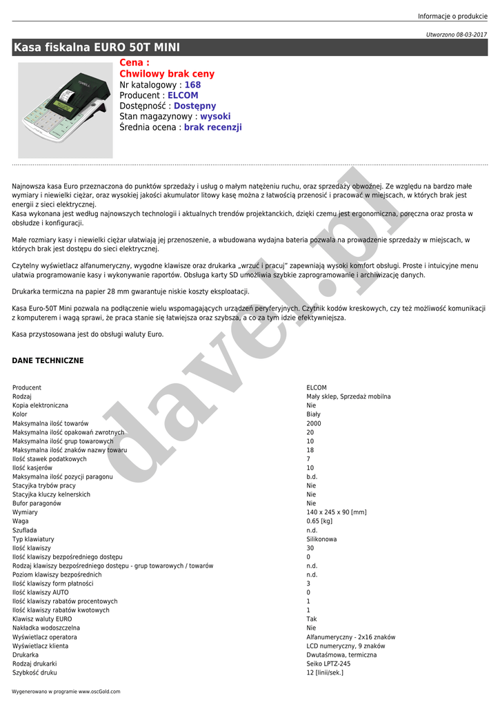 Informacje o produkcie Utworzono 08-03-2017 Kasa fiskalna EURO 50T MINI Cena : Chwilowy brak ceny Nr katalogowy : 168 Producent : ELCOM Dostępność : Dostępny Stan magazynowy : wysoki Średnia ocena : brak recenzji l Najnowsza kasa Euro przeznaczona do punktów sprzedaży i usług o małym natężeniu ruchu, oraz sprzedaży obwoźnej. Ze względu na bardzo małe wymiary i niewielki ciężar, oraz wysokiej jakości akumulator litowy kasę można z łatwością przenosić i pracować w miejscach, w których brak jest energii z sieci elektrycznej. Kasa wykonana jest według najnowszych technologii i aktualnych trendów projektanckich, dzięki czemu jest ergonomiczna, poręczna oraz prosta w obsłudze i konfiguracji. .p Małe rozmiary kasy i niewielki ciężar ułatwiają jej przenoszenie, a wbudowana wydajna bateria pozwala na prowadzenie sprzedaży w miejscach, w których brak jest dostępu do sieci elektrycznej. Czytelny wyświetlacz alfanumeryczny, wygodne klawisze oraz drukarka „wrzuć i pracuj” zapewniają wysoki komfort obsługi. Proste i intuicyjne menu ułatwia programowanie kasy i wykonywanie raportów. Obsługa karty SD umożliwia szybkie zaprogramowanie i archiwizację danych. Drukarka termiczna na papier 28 mm gwarantuje niskie koszty eksploatacji. ve l Kasa Euro-50T Mini pozwala na podłączenie wielu wspomagających urządzeń peryferyjnych. Czytnik kodów kreskowych, czy też możliwość komunikacji z komputerem i wagą sprawi, że praca stanie się łatwiejsza oraz szybsza, a co za tym idzie efektywniejsza. Kasa przystosowana jest do obsługi waluty Euro. DANE TECHNICZNE da Producent Rodzaj Kopia elektroniczna Kolor Maksymalna ilość towarów Maksymalna ilość opakowań zwrotnych Maksymalna ilość grup towarowych Maksymalna ilość znaków nazwy towaru Ilość stawek podatkowych Ilość kasjerów Maksymalna ilość pozycji paragonu Stacyjka trybów pracy Stacyjka kluczy kelnerskich Bufor paragonów Wymiary Waga Szuflada Typ klawiatury Ilość klawiszy Ilość klawiszy bezpośredniego dostępu Rodzaj klawiszy bezpośredniego dostępu - grup towarowych / towarów Poziom klawiszy bezpośrednich Ilość klawiszy form płatności Ilość klawiszy AUTO Ilość klawiszy rabatów procentowych Ilość klawiszy rabatów kwotowych Klawisz waluty EURO Nakładka wodoszczelna Wyświetlacz operatora Wyświetlacz klienta Drukarka Rodzaj drukarki Szybkość druku Wygenerowano w programie www.oscGold.com ELCOM Mały sklep, Sprzedaż mobilna Nie Biały 2000 20 10 18 7 10 b.d. Nie Nie Nie 140 x 245 x 90 [mm] 0.65 [kg] n.d. Silikonowa 30 0 n.d. n.d. 3 0 1 1 Tak Nie Alfanumeryczny - 2x16 znaków LCD numeryczny, 9 znaków Dwutaśmowa, termiczna Seiko LPTZ-245 12 [linii/sek.] b.d. 18 28mm 1xUSB, (Opcja-2xRS-232) Komputer, waga, czytnik Nie Zasilacz 230V 50Hz/ 12V DC 1 A Pakiet akumulatorowy Li-ION 1800 mAh / 7,2V b.d. 0°C ~ 45°C 30% ~ 85%, bez kondensacji pary wodnej 1 rok 5 lat da ve l .p l Trwałość drukarki Ilość znaków w linii Papier Złącza komunikacyjne Urządzenie współpracujące Komunikacja w tle Zasilanie sieciowe Akumulator główny Pobór mocy Temperatura Wilgotność Gwarancja Gwarancja na moduł fiskalny