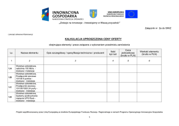 „Dotacje na innowacje - Inwestujemy w Waszą przyszłość” Załącznik nr 2a do SIWZ ( pieczęć adresowa Wykonawcy) KALKULACJA UPROSZCZONA CENY OFERTY obejmująca elementy i prace związane z wykonaniem przedmiotu zamówienia Lp. Nazwa elementu Opis szczegółowy / specyfikacja techniczna / producent Ilość kpl /szt Cena jednostkowa (brutto w PLN) Wartość elementu (brutto w PLN) 1 2 3 4 5 6 1.A 1.B 1.C 1.D Warstwa szkieletowa, radiolinia 100 Mb/s. dostawa i instalacja Warstwa szkieletowa, Przełączniki sieciowe 10/100 8 portów dostawa i instalacja Warstwa szkieletowa, Przełącznik sieciowy 10/100/1000 24 porty dostawa i instalacja Warstwa szkieletowa, Systemy podtrzymania napięcia UPS Rack dostawa i instalacja Projekt współfinansowany przez Unię Europejską ze środków Europejskiego Funduszu Rozwoju Regionalnego w ramach Programu Operacyjnego Innowacyjna Gospodarka 1 „Dotacje na innowacje - Inwestujemy w Waszą przyszłość” Lp. 1.E 1.F 1.G 2.A 2.B 2.C 2.D 2.E Nazwa elementu Opis szczegółowy / specyfikacja techniczna / producent Ilość kpl /szt Cena jednostkowa (brutto w PLN) Wartość elementu (brutto w PLN) Warstwa szkieletowa, Routery typu A dostawa i instalacja Warstwa szkieletowa, Routery typu Bdostawa i instalacja Wykonanie infrastruktury teletechnicznej dla węzłów szkieletowych Warstwa dystrybucyjna sieci, radiolinie systemu WiFi - dostawa i instalacja Warstwa dystrybucyjna sieci- przełączniki sieciowe 10/100 8 portów dostawa i instalacja Warstwa dystrybucyjna sieci- Systemy podtrzymania napięcia UPS Rack - dostawa i instalacja Warstwa dystrybucyjna sieci- Routery typu A dostawa i instalacja Wykonanie infrastruktury teletechnicznej dla warstwy dystrybucyjnej Projekt współfinansowany przez Unię Europejską ze środków Europejskiego Funduszu Rozwoju Regionalnego w ramach Programu Operacyjnego Innowacyjna Gospodarka 2 „Dotacje na innowacje - Inwestujemy w Waszą przyszłość” Lp. 3.A 3.B 3.C 3.D 3.E 3.F 3.G 3.H Nazwa elementu Opis szczegółowy / specyfikacja techniczna / producent Ilość kpl /szt Cena jednostkowa (brutto w PLN) Wartość elementu (brutto w PLN) Warstwa dostępowa sieci Stacja kliencka WiFi dostawa i instalacja stacji Warstwa dostępowa sieci Stacje dostępowe trzysektorowe systemu WiFi - dostawa i instalacja stacji Warstwa dostępowa sieci Stacja dostępowa dookólna systemu WiFI - dostawa i instalacja stacji Warstwa dostępowa sieci Kontroler sieci WLAN z licencjami - dostawa i instalacja Warstwa dostępowa sieci Przełącznik sieciowe 10/100 8 portów - dostawa i instalacja Warstwa dostępowa sieci Routery typu A - dostawa i instalacja Warstwa dostępowa sieci, systemy podtrzymania napiecia UPS RACK – dostawa i instalacja Warstwa dostępowa sieciradiolinie systemu WiFi dostawa i instalacja Projekt współfinansowany przez Unię Europejską ze środków Europejskiego Funduszu Rozwoju Regionalnego w ramach Programu Operacyjnego Innowacyjna Gospodarka 3 „Dotacje na innowacje - Inwestujemy w Waszą przyszłość” Lp. 3.I 4.A 4.B 5.A 5.B 5.C 5.D 5.E Nazwa elementu Opis szczegółowy / specyfikacja techniczna / producent Ilość kpl /szt Cena jednostkowa (brutto w PLN) Wartość elementu (brutto w PLN) Wykonanie infrastruktury teletechnicznej dla sieci dostępowej Główny węzeł szkieletowyradiolinia systemu WiFi Główny węzeł szkieletowy – kompleksowy system zabezpieczeń sieci Centrum Zarządzania Siecią – System zarządzania siecią -dostawa i instalacja Centrum Zarządzania Siecią – System zarządzania stacjami roboczymi dostawa i instalacja Centrum Zarządzania Siecią – system podtrzymania zasilania UPS dostarczenie i uruchomienie Centrum Zarządzania Siecią – przełącznik sieciowy 8 portów 10/100 dostarczenie i uruchomienie Centrum Zarządzania Siecią – radiolinia 20Mbps dostarczenie i uruchomienie Projekt współfinansowany przez Unię Europejską ze środków Europejskiego Funduszu Rozwoju Regionalnego w ramach Programu Operacyjnego Innowacyjna Gospodarka 4 „Dotacje na innowacje - Inwestujemy w Waszą przyszłość” Lp. Nazwa elementu 6.C Centrum Zarządzania Siecią – router typu A dostarczenie i uruchomienie Centrum Zarządzania Siecią – Wykonanie infrastruktury teletechnicznej Urządzenia Informatyczne – komputery typu A z monitorami – dostawa Urządzenia Informatyczne – komputery typu B z monitorami - dostawa Urządzenia Informatyczne – drukarki typu A – dostawa 6.D Urządzenia Informatyczne – drukarki typu B – dostawa 5.F 5.G 6.A 6.B 7 8 9 Opis szczegółowy / specyfikacja techniczna / producent Ilość kpl /szt Cena jednostkowa (brutto w PLN) Wartość elementu (brutto w PLN) Konfiguracja i uruchomienie radiowej sieci szerokopasmowej Wykonanie dokumentacji wykonawczej i powykonawczej Pozostałe koszty, w tym m.in. transportu, serwisu gwarancyjnego, uzyskania pozwoleń Projekt współfinansowany przez Unię Europejską ze środków Europejskiego Funduszu Rozwoju Regionalnego w ramach Programu Operacyjnego Innowacyjna Gospodarka 5 „Dotacje na innowacje - Inwestujemy w Waszą przyszłość” Lp. Nazwa elementu Opis szczegółowy / specyfikacja techniczna / producent Ilość kpl /szt Cena jednostkowa (brutto w PLN) Wartość elementu (brutto w PLN) CENA OFERTY ( SUMA POZYCJI ponumerowanych w kolumnie 6) NALEŻNY PODATEK VAT CENA OFERTY BRUTTO ………………………………….. ............................................. (miejsce, data) (podpis i pieczęć imienna upoważnionego przedstawiciela Wykonawcy) Projekt współfinansowany przez Unię Europejską ze środków Europejskiego Funduszu Rozwoju Regionalnego w ramach Programu Operacyjnego Innowacyjna Gospodarka 6