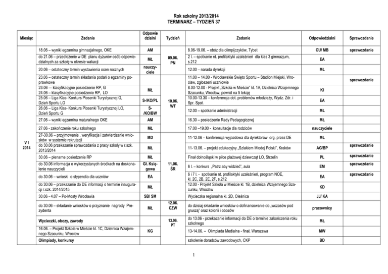 Rok szkolny 2013/2014 TERMINARZ – TYDZIEŃ 37 Miesiąc Zadanie 18.06 – wyniki egzaminu gimnazjalnego, OKE do 21.06 – przedłożenie w DE planu dyżurów osób odpowiedzialnych za szkołę w okresie wakacji 20.06 – ostateczny termin wystawienia ocen rocznych 23.06 – ostateczny termin składania podań o egzaminy poprawkowe 23.06 -– klasyfikacyjne posiedzenie RP, G 24.06 – klasyfikacyjne posiedzenie RP, LO 25.06 – Liga Klas- Konkurs Piosenki Turystycznej G, Dzień Sportu LO 26.06 – Liga Klas- Konkurs Piosenki Turystycznej LO, Dzień Sportu G VI 2014 Odpowie dzialni Tydzień Zadanie Odpowiedzialni Sprawozdanie CU/ MB sprawozdanie AM 8.06-19.06. – obóz dla olimpijczyków, Tybet MŁ 2 l. – spotkanie nt. profilaktyki uzależnień dla klas 3 gimnazjum, s.212 EA 12.00 – narada dyrekcji MŁ 09.06. PN nauczyciele MŁ S-/KO/PL S/KO/BW 10.06. WT 11.00 – 14.00 - Wrocławskie Święto Sportu – Stadion Miejski, Wrocław, zgłoszeni uczniowie 8.00-12.00 - Projekt „Szkoła w Mieście” kl. 1A, Dzielnica Wzajemnego Szacunku, Wrocław, powrót na 5 lekcję 10.00-13.30 – konferencja dot. problemów młodzieży, Wydz. Zdr. i Spr. Społ. sprawozdanie KI EA 12.00 – spotkanie administracji MŁ 27.06 – wyniki egzaminu maturalnego OKE AM 16.30 – posiedzenie Rady Pedagogicznej MŁ 27.06 - zakończenie roku szkolnego MŁ 17.00 –19.00 - konsultacje dla rodziców nauczyciele MD 11-12.06 – konferencja wyjazdowa dla dyrektorów org. przez DE MŁ MŁ 11-13.06. – projekt edukacyjny „Szlakiem Młodej Polski”, Kraków AG/BP MŁ Finał dolnośląski w piłce plażowej dziewcząt LO, Strzelin PL 6 l. – konkurs „Patrz aby widzieć”, aula EM 27-30.06 – przyjmowanie , weryfikacja i zatwierdzanie wniosków w systemie rekrutacji do 30.06 przekazanie sprawozdania z pracy szkoły w r.szk. 2013/2014 30.06 – plenarne posiedzenie RP do 30.06 informacja o wykorzystanych środkach na doskonalenie nauczycieli Gł. Księgowa do 30.06 – wnioski o stypendia dla uczniów EA do 30.06 – przekazanie do DE informacji o terminie inauguracji r.szk. 2014/2015 MŁ 30.06 - 4.07 – Po-Mosty Wrocławia do 30.06 – składanie wniosków o przyznanie nagrody Prezydenta Olimpiady, konkursy 6 i 7 l. - spotkanie nt. profilaktyki uzależnień, program NOE, kl. 2C, 2B, 2E, 2F, s.212 12.00 - Projekt Szkoła w Mieście kl. 1B, dzielnica Wzajemnego Szacunku, Wrocław SB/ SM MŁ Wycieczka regionalna kl. 2D, Oleśnica 12.06. CZW 13.06. PT Wycieczki, obozy, zawody 16.06. – Projekt Szkoła w Mieście kl. 1C, Dzielnica Wzajemnego Szacunku, Wrocław 11.06. ŚR KG do dzisiaj składanie wniosków o dofinansowanie do „wczasów pod gruszą” oraz kolonii i obozów EA KD JJ/ KA pracownicy do 13.06 - przekazanie informacji do DE o terminie zakończenia roku szkolnego MŁ 13-14.06. – Olimpiada Medialna - finał, Warszawa MW szkolenie doradców zawodowych, CKP BD 1 sprawozdanie sprawozdanie sprawozdanie sprawozdanie Miesiąc Zadanie Odpowie dzialni Tydzień Zadanie 18.00 – Bal Gimnazjalistów, internat 14.06. SB 2 Odpowiedzialni Sprawozdanie
