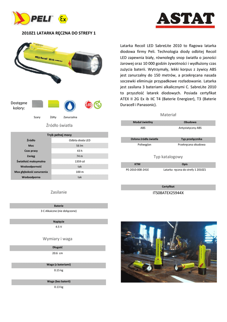 2010Z1 LATARKA RĘCZNA DO STREFY 1 Latarka Recoil LED SabreLite 2010 to flagowa latarka diodowa firmy Peli. Technologia diody odbitej Recoil LED zapewnia biały, równoległy snop światła o jasności żarowej oraz 10 000 godzin żywotności i wydłużony czas zużycia baterii. Wytrzymały, lekki korpus z żywicy ABS jest zanurzalny ny do 150 metrów, a przekręcana nasada soczewki eliminuje przypadkowe rozładowanie. Latarka jest zasilana 3 bateriami alkalicznymi C. SabreLite 2010 to przyszłość latarek diodowych. Posiada certyfikat ATEX II 2G Ex ib IIC T4 (Baterie Energizer), T3 (Baterie (Bateri Duracell i Panasonic). Dostępne kolory: Szary Żółty Materiał Zanurzalna Źródło światła Moduł świetlny Obudowa ABS Antystatyczny ABS Tryb pełnej mocy Źródło Odbita dioda LED Osłona źródła światła Typ przełącznika Moc 56 lm Poliwęglan Przekręcana obudowa Czas pracy 43 h Zasięg 74 m Światłość maksymalna 1359 cd Wodoodporność tak Max głębokość zanurzenia 100 m Wodoodporna tak Typ katalogowy KTM Opis PE-2010-000-241E Latarka ręczna do strefy 1 2010Z1 Certyfikat Zasilanie Baterie 3 C Alkaiczne (nie dołączone) Napięcie 4.5 V Wymiary i waga Długość 20.6 cm Waga (z bateriami) 0.15 kg Waga (bez baterii) 0.13 kg ITS08ATEX25944X