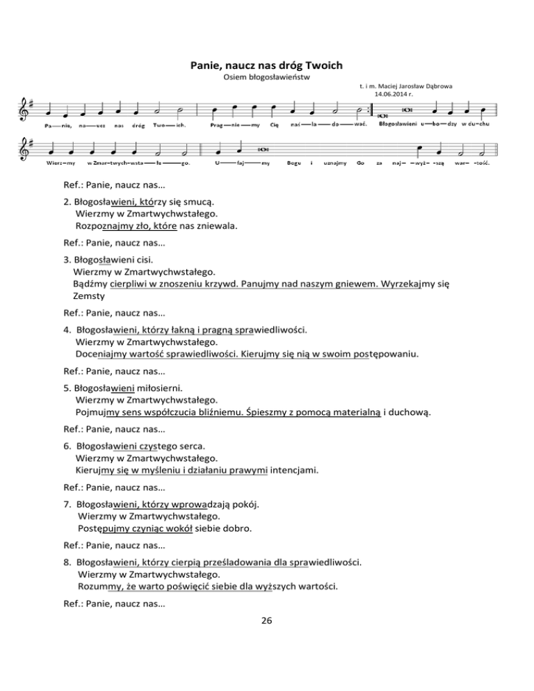 Panie, naucz nas dróg Twoich Osiem błogosławieństw t. i m. Maciej Jarosław Dąbrowa 14.06.2014 r. Ref.: Panie, naucz nas… 2. Błogosławieni, którzy się smucą. Wierzmy w Zmartwychwstałego. Rozpoznajmy zło, które nas zniewala. Ref.: Panie, naucz nas… 3. Błogosławieni cisi. Wierzmy w Zmartwychwstałego. Bądźmy cierpliwi w znoszeniu krzywd. Panujmy nad naszym gniewem. Wyrzekajmy się Zemsty Ref.: Panie, naucz nas… 4. Błogosławieni, którzy łakną i pragną sprawiedliwości. Wierzmy w Zmartwychwstałego. Doceniajmy wartość sprawiedliwości. Kierujmy się nią w swoim postępowaniu. Ref.: Panie, naucz nas… 5. Błogosławieni miłosierni. Wierzmy w Zmartwychwstałego. Pojmujmy sens współczucia bliźniemu. Śpieszmy z pomocą materialną i duchową. Ref.: Panie, naucz nas… 6. Błogosławieni czystego serca. Wierzmy w Zmartwychwstałego. Kierujmy się w myśleniu i działaniu prawymi intencjami. Ref.: Panie, naucz nas… 7. Błogosławieni, którzy wprowadzają pokój. Wierzmy w Zmartwychwstałego. Postępujmy czyniąc wokół siebie dobro. Ref.: Panie, naucz nas… 8. Błogosławieni, którzy cierpią prześladowania dla sprawiedliwości. Wierzmy w Zmartwychwstałego. Rozummy, że warto poświęcić siebie dla wyższych wartości. Ref.: Panie, naucz nas… 26