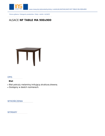 www.nowystyl.pl/produkty/stoly-i-stoliki/ALSACE/ALSACE-NF-TABLE-MA-900x900 Strona główna / Kategorie produktów / Stoły i stoliki / ALSACE ALSACE NF TABLE MA 900x900 OPIS Blat ● ● Blat pokryty melaminą imitującą strukturę drewna. Dostępny w dwóch rozmiarach. WYKOŃCZENIA WYMIARY Pasujące blaty: ● ● ● ● Blaty fornirowane: φ600, φ800 mm. Blaty melaminowe TOP 36, TOP 50: φ600, φ800 mm. Blaty melaminowe: φ600, φ800 mm. Blaty Topalit: φ600, φ800 mm. Wszelkie prawa zastrzeżone © 2013 Grupa Nowy Styl KONTAKT Nowy Styl Sp. z o.o. Pużaka 49 38-400 Krosno Infolinia: 0801 177-291 Tel. 13 43 76 100 Fax: 13 43 62 732 [email protected] www.nowystyl.com Dział Sprzedaży Krajowej Pużaka 49 38-400 Krosno Tel. 13 43 76 100 Dział Marketingu Warszawska 15 32-086 Węgrzce Tel. 12 63 98 602