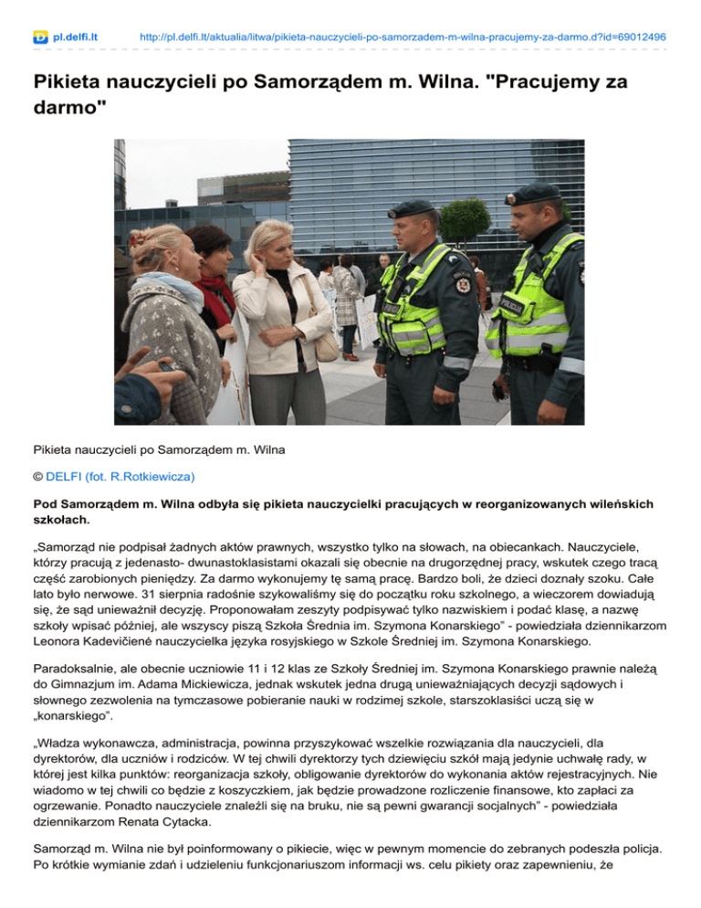 pl.delfi.lt http://pl.delfi.lt/aktualia/litwa/pikieta-nauczycieli-po-samorzadem-m-wilna-pracujemy-za-darmo.d?id=69012496 Pikieta nauczycieli po Samorządem m. Wilna. "Pracujemy za darmo" Pikieta nauczycieli po Samorządem m. Wilna © DELFI (fot. R.Rotkiewicza) Pod Samorządem m. Wilna odbyła się pikieta nauczycielki pracujących w reorganizowanych wileńskich szkołach. „Samorząd nie podpisał żadnych aktów prawnych, wszystko tylko na słowach, na obiecankach. Nauczyciele, którzy pracują z jedenasto- dwunastoklasistami okazali się obecnie na drugorzędnej pracy, wskutek czego tracą część zarobionych pieniędzy. Za darmo wykonujemy tę samą pracę. Bardzo boli, że dzieci doznały szoku. Całe lato było nerwowe. 31 sierpnia radośnie szykowaliśmy się do początku roku szkolnego, a wieczorem dowiadują się, że sąd unieważnił decyzję. Proponowałam zeszyty podpisywać tylko nazwiskiem i podać klasę, a nazwę szkoły wpisać później, ale wszyscy piszą Szkoła Średnia im. Szymona Konarskiego” - powiedziała dziennikarzom Leonora Kadevičienė nauczycielka języka rosyjskiego w Szkole Średniej im. Szymona Konarskiego. Paradoksalnie, ale obecnie uczniowie 11 i 12 klas ze Szkoły Średniej im. Szymona Konarskiego prawnie należą do Gimnazjum im. Adama Mickiewicza, jednak wskutek jedna drugą unieważniających decyzji sądowych i słownego zezwolenia na tymczasowe pobieranie nauki w rodzimej szkole, starszoklasiści uczą się w „konarskiego”. „Władza wykonawcza, administracja, powinna przyszykować wszelkie rozwiązania dla nauczycieli, dla dyrektorów, dla uczniów i rodziców. W tej chwili dyrektorzy tych dziewięciu szkół mają jedynie uchwałę rady, w której jest kilka punktów: reorganizacja szkoły, obligowanie dyrektorów do wykonania aktów rejestracyjnych. Nie wiadomo w tej chwili co będzie z koszyczkiem, jak będzie prowadzone rozliczenie finansowe, kto zapłaci za ogrzewanie. Ponadto nauczyciele znaleźli się na bruku, nie są pewni gwarancji socjalnych” - powiedziała dziennikarzom Renata Cytacka. Samorząd m. Wilna nie był poinformowany o pikiecie, więc w pewnym momencie do zebranych podeszła policja. Po krótkie wymianie zdań i udzieleniu funkcjonariuszom informacji ws. celu pikiety oraz zapewnieniu, że nauczyciele znają wszelkie regulacje prawne dotyczące liczby osób, odległości itp. policjanci zostawili zebranych w spokoju. „Mamy lekcje w młodszych klasach w Szkole Konarskiego, a według rekomendacji samorządu, żeby uczyć starsze klasy powinniśmy zatrudnić się w innej szkole, ale to już będzie drugorzędna praca, a na tym tracimy finansowo. Ponadto umowa jest na rok i po tym czasie nie wiemy co dalej będzie. A w końcu nie wiadomo jak to wpłynie na emeryturę” - powiedziała dziennikarzom Olga Jurkevičienė. Kolejnym paradoksem jest to, że nie wiadomo kto jest odpowiedzialny, jeśli uczniom coś się stanie, gdyż oficjalnie są zarejestrowani w „mickiewiczówce”, a uczą się w „konarskiego”. Nauczyciele wystosowali do mera Wilna Remigijusa Šimašiusa petycję, w której między innymi żądają: „Sprzeciwiamy się pracować u różnych pracodawców według dwóch umów o pracę (jedna z nich terminowa), prawnie być zależnymi od dwóch placówek oświatowych. Ponadto nauczyciel, biegając z jednej szkoły do drugiej, straci czas, który musiałby przeznaczyć na jakościowe i efektywne kształcenie uczniów, szykowanie się do lekcji itd. Taka dwuznaczna sytuacja nie może trwać dalej. Domagamy się, aby podał się do dymisji zastępca dyrektora administracji, kurujący dziedzinę oświaty, Rokas Uscila”.