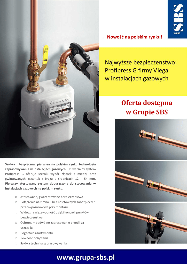 Nowość na polskim rynku! Oferta dostępna w Grupie SBS Szybka i bezpieczna, pierwsza na polskim rynku technologia zaprasowywania w instalacjach gazowych. Uniwersalny system Profipress G oferuje szeroki wybór złączek z miedzi, oraz gwintowanych kształtek z brązu o średnicach 12 – 54 mm. Pierwszy atestowany system dopuszczony do stosowania w instalacjach gazowych na polskim rynku. • Atestowane, gwarantowane bezpieczeństwo • Połączenia na zimno – bez kosztownych zabezpieczeń przeciwpożarowych przy montażu • Widoczna niezawodność dzięki kontroli punktów bezpieczeństwa • Ochrona – podwójne zaprasowanie przed i za uszczelką • Bogactwo asortymentu • Pewność połączenia • Szybka technika zaprasowywania