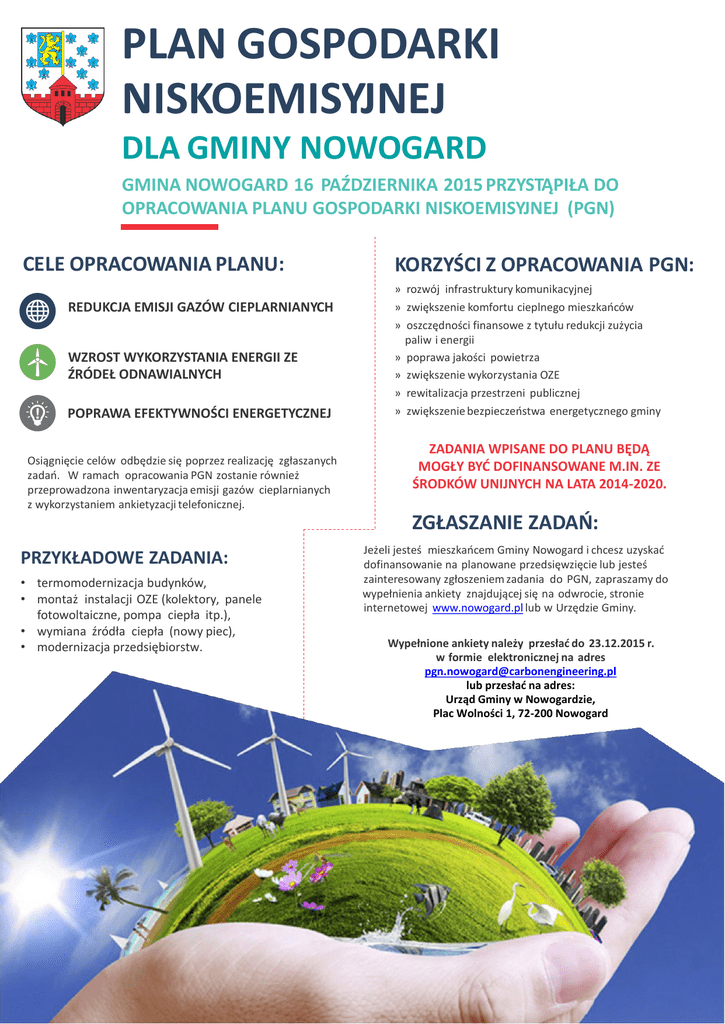 PLAN GOSPODARKI NISKOEMISYJNEJ DLA GMINY NOWOGARD GMINA NOWOGARD 16 PAŹDZIERNIKA 2015 PRZYSTĄPIŁA DO OPRACOWANIA PLANU GOSPODARKI NISKOEMISYJNEJ (PGN) CELE OPRACOWANIA PLANU: REDUKCJA EMISJI GAZÓW CIEPLARNIANYCH WZROST WYKORZYSTANIA ENERGII ZE ŹRÓDEŁ ODNAWIALNYCH POPRAWA EFEKTYWNOŚCI ENERGETYCZNEJ Osiągnięcie celów odbędzie się poprzez realizację zgłaszanych zadań. W ramach opracowania PGN zostanie również przeprowadzona inwentaryzacja emisji gazów cieplarnianych z wykorzystaniem ankietyzacji telefonicznej. KORZYŚCI Z OPRACOWANIA PGN: » rozwój infrastruktury komunikacyjnej » zwiększenie komfortu cieplnego mieszkańców » oszczędności finansowe z tytułu redukcji zużycia paliw i energii » poprawa jakości powietrza » zwiększenie wykorzystania OZE » rewitalizacja przestrzeni publicznej » zwiększenie bezpieczeństwa energetycznego gminy ZADANIA WPISANE DO PLANU BĘDĄ MOGŁY BYĆ DOFINANSOWANE M.IN. ZE ŚRODKÓW UNIJNYCH NA LATA 2014-2020. ZGŁASZANIE ZADAŃ: PRZYKŁADOWE ZADANIA: • termomodernizacja budynków, • montaż instalacji OZE (kolektory, panele fotowoltaiczne, pompa ciepła itp.), • wymiana źródła ciepła (nowy piec), • modernizacja przedsiębiorstw. Jeżeli jesteś mieszkańcem Gminy Nowogard i chcesz uzyskać dofinansowanie na planowane przedsięwzięcie lub jesteś zainteresowany zgłoszeniem zadania do PGN, zapraszamy do wypełnienia ankiety znajdującej się na odwrocie, stronie internetowej www.nowogard.pl lub w Urzędzie Gminy. Wypełnione ankiety należy przesłać do 23.12.2015 r. w formie elektronicznej na adres [email protected] lub przesłać na adres: Urząd Gminy w Nowogardzie, Plac Wolności 1, 72-200 Nowogard ANKIETA - ZADANIA DO PLANU GOSPODARKI NISKOEMISYJNEJ DLA GMINY NOWOGARD Zgłoszenie zadania nie obliguje do jego realizacji 1. Czy jest Pan/Pani zainteresowany/a wymianą ogrzewania na bardziej energooszczędne? (proszę zaznaczyć jedną odpowiedź) Nie Tak, tylko w przypadku dofinansowania Tak 2. Na wykorzystanie jakiego źródła ciepła zdecydowałby/ała się Pan/Pani (w przypadku twierdzącej odpowiedzi na pytanie 1)? (można zaznaczyć więcej niż jedną odpowiedź) nowoczesne węglowe gazowe inne kocioł na biomasę z sieci ciepłowniczej 3. Czy jest Pan/Pani zainteresowany/a dodatkowym wykorzystaniem OZE? Jeżeli tak to jakim? (OZE - odnawialne źródło energii, np. kolektory słoneczne, panele fotowoltaiczne, pompy ciepła, siłownie wiatrowe, biogazownie, kotły na biomasę (pelet))(proszę zaznaczyć jedną odpowiedź) Tak pompy ciepła panele fotowoltaiczne kolektory słoneczne Nie Tak, tylko w przypadku dofinansowania siłownie wiatrowe biogazownie inne 4. Czy jest Pan/Pani zainteresowany termomodernizacją budynku/obiektu?(proszę zaznaczyć jedną odpowiedź) Nie Tak, tylko w przypadku dofinansowania* Tak* *Prosimy o załączenie do ankiety audytu budynku lub w przypadku jego braku wypełnienie części w ramce. Określenie zakresu prac termomodernizacyjnych: ściany zewnętrzne Powierzchnia użytkowa budynku (ogrzewana): ............... Adres budynku: ……………………………..……… Wiek budynku: <1945 1945-1970 Stan izolacyjności budynku: wymiana/modernizacja źródeł ciepła (wymiana kotła) wymiana stolarki okienno- drzwiowej ocieplenie dachu 1979-1988 1971-1978 1989-2002 Budynek częściowo docieplony Budynek niedocieplony > 2002 Budynek dobrze docieplony Określenie głównego paliwa wykorzystywanego do ogrzewania budynku/obiekt (c.o.) i przygotowywania ciepłej wody użytkowej (c.w.u.) c.o. c.w.u. Rodzaj paliwa c.o. c.w.u. Rodzaj paliwa energia elektryczna olej opałowy ciepło sieciowe węgiel gaz ziemny drewno/biomasa gaz ciekły (propan/ butan, LPG) inne 5. W przypadku chęci zgłoszenia inwestycji/zadań nie wymienionych powyżej proszę o uzupełnienie poniższego punktu. Nazwa zadania: ..................................................................................................................................................................................................................................................................................... Szczegółowy opis zadania: (stan przed i po jego realizacji, wskazanie oszczędności paliw/energii, rodzajów wykorzystywanych paliw) .............................................................................................................................................................................................................. .............................................................................................................................................................................................................. .............................................................................................................................................................................................................. .............................................................................................................................................................................................................. .............................................................................................................................................................................................................. 6. Dane teleadresowe. Imię i nazwisko: ............................................................................................................................................................. Telefon: ............................................................................ E-mail: .................................................................................................................... Data i miejscowość: .................................................................................................................. Typ interesariusza: osoba prywatna przemysł usługi Adres do przesłania ankiety: [email protected] W razie pytań prosimy o konta