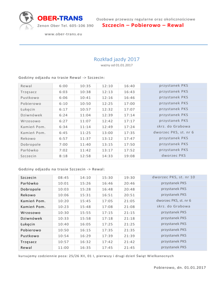 OBER-TRANS Zenon Ober Tel. 605-106 390 Osobowe przewozy regularne oraz okolicznościowe Szczecin – Pobierowo – Rewal www.ober-trans.eu Rozkład jazdy 2017 ważny od 01.01.2017 Godziny odjazdu na trasie Rewal -> Szczecin: Rewal 6:00 10:35 12:10 16:40 przystanek PKS Trzęsacz 6:03 10:38 12:13 16:43 przystanek PKS Pustkowo 6:06 10:41 12:16 16:46 przystanek PKS Pobierowo 6:10 10:50 12:25 17:00 przystanek PKS Łukęcin 6:17 10:57 12:32 17:07 przystanek PKS Dziwnówek 6:24 11:04 12:39 17:14 przystanek PKS Wrzosowo 6:27 11:07 12:42 17:17 przystanek PKS Kamień Pom. 6:34 11:14 12:49 17:24 skrz. do Grabowa Kamień Pom. 6:45 11:25 13:00 17:35 dworzec PKS, st. nr 6 Rekowo 6:57 11:37 13:12 17:47 przystanek PKS Dobropole 7:00 11:40 13:15 17:50 przystanek PKS Parłówko 7:02 11:42 13:17 17:52 przystanek PKS Szczecin 8:18 12:58 14:33 19:08 dworzec PKS Godziny odjazdu na trasie Szczecin -> Rewal: Szczecin 08:45 14:10 15:30 19:30 dworzec PKS, st. nr 10 Parłówko 10:01 15:26 16:46 20:46 przystanek PKS Dobropole 10:03 15:28 16:48 20:48 przystanek PKS Rekowo 10:06 15:31 16:51 20:51 przystanek PKS Kamień Pom. 10:20 15:45 17:05 21:05 dworzec PKS, st. nr 6 Kamień Pom. 10:23 15:48 17:08 21:08 skrz. do Grabowa Wrzosowo 10:30 15:55 17:15 21:15 przystanek PKS Dziwnówek 10:33 15:58 17:18 21:18 przystanek PKS Łukęcin 10:40 16:05 17:25 21:25 przystanek PKS Pobierowo 10:50 16:15 17:35 21:35 przystanek PKS Pustkowo 10:54 16:29 17:39 21:39 przystanek PKS Trzęsacz 10:57 16:32 17:42 21:42 przystanek PKS Rewal 11:00 16:35 17:45 21:45 przystanek PKS kursujemy codziennie poza: 25/26 XII, 01 I, pierwszy i drugi dzień Świąt Wielkanocnych Pobierowo, dn. 01.01.2017