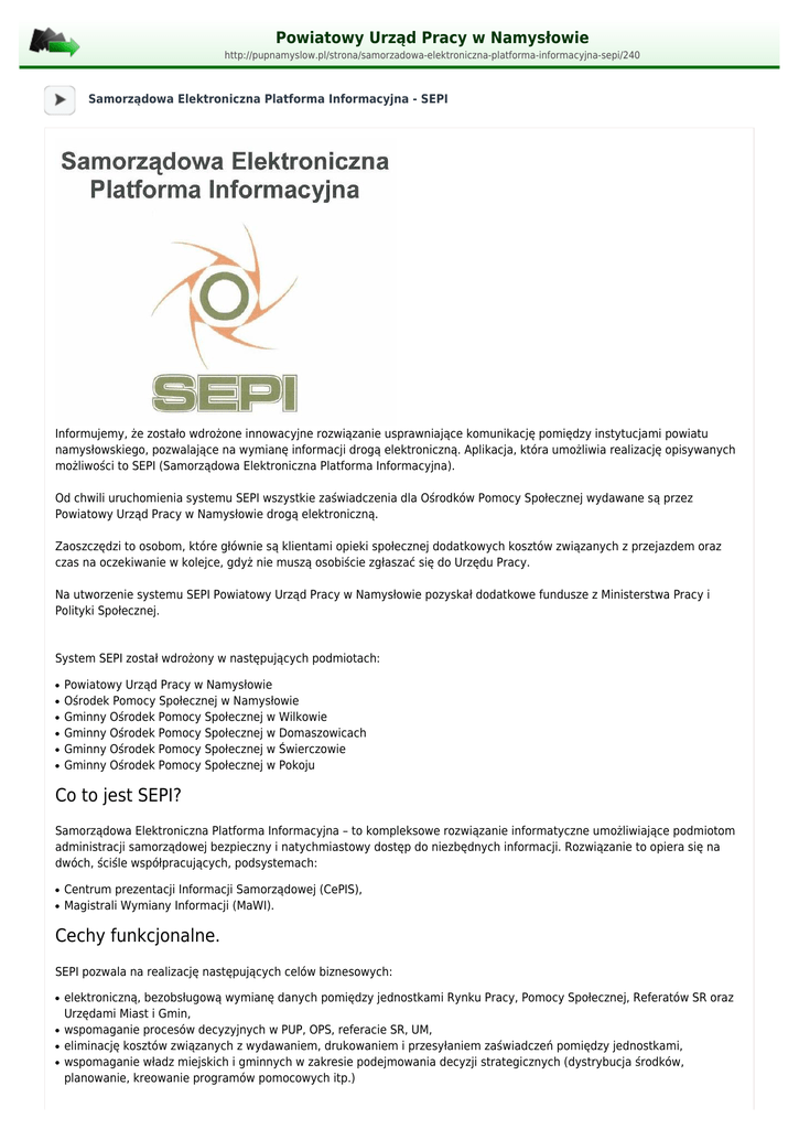 Powiatowy Urząd Pracy w Namysłowie http://pupnamyslow.pl/strona/samorzadowa-elektroniczna-platforma-informacyjna-sepi/240 Samorządowa Elektroniczna Platforma Informacyjna - SEPI Informujemy, że zostało wdrożone innowacyjne rozwiązanie usprawniające komunikację pomiędzy instytucjami powiatu namysłowskiego, pozwalające na wymianę informacji drogą elektroniczną. Aplikacja, która umożliwia realizację opisywanych możliwości to SEPI (Samorządowa Elektroniczna Platforma Informacyjna). Od chwili uruchomienia systemu SEPI wszystkie zaświadczenia dla Ośrodków Pomocy Społecznej wydawane są przez Powiatowy Urząd Pracy w Namysłowie drogą elektroniczną. Zaoszczędzi to osobom, które głównie są klientami opieki społecznej dodatkowych kosztów związanych z przejazdem oraz czas na oczekiwanie w kolejce, gdyż nie muszą osobiście zgłaszać się do Urzędu Pracy. Na utworzenie systemu SEPI Powiatowy Urząd Pracy w Namysłowie pozyskał dodatkowe fundusze z Ministerstwa Pracy i Polityki Społecznej. System SEPI został wdrożony w następujących podmiotach: ● ● ● ● ● ● Powiatowy Urząd Pracy w Namysłowie Ośrodek Pomocy Społecznej w Namysłowie Gminny Ośrodek Pomocy Społecznej w Wilkowie Gminny Ośrodek Pomocy Społecznej w Domaszowicach Gminny Ośrodek Pomocy Społecznej w Świerczowie Gminny Ośrodek Pomocy Społecznej w Pokoju Co to jest SEPI? Samorządowa Elektroniczna Platforma Informacyjna – to kompleksowe rozwiązanie informatyczne umożliwiające podmiotom administracji samorządowej bezpieczny i natychmiastowy dostęp do niezbędnych informacji. Rozwiązanie to opiera się na dwóch, ściśle współpracujących, podsystemach: ● ● Centrum prezentacji Informacji Samorządowej (CePIS), Magistrali Wymiany Informacji (MaWI). Cechy funkcjonalne. SEPI pozwala na realizację następujących celów biznesowych: ● ● ● ● elektroniczną, bezobsługową wymianę danych pomiędzy jednostkami Rynku Pracy, Pomocy Społecznej, Referatów SR oraz Urzędami Miast i Gmin, wspomaganie procesów decyzyjnych w PUP, OPS, referacie SR, UM, eliminację kosztów związanych z wydawaniem, drukowaniem i przesyłaniem zaświadczeń pomiędzy jednostkami, wspomaganie władz miejskich i gminnych w zakresie podejmowania decyzji strategicznych (dystrybucja środków, planowanie, kreowanie programów pomocowych itp.) Adres do strony internetowej Sygnity SEPI: http://www.public.sygnity.pl/publiczne-sluzby-zatrudnienia/sepi/osystemie