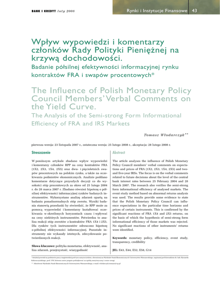 Rynki i Instytucje Finansowe 43 B a n k i Kr e dy t l u t y 2 0 0 8 Wpływ wypowiedzi i komentarzy członków Rady Polityki Pieni´˝nej na krzywà dochodowoÊci. Badanie półsilnej efektywnoÊci informacyjnej rynku kontraktów FRA i swapów procentowych* The Influence of Polish Monetary Policy Council Members’ Verbal Comments on the Yield Curve. The Analysis of the Semi-strong Form Informational Efficiency of FRA and IRS Markets Tomasz Włodarczyk * * pierwsza wersja: 23 listopada 2007 r., ostateczna wersja: 25 lutego 2008 r., akceptacja: 28 lutego 2008 r. Streszczenie Abstract W poniższym artykule zbadano wpływ wypowiedzi i komentarzy członków RPP na ceny kontraktów FRA (1X2, 2X3, 1X4, 2X5) oraz dwu- i pięcioletnich swapów procentowych na polskim rynku, a także na oczekiwania podmiotów ekonomicznych. Analizie poddano komentarze dotyczące przyszłych decyzji co do wysokości stóp procentowych za okres od 25 lutego 2004 r. do 28 marca 2007 r. Zbadano również hipotezę o półsilnej efektywności informacyjnej rynków badanych instrumentów. Wykorzystano analizę zdarzeń opartą na badaniu ponadnormalnych stóp zwrotu. Wyniki badania stanowią przesłanki by stwierdzić, że RPP może za pomocą wypowiedzi i komentarzy kształtować oczekiwania w określonych horyzontach czasu i wpływać na ceny niektórych instrumentów. Potwierdza to analiza reakcji stóp zwrotów z kontraktów FRA 1X4 i 2X5. Dla rynków tych instrumentów odrzucono hipotezę o półsilnej efektywności informacyjnej. Pozostałe instrumenty nie wykazały istotnych, zdecydowanie potwierdzonych reakcji. The article analyses the influence of Polish Monetary Policy Council members’ verbal comments on expectations and prices of FRA (1X2, 2X3, 1X4, 2X5) and twoand five-year IRSs. The focus is on the verbal comments related to future decisions about the level of the central bank interest rates between 25 February 2004 and 28 March 2007. The research also verifies the semi-strong form informational efficiency of analysed markets. The event study method based on abnormal returns analysis was used. The results provide some evidence to state that the Polish Monetary Policy Council can influence expectations in the particular time horizons and prices of certain instruments. This is confirmed by the significant reactions of FRA 1X4 and 2X5 returns, on the basis of which the hypothesis of semi-strong form informational efficiency of those markets was rejected. No significant reactions of other instruments’ returns were identified. Słowa kluczowe: polityka monetarna, efektywność, analiza zdarzeń, przejrzystość, wiarygodność Keywords: monetary policy, efficiency, event study, transparency, credibility JEL: E43, E44, E52, E58, G14 *Artykuł powstał na podstawie pracy magisterskiej pod tym samym tytułem, obronionej na Wydziale Nauk Ekonomicznych Uniwersytetu Warszawskiego, napisanej pod kierunkiem dr. hab. Ryszarda Kokoszczyńskiego, prof. UW, któremu autor pragnie podziękować za opiekę merytoryczną i cenne uwagi. ** Absolwent Wydziału Nauk Ekonomicznych Uniwersytetu Warszawskiego, e-mail: [email protected] 44 Financial Markets and Institutions 1. Wstęp Niniejsze badanie jest dwutorowe. Z jednej strony zbadano, czy wypowiedzi i komentarze członków RPP na temat przyszłych decyzji dotyczących stóp procentowych mogą wpłynąć na wybrane instrumenty reprezentujące krzywą dochodowości. Z drugiej strony − na podstawie analizy statystycznej istotności zanalizowanego wpływu − zbadano, czy rynki badanych instrumentów są efektywne półsilnie w sensie informacyjnym. Informacje oraz sposób ich przekazywania przez członków organów odpowiadających za politykę monetarną (władzy monetarnej) są niezmiernie ważne i bezpośrednio warunkują efektywność ich działań. Mogą być cennym uzupełnieniem tradycyjnych instrumentów polityki monetarnej. Ważkość przekazywanych informacji w dużej mierze zależy od przyjęcia przez banki centralne strategii bezpośredniego celu inflacyjnego. Wprowadzając ją, banki centralne zaczęły dążyć do udoskonalenia kanałów przekazywania informacji i − co jest bezpośrednio z tym związane − zwiększania przejrzystości polityki monetarnej. Wpływ na skuteczność działań władzy monetarnej istnieje dzięki możliwości kształtowania, poprzez przekazywanie informacji, oczekiwań uczestników rynku i cen aktywów. Możliwość ta zależy od „(…) zdolności jasnego przedstawiania i przekazywania swoich intencji przez osoby odpowiadające za politykę monetarną (…)” (Rozkrut et al. 2007, s. 189). Gdy osoby te wypracują odpowiedni sposób przekazywania informacji, organ prowadzący politykę monetarną będzie mógł, poprzez oczekiwania co do przyszłych stóp procentowych, kształtować krzywą dochodowości i jednocześnie oddziaływać na wysokość cen aktywów oraz stóp procentowych w długim horyzoncie, które wpływają na decyzje inwestycyjne i konsumpcję w sektorze prywatnym (Rozkrut et al. 2007, s. 177). Również Blinder (1998, s. 71) potwierdza zależność długoterminowych stóp procentowych i oczekiwań: „(..) reakcja długoterminowych stóp procentowych na wysokość stóp krótkoterminowych zależy w pełnej mierze od oczekiwań wysokości przyszłych krótkoterminowych stóp procentowych, na które duży wpływ mają przewidywania przyszłych działań banku centralnego”. Badając aspekty związane z informacjami i sposobem ich przekazywania przez władzę monetarną, na Efektywność informacyjna oznacza, że rynek zapewnia szybki i niezwłoczny przekaz informacji podmiotom rynkowym, które mają do nich jednakowy dostęp. Dzięki temu każda informacja będzie natychmiast uwzględniona w cenie aktywów. W rezultacie ceny odzwierciedlają prawdziwą i rzeczywistą wartość aktywów (Gurgul 2006; Czekaj et al. 2001). Malkiel (1992) precyzuje pojęcie efektywności, twierdząc, że rynek jest efektywny wzglę