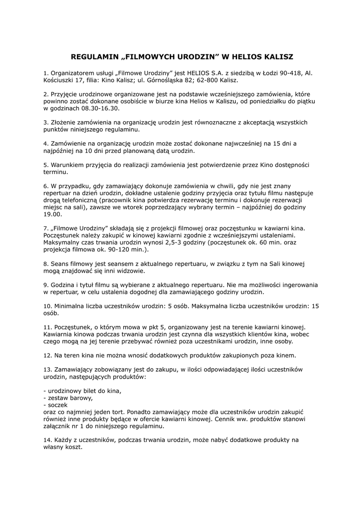 REGULAMIN „FILMOWYCH URODZIN” W HELIOS KALISZ 1. Organizatorem usługi „Filmowe Urodziny” jest HELIOS S.A. z siedzibą w Łodzi 90-418, Al. Kościuszki 17, filia: Kino Kalisz; ul. Górnośląska 82; 62-800 Kalisz. 2. Przyjęcie urodzinowe organizowane jest na podstawie wcześniejszego zamówienia, które powinno zostać dokonane osobiście w biurze kina Helios w Kaliszu, od poniedziałku do piątku w godzinach 08.30-16.30. 3. Złożenie zamówienia na organizację urodzin jest równoznaczne z akceptacją wszystkich punktów niniejszego regulaminu. 4. Zamówienie na organizację urodzin może zostać dokonane najwcześniej na 15 dni a najpóźniej na 10 dni przed planowaną datą urodzin. 5. Warunkiem przyjęcia do realizacji zamówienia jest potwierdzenie przez Kino dostępności terminu. 6. W przypadku, gdy zamawiający dokonuje zamówienia w chwili, gdy nie jest znany repertuar na dzień urodzin, dokładne ustalenie godziny przyjęcia oraz tytułu filmu następuje drogą telefoniczną (pracownik kina potwierdza rezerwację terminu i dokonuje rezerwacji miejsc na sali), zawsze we wtorek poprzedzający wybrany termin – najpóźniej do godziny 19.00. 7. „Filmowe Urodziny” składają się z projekcji filmowej oraz poczęstunku w kawiarni kina. Poczęstunek należy zakupić w kinowej kawiarni zgodnie z wcześniejszymi ustaleniami. Maksymalny czas trwania urodzin wynosi 2,5-3 godziny (poczęstunek ok. 60 min. oraz projekcja filmowa ok. 90-120 min.). 8. Seans filmowy jest seansem z aktualnego repertuaru, w związku z tym na Sali kinowej mogą znajdować się inni widzowie. 9. Godzina i tytuł filmu są wybierane z aktualnego repertuaru. Nie ma możliwości ingerowania w repertuar, w celu ustalenia dogodnej dla zamawiającego godziny urodzin. 10. Minimalna liczba uczestników urodzin: 5 osób. Maksymalna liczba uczestników urodzin: 15 osób. 11. Poczęstunek, o którym mowa w pkt 5, organizowany jest na terenie kawiarni kinowej. Kawiarnia kinowa podczas trwania urodzin jest czynna dla wszystkich klientów kina, wobec czego mogą na jej terenie przebywać również poza uczestnikami urodzin, inne osoby. 12. Na teren kina nie można wnosić dodatkowych produktów zakupionych poza kinem. 13. Zamawiający zobowiązany jest do zakupu, w ilości odpowiadającej ilości uczestników urodzin, następujących produktów: - urodzinowy bilet do kina, - zestaw barowy, - soczek oraz co najmniej jeden tort. Ponadto zamawiający może dla uczestników urodzin zakupić również inne produkty będące w ofercie kawiarni kinowej. Cennik ww. produktów stanowi załącznik nr 1 do niniejszego regulaminu. 14. Każdy z uczestników, podczas trwania urodzin, może nabyć dodatkowe produkty na własny koszt. 15. Przez cały czas trwania urodzin uczestnicy urodzin muszą pozostawać pod opieką jednej osoby pełnoletniej (opiekuna). Organizator nie sprawuje pieczy nad uczestnikami urodzin. Wyłączną odpowiedzialność za sprawowanie opieki nad uczestnikami urodzin ponosi opiekun. Opiekunowi przysługuje bezpłatny wstęp na seans w ramach imprezy urodzinowej. 16. Opłatę organizacyjną za tort urodzinowy należy uregulować w biurze kina najpóźniej na 5 dni przed planowaną datą urodzin. Pozostałą kwotę należności za organizację urodzin należy wpłacić Organizatorowi najpóźniej w dniu imprezy urodzinowej. W przypadku rezygnacji z tortu lub w przypadku odwołania imprezy w terminie późniejszym niż 5 dni przed imprezą, opłata za tort nie podlega zwrotowi. 17. Ze względu na brak szatni Organizator nie ponosi odpowiedzialności za rzeczy pozostawione przez uczestników urodzin. …………………………………………………… Data i podpis zamawiającego