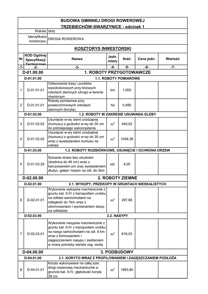 Waluta: złoty BUDOWA GMINNEJ DROGI ROWEROWEJ TRZEBIECHÓW-SWARZYNICE - odcinek 1 Identyfikator DROGA ROWEROWA kosztorysu: KOSZTORYS INWESTORSKI KOD Ogólnej Nr Specyfikacji Technicznej -1-2- D-01.00.00 D-01.01.00 1 D-01.01.01 2 D-01.01.01 D-01.02.00 3 D-01.02.02 4 D-01.02.02 D-01.03.00 5 D-01.03.25 D-02.00.00 D-02.01.00 6 D-02.01.01 D-02.03.00 7 D-02.03.01 D-04.00.00 D-04.01.00 8 D-04.01.01 Nazwa Jedn. miary Ilość Cena jedn. Wartość -3- -4- -5- -6- -7- 1. ROBOTY PRZYGOTOWAWCZE 1.1. ROBOTY POMIAROWE Odtworzenie trasy i punktów wysokościowych przy liniowych km 1,000 robotach ziemnych (drogi) w terenie równinnym Roboty pomiarowe przy powierzchniowych robotach ha 0,490 ziemnych (koryta) 1.2. ROBOTY W ZAKRESIE USUWANIA GLEBY Usunięcie w-wy ziemi urodzajnej (humusu) o grubości w-wy do 30 cm 440,02 m3 do późniejszego wykorzystania Usunięcie w-wy ziemi urodzajnej (humusu) o grubości w-wy do 30 cm 1048,36 m3 wraz z wywiezieniem humusu na odkład 1.3. ROBOTY ROZBIÓRKOWE, USUNIĘCIE I OCHRONA DRZEW Ścinanie drzew bez utrudnień (średnica do 46 cm) wraz z karczowaniem pni oraz wywiezieniem dłużyc, gałęzi i karpin na odl. do 2km szt. 4,00 2. ROBOTY ZIEMNE 2.1. WYKOPY, PRZEKOPY W GRUNTACH NIESKALISTYCH Wykonanie wykopów mechanicznie z gruntu kat. II-IV z transportem urobku na odkład samochodami na 297,68 m3 odległość do 1km wraz z uformowaniem i wyrównaniem skarp na odkładzie 2.2. NASYPY Wykonanie nasypów mechanicznie z gruntu kat. II-IV z transportem urobku na nasyp samochodami na odl. 6 km wraz z formowaniem i zagęszczeniem nasypu i zwilżeniem w miarę potrzeby warstw zag. wodą m3 616,03 3. PODBUDOWY 3.1. KORYTO WRAZ Z PROFILOWANIEM I ZAGĘSZCZANIEM PODŁOŻA Koryto wykonywane na całej szer. drogi rowerowej mechanicznie w 1963,80 m2 gruncie kat. II-IV, głębokość koryta 29 cm KOD Ogólnej Nr Specyfikacji Technicznej 9 D-04.01.01 10 D-04.01.02 D-04.04.00 11 D-04.04.02 D-04.05.00 12 D-04.05.01 D-04.07.00 13 D-04.06.01 D-05.00.00 D-05.03.00 14 D-05.03.05 15 D-05.03.23 D06.00.00 Jedn. miary Nazwa Ilość Cena jedn. Koryto wykonywane na całej szer. przejazdów przez drogę rowerową 32,00 m2 mechanicznie w gruncie kat. II-IV, głębokość koryta 36 cm Profilowanie i zagęszczenie podłoża pod w-twy konstrukcyjne nawierzchni 1995,80 m2 wykonane mechanicznie w gruncie kat. II-IV 3.2. PODBUDOWA Z KRUSZYW STABILIZOWANYCH MECHANICZNIE Wykonanie podbudowy z kruszywa łamanego - tłucznia kamiennego, warstwa dolna grubość warstwy po zagęszczeniu 15 cm m2 1963,80 3.3. PODBUDOWA Z KRUSZYW ULEPSZONYCH Wykonannie podbudowy z gruntu stabilizowanego cementem, przygotowywany w betoniarce w miejscu wbudowania Rm=2,5MPa, 1995,80 20,38 zł m2 pielęgnacja podbudowy przez posypanie piaskiem i polewanie wodą, grubość warstwy po zagęszczeniu 10cm 3.4. PODBUDOWA Z BETONU Wykonanie podbudowy z chudego betonu C8/10, pielęgnacja podbudowy przez posypanie paiskiem i polewanie wodą, grubość warstwy po zagęszczeniu 15cm m2 32,00 4. NAWIERZCHNIE 4.1. NAWIERZCHNIE ULEPSZONE Wykonanie warstwy ścieralnej z mieszanki mineralno-asfaltowej 1963,80 m2 grysowo-żwirowej, grubość warstwy po zagęszczeniu 4cm Wykonanie nawierzchni z kostki brukowej betonowej (szarej) o grubości 8 cm na podsypce 32,00 m2 cementowo - piaskowej, spoiny wypełnione piaskiem (kostka bezfazowa - ścieżka rowerowa) 5. ROBOTY WYKOŃCZENIOWE 5.1. PRZEPUSTY POD ZJAZDAMI I WZDŁUŻ ROWÓW Wykonanie przepustów rurowych pod 16 D06.02.01.03 zjazdem z rur stalowych średnicy do m 6,00 50cm D06.02.00 D-07.00.00 6. URZĄDZENIA BEZPIECZEŃSTWA RUCHU 6.1. OGRODZENIA DRÓG I URZĄDZENIA RUCHU Ustawienie poręczy ochronnych sztywnych z pochwytami i poręczami 17 D07.06.06.11 szt. 2,00 z rur stalowych oraz o rozstawie słupków co 1,0m D-07.01.00 6.2. OZNAKOWANIE POZIOME D07.06.00 Wartość 40 674,40 zł KOD Ogólnej Nr Specyfikacji Technicznej 18 D-07.01.01 D07.02.00 19 D07.02.01.01 20 D07.02.11.09 21 D07.02.11.09 22 D07.02.11.09 Nazwa Jedn. miary Ilość Oznakowanie poziome jezdni farbą akrylową białą odblaskową - strzałki i inne symbole - znak P-23 i P-11 m2 333,34 Cena jedn. 6.3. OZNAKOWANIE PIONOWE Ustawienie słupów z rur stalowych dla znaków drogowych wraz z szt. 7,00 wykopaniem i zasypaniem dołów z ubiciem warstwami Przymocowanie do gotowych słupków znaków zakazu typu A, folia szt. 3,00 odblaskowa II generacji Przymocowanie do gotowych słupków znaków typu C, folia szt. 4,00 odblaskowa II generacji Przymocowanie do gotowych słupków znaków typu D, folia szt. 2,00 odblaskowa II generacji D-08.00.00 7. ELEMENTY DRÓG I ULIC D-08.01.00 7.1. KRAWĘŻNIKI 23 D-08.01.02 D-08.03.00 24 25 D-08.01.10 D-08.03.01 D-09.00.00 Ustawienie krawężników betonowych o wymiarach 15x22cm wraz z wykonaniem ławy betonowej z oporem z betonu C12/15 (B-15) D-09.01.01 27 D-09.01.01 16,00 7.2. OBRZEŻA BETONOWE Wykonanie ławy betonowej z oporem 149,69 m3 z betonu C12/15 (B15) Ustawienie obrzeży betonowych o wymiarach 8x30cm na podsypce cementowo - piaskowej, spoiny wypełnione zaprawą cementową na wykonanej ławie betonowej z oporem m 1995,80 8. ZIELEŃ DROGOWA D-09.01.00 26 m 8.1. TRAWNIKI Wykonanie trawników siewem przy grubości warstwy ziemi urodzajnej (humusu) 15 cm z wykorzystaniem ziemi z odkładu (pobocze drogi rowerowej) Wykonanie trawników siewem przy grubości warstwy ziemi urodzajnej (humusu) 15 cm z wykorzystaniem ziemi z odkładu (tereny zielonej) m2 149,68 m2 1935,58 9. POMIARY POWYKONAWCZE 28 D-01.01.01 Geodezyjny pomiar powykonawczy ha 0,49 10. Karczowanie pni 29 30 Mechaniczne karczowanie pni –śr. 16-25 cm Wywóz pni do 3 km szt. mp 30 8 Wartość