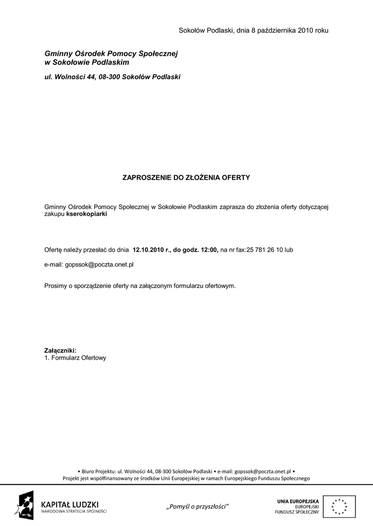 Sokołów Podlaski, dnia 8 października 2010 roku Gminny Ośrodek Pomocy Społecznej w Sokołowie Podlaskim ul. Wolności 44, 08-300 Sokołów Podlaski ZAPROSZENIE DO ZŁOŻENIA OFERTY Gminny Ośrodek Pomocy Społecznej w Sokołowie Podlaskim zaprasza do złożenia oferty dotyczącej zakupu kserokopiarki Ofertę należy przesłać do dnia 12.10.2010 r., do godz. 12:00, na nr fax:25 781 26 10 lub e-mail: [email protected] Prosimy o sporządzenie oferty na załączonym formularzu ofertowym. Załączniki: 1. Formularz Ofertowy • Biuro Projektu: ul. Wolności 44, 08-300 Sokołów Podlaski • e-mail: [email protected] • Projekt jest współfinansowany ze środków Unii Europejskiej w ramach Europejskiego Funduszu Społecznego „Pomyśl o przyszłości” Gminny Ośrodek Pomocy Społecznej w Sokołowie Podlaskim ul. Wolności 44, 08-300 Sokołów Podlaski Formularz Oferty Niniejsza oferta zostaje złożona przez: Lp. Nazwa Adres, nr fax, e-mail Ja (my) niżej podpisany(i) składam(y) niniejszą ofertę dotyczącą zakupu kserokopiarki Kserokopiarka musi byd fabrycznie nowa oraz zawierad komplet oryginalnych tonerów startowych. 1. Oferuję(my) dostawę kserokopiarki o za cenę: Cena (z podatkiem VAT): …………………………………………………… zł, w tym: podatek VAT …………………………, obliczony według stawki ..… %. wartość netto (bez podatku VAT) ………………………………….….… zł 2. Termin realizacji ………… dni od złożenia zamówienia. .………..................... dnia ...................... .........…………………………………….…………….. podpis osoby uprawnionej • Biuro Projektu: ul. Wolności 44, 08-300 Sokołów Podlaski • e-mail: [email protected] • Projekt jest współfinansowany ze środków Unii Europejskiej w ramach Europejskiego Funduszu Społecznego „Pomyśl o przyszłości”