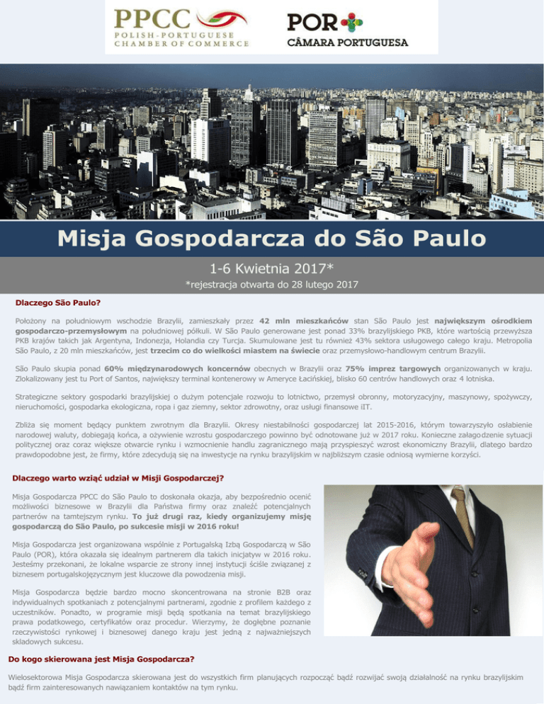 Misja Gospodarcza do São Paulo 1-6 Kwietnia 2017* *rejestracja otwarta do 28 lutego 2017 Dlaczego São Paulo? Położony na południowym wschodzie Brazylii, zamieszkały przez 42 mln mieszkańców stan São Paulo jest największym ośrodkiem gospodarczo-przemysłowym na południowej półkuli. W São Paulo generowane jest ponad 33% brazylijskiego PKB, które wartością przewyższa PKB krajów takich jak Argentyna, Indonezja, Holandia czy Turcja. Skumulowane jest tu również 43% sektora usługowego całego kraju. Metropolia São Paulo, z 20 mln mieszkańców, jest trzecim co do wielkości miastem na świecie oraz przemysłowo-handlowym centrum Brazylii. São Paulo skupia ponad 60% międzynarodowych koncernów obecnych w Brazylii oraz 75% imprez targowych organizowanych w kraju. Zlokalizowany jest tu Port of Santos, największy terminal kontenerowy w Ameryce Łacińskiej, blisko 60 centrów handlowych oraz 4 lotniska. Strategiczne sektory gospodarki brazylijskiej o dużym potencjale rozwoju to lotnictwo, przemysł obronny, motoryzacyjny, maszynowy, spożywczy, nieruchomości, gospodarka ekologiczna, ropa i gaz ziemny, sektor zdrowotny, oraz usługi finansowe iIT. Zbliża się moment będący punktem zwrotnym dla Brazylii. Okresy niestabilności gospodarczej lat 2015-2016, którym towarzyszyło osłabienie narodowej waluty, dobiegają końca, a ożywienie wzrostu gospodarczego powinno być odnotowane już w 2017 roku. Konieczne załago dzenie sytuacji politycznej oraz coraz większe otwarcie rynku i wzmocnienie handlu zagranicznego mają przyspieszyć wzrost ekonomiczny Brazylii, dlatego bardzo prawdopodobne jest, że firmy, które zdecydują się na inwestycje na rynku brazylijskim w najbliższym czasie odniosą wymierne korzyści. Dlaczego warto wziąć udział w Misji Gospodarczej? Misja Gospodarcza PPCC do São Paulo to doskonała okazja, aby bezpośrednio ocenić możliwości biznesowe w Brazylii dla Państwa firmy oraz znaleźć potencjalnych partnerów na tamtejszym rynku. To już drugi raz, kiedy organizujemy misję gospodarczą do São Paulo, po sukcesie misji w 2016 roku! Misja Gospodarcza jest organizowana wspólnie z Portugalską Izbą Gospodarczą w São Paulo (POR), która okazała się idealnym partnerem dla takich inicjatyw w 2016 roku. Jesteśmy przekonani, że lokalne wsparcie ze strony innej instytucji ściśle związanej z biznesem portugalskojęzycznym jest kluczowe dla powodzenia misji. Misja Gospodarcza będzie bardzo mocno skoncentrowana na stronie B2B oraz indywidualnych spotkaniach z potencjalnymi partnerami, zgodnie z profilem każdego z uczestników. Ponadto, w programie misji będą spotkania na temat brazylijskiego prawa podatkowego, certyfikatów oraz procedur. Wierzymy, że dogłębne poznanie rzeczywistości rynkowej i biznesowej danego kraju jest jedną z najważniejszych skladowych sukcesu. Do kogo skierowana jest Misja Gospodarcza? Wielosektorowa Misja Gospodarcza skierowana jest do wszystkich firm planujących rozpocząć bądź rozwijać swoją działalność na rynku brazylijskim bądź firm zainteresowanych nawiązaniem kontaktów na tym rynku. Jakie są cele Misji Gospodarczej? Celem Misji Gospodarczej jest zapoznanie uczestników z możliwościami biznesowymi rynku brazylijskiego oraz umożliwienie nawiązania kontaktów z ważnymi podmiotami sektora biznesowego: informacja na temat środowiska biznesowego Brazylii; spotkania B2B firmami oraz przedsiębiorcami w São Paulo, zgodnie z profilem każdego z uczestników; nawiązanie kontaktów z ważnymi partnerami lokalnymi; nawiązanie kontaktu z Portugalską Izbą Gospodarczą w Brazylii; nawiązanie kontaktów z lokalnymi instytucjami rządowymi, wspierającymi inwestycje zagraniczne w Brazylii; poznanie najważniejszych graczy na rynku, konkurencji oraz profilu konsumentów; nawiązanie kontaktów z przedstawicielami polskich firm na rynku brazylijskim; Agenda* Co zapewniamy? przelot w klasie ekonomicznej Warszawa/São Paulo/Warszawa; transfery lotnisko / hotel / lotnisko; pobyt w **** hotelu w São Paulo; ubezpieczenie podróżne; umówienie indywidualnych spotkań B2B z potencjalnymi partnerami biznesowymi i klientami; umówienie spotkań z lokalnymi instytucjami rządowymi; networking z lokalnym środowiskiem biznesowym oraz firmami portugalskimi; lokalne wsparcie przy spotkaniach B2B; wsparcie oraz obecność przedstawiciela PPCC podczas trwania misji; spersonalizowane wsparcie oraz follow-up. 1 kwietnia (sobota) 19:00 Wylot z Warszawy 2 kwietnia (niedziela) 04:55 przylot do São Paulo Czas wolny 18:00 briefing na temat poszczególnych spotkań B2B 19:30 kolacja we własnym zakresie 3 kwietnia (poniedziałek) 09:00-17:00 spotkania indywidualne uczestników misji zgodnie z profilem poszczególnych firm 17:00 spotkanie na temat prawa podatkowego, certyfikacji i procedur 19:00 kolacja z przedstawicielami lokalnej społeczności biznesowej 4 kwietnia (wtorek) 09:00-17:00 spotkania indywidualne uczestników misji zgodnie z profilem poszczególnych firm 19:00 kolacja we własnym zakresie 5 kwietnia (środa) 09:00-17:00 spotkania indywidualne uczestników misji zgodnie z profilem poszczególnych firm 19:00 kolacja we własnym zakresie 6 kwietnia (czwartek) 09:00-12:00 spotkania indywidualne uczestników misji zgodnie z profilem poszczególnych firm lub czas wolny 14:00 transfer na lotnisko 18:10 wylot do Warszawy 7 kwietnia (piątek) 14:00 przylot do Warszawy *agenda może ulec zmianom koniecznym aby uwzględnić indywidualne prośby uczestników misji bądź kwestie logistyczne związane ze spotkaniami B2B KOSZT UCZESTNICTWA Członek PPCC: 3.200€ + VAT Pozostałe firmy: 3.400€ + VAT Aby zgłosić firmę do udziału w misji, prosimy o wypełnienie formularza dostępnego pod tym linkiem do 28 lutego 2017 oraz o przesłanie prezentacji firmy w j. angielskim w formacie PDF lub PPT (max. 5 MB) do Pana Wojciecha Baczyńskiego, Sekretarza Generalnego PPCC, na adres: [email protected] Izba Gospodarcza
