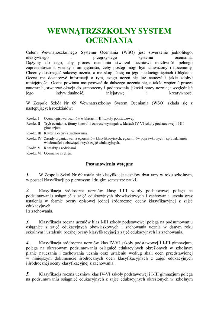 WEWNĄTRZSZKOLNY SYSTEM OCENIANIA Celem Wewnątrzszkolnego Systemu Oceniania (WSO) jest stworzenie jednolitego, efektywnego i przejrzystego systemu oceniania. Dążymy do tego, aby proces oceniania stwarzał uczniowi możliwość pełnego zaprezentowania wiedzy i umiejętności, żeby postęp mógł być zauważony i doceniony. Chcemy dostrzegać sukcesy ucznia, a nie skupiać się na jego niedociągnięciach i błędach. Ocena ma dostarczyć informacji o tym, czego uczeń się już nauczył i jakie zdobył umiejętności. Ocena powinna motywować do dalszego uczenia się, a także wspierać proces nauczania, stwarzać okazję do samooceny i podnoszenia jakości pracy ucznia; uwzględniać jego indywidualność, inicjatywę i kreatywność. W Zespole Szkół Nr 69 Wewnątrzszkolny System Oceniania (WSO) składa się z następujących rozdziałów: Rozdz. I Rozdz. II Rozdz. III Rozdz. IV Rozdz. V Rozdz. VI Ocena opisowa uczniów w klasach I-III szkoły podstawowej. Tryb oceniania, formy kontroli i zakresy wymagań w klasach IV-VI szkoły podstawowej i I-III gimnazjum. Kryteria oceny z zachowania. Zasady organizowania egzaminów klasyfikacyjnych, egzaminów poprawkowych i sprawdzianów wiadomości z obowiązkowych zajęć edukacyjnych. Kontakty z rodzicami. Ocenianie z religii. Postanowienia wstępne W Zespole Szkół Nr 69 ustala się klasyfikację uczniów dwa razy w roku szkolnym, w postaci klasyfikacji po pierwszym i drugim semestrze nauki. 1. Klasyfikacja śródroczna uczniów klasy I-III szkoły podstawowej polega na podsumowaniu osiągnięć z zajęć edukacyjnych obowiązkowych i zachowania ucznia oraz ustaleniu w formie oceny opisowej jednej śródrocznej oceny klasyfikacyjnej z zajęć edukacyjnych i z zachowania. 2. Klasyfikacja roczna uczniów klas I-III szkoły podstawowej polega na podsumowaniu osiągnięć z zajęć edukacyjnych obowiązkowych i zachowania ucznia w danym roku szkolnym i ustaleniu rocznej oceny klasyfikacyjnej z zajęć edukacyjnych i z zachowania. 3. Klasyfikacja śródroczna uczniów klas IV-VI szkoły podstawowej i I-III gimnazjum, polega na okresowym podsumowaniu osiągnięć edukacyjnych określonych w szkolnym planie nauczania i zachowania ucznia oraz ustaleniu według skali ocen przedstawionej w niniejszym dokumencie śródrocznych ocen klasyfikacyjnych z zajęć edukacyjnych i śródrocznej oceny klasyfikacyjnej z zachowania. 4. Klasyfikacja roczna uczniów klas IV-VI szkoły podstawowej i I-III gimnazjum polega na podsumowaniu osiągnięć edukacyjnych z zajęć edukacyjnych określonych w szkolnym 5. planie nauczania i zachowania ucznia w danym roku szkolnym oraz ustaleniu rocznych ocen klasyfikacyjnych z zajęć edukacyjnych i rocznej oceny klasyfikacyjnej z zachowania. Śródroczne i roczne oceny klasyfikacyjne z obowiązkowych i dodatkowych zajęć edukacyjnych ustala nauczyciel danych zajęć edukacyjnych. 6. Oceny klasyfikacyjne z dodatkowych zajęć edukacyjnych: religia i drugi język obcy w gimnazjum nie mają wpływu na promocję do klasy programowo wyższej ani na ukończenie szkoły. Ocenianie uczniów w gimnazjum z drugiego języka obcego odbywa się zgodnie z treściami zawartymi w rozdziale II niniejszego dokumentu. 7. Śródroczną i roczną ocenę z zachowania ustala wychowawca klasy po zasięgnięciu opinii nauczycieli i uczniów danej klasy oraz ocenianego ucznia. 8. Semestr pierwszy nauki trwa od 1 września do końca stycznia danego roku szkolnego, semestr drugi trwa od 1 lutego do dnia zakończenia zajęć edukacyjnych w danym roku szkolnym. Każdy semestr jest zakończony klasyfikacją wyników w nauce, które odnotowuje się odpowiednio: 9. w klasach I-VI szkoły podstawowej i I-III gimnazjum w dziennikach lekcyjnych (dotyczy pierwszego semestru), dodatkowo w klasach I-III szkoły podstawowej w postaci oceny opisowej za semestr pierwszy przechowywanej w arkuszach ocen jako załącznik, w klasach I-VI szkoły podstawowej i I-III gimnazjum w dziennikach lekcyjnych i w arkuszach ocen jako wynik klasyfikacji rocznej. Przy ustalaniu oceny z wychowania fizycznego, techniki, plastyki, muzyki należy w szczególności brać pod uwagę wysiłek wkładany przez ucznia w wywiązywaniu się z obowiązków wynikających ze specyfiki tych zajęć. 1. Dyrektor szkoły na pisemny wniosek rodziców (prawnych opiekunów) poprzedzony opinią lekarza o ograniczonych możliwościach uczestnictwa ucznia w zajęciach wychowania fizycznego lub informatyki, zwalnia ucznia z tych zajęć na czas określony w tej opinii. 2. W przypadku zwolnienia ucznia z zajęć określonych w punkcie 11 w dokumentacji przebiegu nauczania zamiast ocen klasyfikacyjnych wpisuje się „zwolniony”. 3. Dyrektor szkoły na pisemny wniosek podstawie opinii publicznej lub niepublicznej poradni specjalistycznej zwalnia ucznia z wadą nauki drugiego języka obcego. Zwolnienie edukacyjnego. 4. rodziców (prawnych opiekunów) oraz na poradni psychologiczno-pedagogicznej, lub słuchu lub z głęboką dysleksją rozwojową z może dotyczyć części lub całego cyklu W przypadku ucznia posiadającego orzeczenie do kształcenia specjalnego albo indywidualnego nauczania zwolnienie z nauki drugiego języka może nastąpić na podstawie tego orzeczenia. 5. Nauczyciel ma obowiązek na podstawie opinii publicznej lub niepublicznej poradni psychologiczno-pedagogicznej i poradni specjalistycznej dostosować wymagania edukacyjne do indywidualnych potrzeb psychofizycznych i edukacyjnych ucznia, u którego stwierdzono zaburzenia i odchylenia rozwojowe lub specyficzne trudności w uczeniu się. 6. Zgodnie z treściami zawartymi w „Regulaminie udzielania pomocy materialnej o charakterze motywacyjnym uczniom Zespołu Szkół z Oddziałami Integracyjnymi Nr 69” uczeń może otrzymać: a) stypendium za wyniki w nauce w szkole podstawowej po ukończeniu klasy IV oraz po każdym semestrze klasy V i VI, jeżeli średnia ocen jest co najmniej 5.0 i oceny nie są niższe od dobrych a zachowanie c