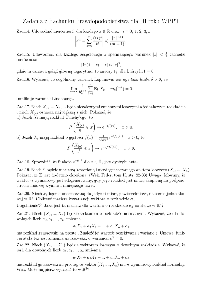 Zadania z Rachunku Prawdopodobieństwa dla III roku WPPT Zad.14. Udowodnić nierówność: dla każdego x ∈ R oraz m = 0, 1, 2, 3, ... ix e m X (ix)k |x|m+1 − . ¬ (m + 1)! k=0 k! Zad.15. Udowodnić: dla każdego zespolonego z spełniającego warunek |z| < nierówność | ln(1 + z) − z| ¬ |z|2 , 1 2 zachodzi gdzie ln oznacza gałąź główną logarytmu, to znaczy tę, dla której ln 1 = 0. Zad.16. Wykazać, że uogólniony warunek Lapunowa: istnieje taka liczba δ > 0, że n 1 X lim 2+δ E(|Xk − mk |2+δ ) = 0 n→∞ b n k=1 implikuje warunek Lindeberga. Zad.17. Niech X1 , ..., Xn , ... będą niezależnymi zmiennymi losowymi o jednakowym rozkładzie i niech X(n) oznacza największą z nich. Pokazać, że: a) Jeżeli Xi mają rozkład Cauchy’ego, to ! P X(n) ¬ x → e−1/(πx) , n b) Jeżeli Xi mają rozkład o gęstości f (x) = x > 0. √ 1 e−1//(2x) , 2πx3 √ X(n) − 2/(πx) ¬ x → e , n2 x > 0, to ! P −x Zad.18. Sprawdzić, że funkcja e−e x > 0. dla x ∈ R, jest dystrybuantą. Zad.19. Niech Σ będzie macierzą kowariancji niezdegenerowanego wektora losowego (X1 , ..., Xn ). Pokazać, że Σ jest dodatnio określona. (Wsk. Feller, tom II, str. 82-83) Uwaga: Mówimy, że wektor n-wymiarowy jest zdegenerowany, gdy jego rozkład jest miarą skupioną na podprzestrzeni liniowej wymiaru mniejszego niż n. Zad.20. Niech σ3 będzie unormowaną do jedynki miarą powierzchniową na sferze jednostkowej w R3 . Obliczyć macierz kowariancji wektora o rozkładzie σ3 . Uogólnienie♥: Jaka jest ta macierz dla wektora o rozkładzie σd na sferze w Rd ? Zad.21. Niech (X1 , ..., Xn ) będzie wektorem o rozkładzie normalnym. Wykazać, że dla dowolnych liczb a0 , a1 , ..., an zmienna a1 X1 + a2 X2 + ... + an Xn + a0 ma rozkład gaussowski na prostej. Znaleźć jej wartość oczekiwaną i wariancję. Umowa: funkcja stała też jest zmienną gaussowską, o wariancji σ 2 = 0. Zad.22. Niech (X1 , ..., Xn ) będzie wektorem losowym o dowolnym rozkładzie. Wykazać, że jeśli dla dowolnych liczb a0 , a1 , ..., an zmienna a1 X1 + a2 X2 + ... + an Xn + a0 ma rozkład gaussowski na prostej, to wektor (X1 , ..., Xn ) ma n-wymiarowy rozkład normalny. Wsk. Może najpierw wykazać to w R2 ?
