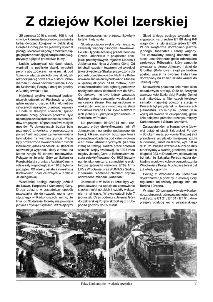 Z dziejów Kolei Izerskiej 25 czerwca 2010 r. mineło 108 lat od chwili, w której na lśniący wówczas świeżą farbą dworzec kolejowy w Szklarskiej Porębie Górnej, po raz pierwszy wjechał pociąg. Kolorowe wagony, z mozołem ciągnięte przez buchającą parą lokomotywę, przyszły oglądać prawdziwe tłumy. Ludzie wdrapywali się dach stacji, wspinali na pobliskie skałki, wypełnili perony aby zobaczyć i usłyszeć jak pod Szrenicę wtacza się kolorowy skład, jak rozpoczyna się nowa era w historii Schreiberhau. Budowa odcinka z Jeleniej Góry do Szklarskiej Poręby i dalej do granicy z Austrią, trwała 14 lat. Najwięcej wysiłku kosztował budowniczych odcinek od Piechowic w górę, gdzie musiano usypać kilka kilometrów sztucznych nasypów, przebijać wąwozy i tunele w skalnych ścianach, spinać mostami brzegi górskich potoków. Było to potężne dzieło budowlane: 30 przejazdów drogowych, 60 przepustów i małych mostów. W Jakuszycach trzeba było przekopać torfowiska, przemieszczono ponad 1 mln m3 ziemi, zanim tory można było ułożyć na twardym gruncie. Prace były prowadzone równocześnie z dwóch kierunków, jednak na odcinku austriackim spowolnił je wypadek, kiedy z mostu na Izerze runęła 89 tonowa mostownica. Połączenie Jeleniej Góry ze Szklarską Porębą i dalej z granicą z Austrią (Czechy odzyskały niepodległość w 1918) było na początku XX wieku, ostatnią inwestycją Królewskich Kolei Żelaznych w Kotlinie Jeleniogórskiej. Wcześniej pociągi zaczęły jeździć do Kowar, Karpacza i Kamiennej Góry. Droga żelazna w zasadniczy sposób przyczyniła się do rozwoju ruchu turystycznego w Karkonoszach, mimo, że linia do Szklarskiej Poręby nie powstała jedynie z myślą o turystach. Ważniejszymi klientami ówczesnych przewoźników były tartaki i huty szkła. Składy pociągów zwykle były mieszane, zawierały wagony osobowe i towarowe. Po kilku tygodniach linię przedłużono do Czech. Umożliwiło to połączenie kolejowe przemysłowych rejonów Liberca i Jablonca nad Nysą z Jelenią Górą. Od tej chwili częstym towarem był wysokiej jakości węgiel ze Śląska, przywożony dla potrzeb przedsiębiorców. Na linii z Kořenowa do Tanwaldu wybudowano 4 tunele o łącznej długości 1413 metrów, oraz założono odcinek kolei zębatej, ponieważ nachylenie stoku dochodzi tam do 58%. Co ciekawe, nie było jednak wówczas dużego zainteresowania wycieczkami na czeską stronę. Pociągi osobowe w większości kończyły swój bieg na stacji Szklarska Poręba Huta. Tylko niektóre z nich jechały ku przejściu granicznemu z Czechami w Polaun. Na przełomie 1913/1914 roku rozpoczęto próby elektryfikowania linii. W Jakuszycach na próbę podłączono do trakcji kilkaset metrów bocznego toru i prowadzono badania pod kątem wpływu warunków atmosferycznych (izerska zima) na trakcję. Dalsze prace przerwał wybuch I wojny światowej. W 1923 trasa między Jelenią Góra, a Kořenowem została zelektryfikowana. Od 1927 jeździły na niej ekonomiczne, samodzielne elektryczne jednostki silnikowe ET89 firmy LHV z Wrocławia, oraz WUMAG z Görlitz, z silnikami Siemens-Schuckert, szybko ochrzczone mianem „Rübezahl”. Jednostki te w ilości 11 sztuk były wyprodukowane na specjalne zamówienie śląskich kolei górskich i jeździły wyłącznie na tej trasie. W eksploatacji było 7 jednostek. Czas podróży z Jeleniej Góry do Szklarskiej Poręby skrócił się z grubo ponad godziny do 55 minut. Fakty Karkonoskie - wydanie specjalne Skład takiego pociągu wyglądał następująco: na przedzie ET 89 dalej 6-8 wagonów i z tyłu jeszcze jeden ET 89. W dni świąteczne doczepiano jeszcze jednego Rübezahla i cztery wagony. Tak zestawiony pociąg dojeżdżał do stacji Josephinehute gdzie odczepiano czołowego Rübezahla, który samotnie wyruszał w stronę Jakuszyc i dalej do Grunthal (Kořenowa), skąd po krótkim postoju wracał na dworzec Huta i tam doczepiony na koniec składu wracał do Jeleniej Góry. Malowniczo położona linia miała kilka dodatkowych atrakcji. Otóż na szczycie wąwozu koło Szklarskiej Poręby Dolnej stał najwyższy w Niemczech kolejowy semafor, najwyżej położoną stacją w Prusach był przystanek w Jakuszycach (Jakobstal), 885 m n.p.m., (ponad 30 m wyżej od dworca w Zakopanem), gdzie linia kolejowa przecina przełęcz między Karkonoszami i Górami Izerskimi. Za przystankiem w Harrachowie (dawniej ostatniej stacji Szklarskiej Poręby – Strickerhauser, po wojnie Tkacze) stoi prawdziwe arcydzieło kolejowej sztuki budowlanej, most na Izerze, wys. 28 m dł.110m. Wielkie wrażenie budzi do dziś tunel wykuty w twardej granitowej skale o długości 923 m Dodatkową ciekawostką był fakt, że Szklarka Poręba leżała dokładnie w połowie kolejowego połączenia Wrocławia z Pragą. Ruch pasażerski był już wtedy ogromny. Pociąg z Wrocławia do Kořenowa dojeżdżał w 3,5 godziny. Z Jeleniej Góry regularnie odjeżdżały pociągi min. do Berlina i Drezna. W latach 30-tych pojawiły się w Karkonoszach na wskroś nowoczesne jednostki elektryczne ET 21, ET 31 i ET 51, które przejęły obsługę ruchu pasażerskiego 3 na liniach śląskiej kolei górskiej, w tym także do Szklarskiej Poręby. Jednak na trudnej trasie Izerskiej do 1945 dalej jeździły Rübezahle. Zabójcze dla tej przepięknie położonej linii okazały się grabieże władzy radzieckiej. W porozumieniu zawartym 8 lipca 1945 w Moskwie, między PKWN, a rządem sowieckim, w ramach reparacji wojennych wycięto całą sieć trakcyjną na liniach wychodzących z Jeleniej Góry, z wyjątkiem wyżej położonych odcinków na trasie do Kořenowa, a elektryczne wozy Rübezahl wraz z całym pozostałym na stacjach elektrycznym taborem, wywieziono najpierw do Lubania a potem gdzieś za Ural. Z wyjątkiem jednego ET 89, który przed zakończeniem wojny uległ wypadkowi. Niestety do czasów dzisiejszych nie zachował sie żaden egzemplarz ET 89. Reel