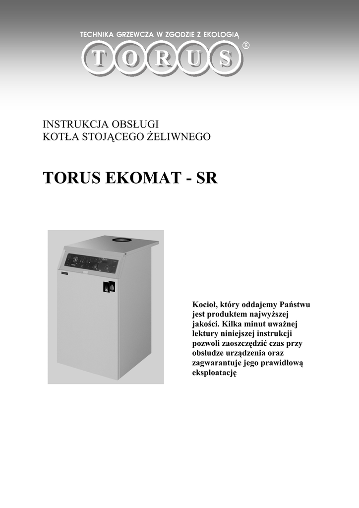 INSTRUKCJA OBSŁUGI KOTŁA STOJĄCEGO ŻELIWNEGO TORUS EKOMAT - SR Kocioł, który oddajemy Państwu jest produktem najwyższej jakości. Kilka minut uważnej lektury niniejszej instrukcji pozwoli zaoszczędzić czas przy obsłudze urządzenia oraz zagwarantuje jego prawidłową eksploatację I. Przeznaczenie, opis budowy Kotły typu Ekomat-SR są gazowymi kotłami stojącymi wyposażonymi w palnik atmosferyczny przystosowany do spalania wszystkich rodzajów gazu ziemnego. Blok kotła wykonany jest z żeliwa odpornego na korozję. Urządzenie przystosowane jest do pracy bez zasilania zewnętrznego w energię elektryczną. Może współpracować zarówno z instalacjami grawitacyjnymi jak i z instalacjami pompowymi. Automatyka kotła oparta jest na zaworze gazowym firmy Honeywell współpracującym z palnikiem pilotowym. W skład automatyki wchodzi ponadto zabezpieczenie przeciw wypływowi nie spalonego gazu w postaci termopary dyżurnej oraz odrębny "„stos termopar” stanowiący źródło energii do sterowania zaworem gazowym. Kocioł wyposażony jest ponadto w ogranicznik temperatury wody kotłowej, termostat regulacyjny temperatury wody kotłowej, termomanometr oraz odpowietrznik automatyczny. Blok kotła izolowany jest wełną mineralną. Obudowa kotła wykonana jest z blachy stalowej malowanej proszkowo na kolor biały. Kotły typu Ekomat-SR stanowią źródło ciepła dla technologicznego podgrzewu gazu na stacjach redukcyjnych, szczególnie w obiektach bez zewnętrznego zasilania elektrycznego. UWAGA !!! Kotły typu Ekomat-SR mogą być instalowane wyłącznie w pomieszczeniach oddzielonych od pomieszczeń mieszkalnych, z wentylacją wyprowadzoną bezpośrednio na zewnątrz obiektu. Dane techniczne kotłów typ Ekomat SR – wersja dla stacji redukcyjnych gazu TABELA 1 Moc kotła Ilość członów Gabaryty kotła: - głębokość - szerokość - wysokość Masa kotła suchego Pojemność wodna kotła Maksymalne ciśnienie wody Zakres regulacji temperatury wody na zasilaniu Przyłącza kotła: - zasilanie i powrót - spust - doprowadzenie gazu Sprawność Max. zużycie gazu (1) - gaz GZ35 - gaz GZ41.5 - gaz GZ50 Temperatura spalin Minimalny ciąg kominowy Króciec spalin Typ zaworu gazowego Ilość dysz w palniku Ciśnienie gazu na dyszach (mbar) Średnica dysz - gaz GZ 35 - gaz GZ 41,5 - gaz GZ 50 (1) – wartość opałowa gazu: kW szt. 16 3 25 4 32 5 42 6 50 7 mm mm mm kg dm3 660 512 940 85 9,0 660 512 940 103 11,5 660 608 940 120 14,0 660 752 940 157 16,5 660 752 940 197 19,0 bar 3 3 3 3 3 °C 35÷85 35÷85 35÷85 35÷85 35÷85 G G G % 11/4” 3/8” ¾” 11/4” 3/8” ¾” 11/2” 3/8” ¾” 90 11/2” 3/8” ¾” 11/2” 3/8” ¾” um3/h um3/h um3/h °C Pa mm 2,5 2,1 1,8 120 3,0 130 3,9 3,3 2,8 120 3,0 130 7,8 6,7 5,6 120 4,0 150 GZ-35 GZ-50 2 8,5 14,0 5,0 6,5 4,3 5,6 3,6 4,7 120 120 3,0 3,5 130 150 VS8820C1009B 3 4 5 9,5 8,0 8,7 15,0 15,0 15,5 mm mm mm 3,40 (340) 2,40 (240) 2,40 (240) GZ-35 – 25,8 MJ/um3 GZ-41,5 – 29,8 MJ/um3 GZ-50 – 35,9 MJ/um3 wg. BN-88/0543-15 6 8,5 15,5 Gabaryty kotłów typu Ekomat SR – wersja dla stacji redukcyjnych gazu Oznaczenia: A – szerokość, B – głębokość, D – króciec spalin, G – gaz, Moc kotła A AD AG AP=AZ B BD H HG HP HZ ØD ØP ØZ ØG H – wysokość, P (c.o.) – powrót c.o., Z (c.o.) – zasilanie c.o., kW 16 25 32 42 50 mm mm mm mm mm mm mm mm mm mm mm cal cal cal 512 253 78 86 660 127 940 355 285 645 130 11/4” 11/4” ¾” 512 253 42 45 660 127 940 355 285 645 130 11/4” 11/4” ¾” 608 300 46 55 660 127 940 355 285 645 130 11/2” 11/2” ¾” 752 372 76 85 660 127 940 355 285 645 150 11/2” 11/2” ¾” 752 372 34 43 660 127 940 355 285 645 150 11/2” 11/2” ¾” II. Uruchamianie kotła Odpowietrzyć instalację gazową Sprawdzić szczelność instalacji gazowej Otworzyć zawór doprowadzający gaz Termostat wody kotłowej ustawić w pozycji minimum. Wcisnąć do oporu biały przycisk na zaworze gazowym, rys. nr 1 poz.1 następuje w tym momencie otwarcie dolotu gazu do palnika pilotowego 6. Przytrzymując biały przycisk w pozycji wciśniętej nacisnąć przycisk piezozapalarki, rys. nr 1 poz 2 następuje zapłon gazu na palniku pilotowym. W przypadku braku zapłonu powtórnie nacisnąć przycisk piezozapalarki. 7. Przytrzymać biały przycisk przez okres około 20 sekund od momentu zapłonu. 8. Zwolnić biały przycisk na zaworze gazowym, gaz pali się na palniku pilotowym. W przypadku zgaśnięcia płomienia powtórzyć procedurę. 9. Na termostacie wody kotłowej ustawić żądaną temperaturę. Jeśli temperatura wody kotłowej jest niższa od nastawy na termostacie następuje otwarcie zaworu gazowego i zapłon na palniku głównym. 10. Odcięcie dopływu gazu do palnika głównego i palnika pilotowego następuje po naciśnięciu czerwonego przycisku na zaworze gazowym, rys. nr 1 poz 3. Powtórne zapalenie palnika pilotowego jest możliwe po czasie ok. 1 minuty. 11. W przypadku zadziałania ogranicznika temperatury wody kotłowej ( na skutek przekroczenia temperatury dopuszczalnej) należy odczekać aż temperatura wody kotłowej obniży się do poziomu około 800C a następnie zresetować ogranicznik, rys. nr 3 poz. 2. 1. 2. 3. 4. 5. Rys.1 Zawór gazowy typ VS8820C1009B rozmieszczenie elementów regulacyjnych II. Rys.2 Prawidłowa wielkość płomienia płomienia na palniku pilotowym Regulacja kotła 1. Regulacja palnika pilotowego Ustawić ciśnienie gazu na palniku pilotowym za pomocą wkrętu regulacyjnego rys. nr 1 poz. 4. Wielkość ciśnienia należy ustawić tak aby płomień na palniku pilotowym wyglądał tak jak na rys. nr 2. 2. Regulacja mocy kotła Ustawić ciśnienie gazu na dyszach palników głównych wykorzystując do tego wkręt regulacyjny, rys. nr 1 poz. 5. Wkręt jest dostępny po odkręceniu wkrętakiem aluminiowej ochronnej pokrywki. W czasie regulacji, ciśnienie gazu na dyszach palników głównych kontrolować za pomocą U-rurki podłączonej do króćca pomi